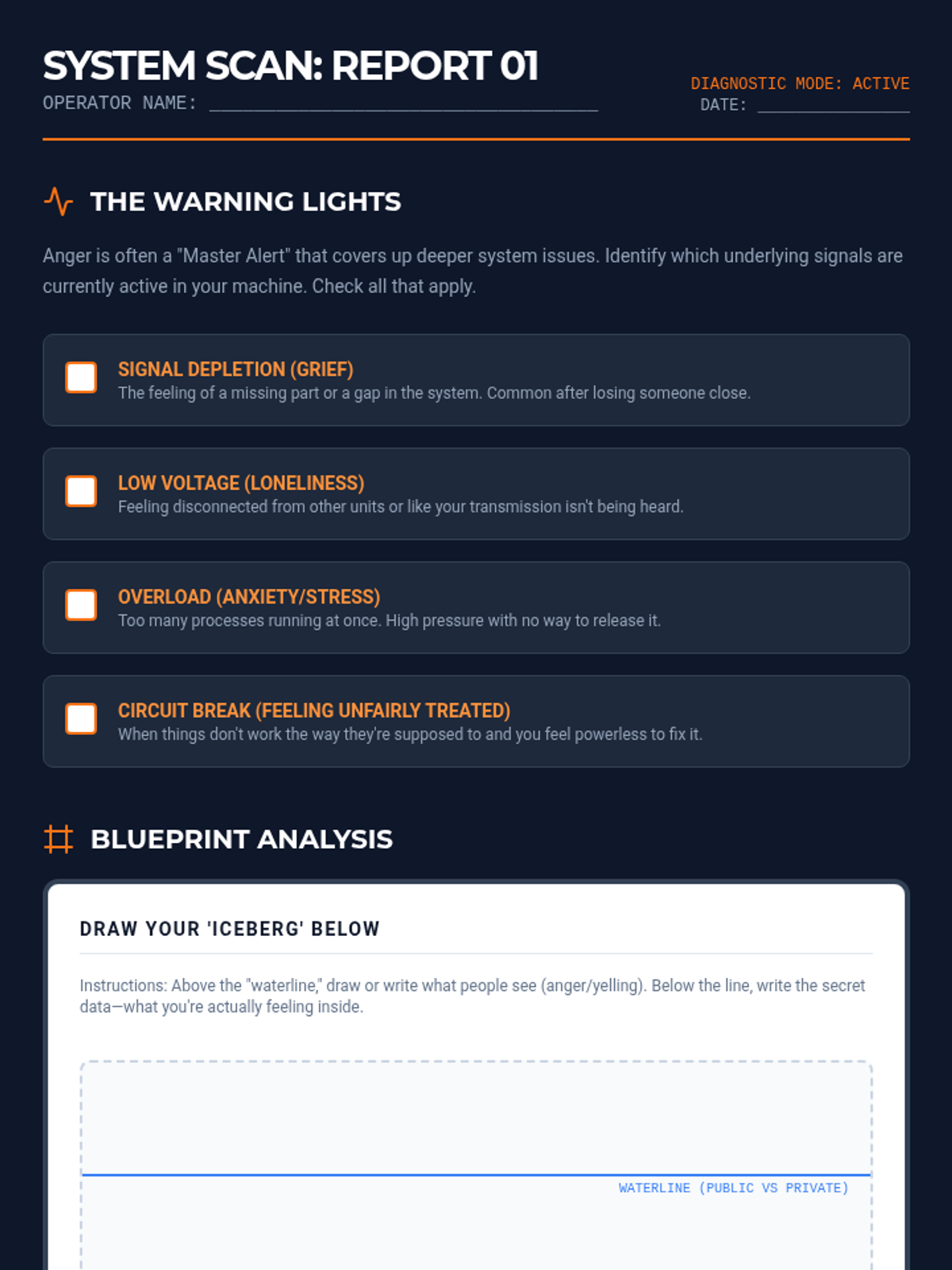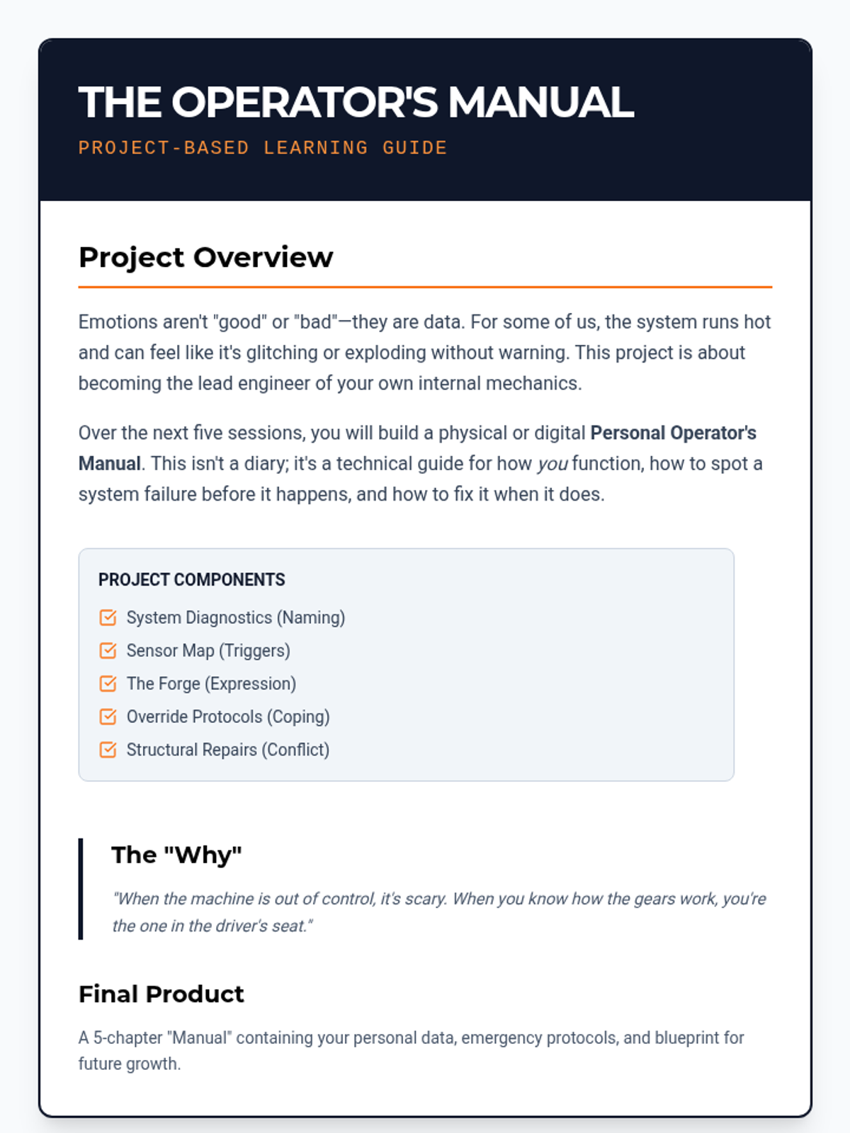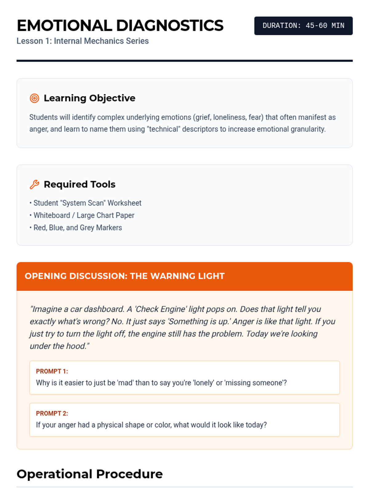 A 5-lesson series designed for middle school boys to explore emotional regulation, grief processing, and anger management through the metaphor of "Internal Mechanics." Students build a personal "Operator's Manual" to understand their triggers, name their emotions, and implement practical coping strategies.
