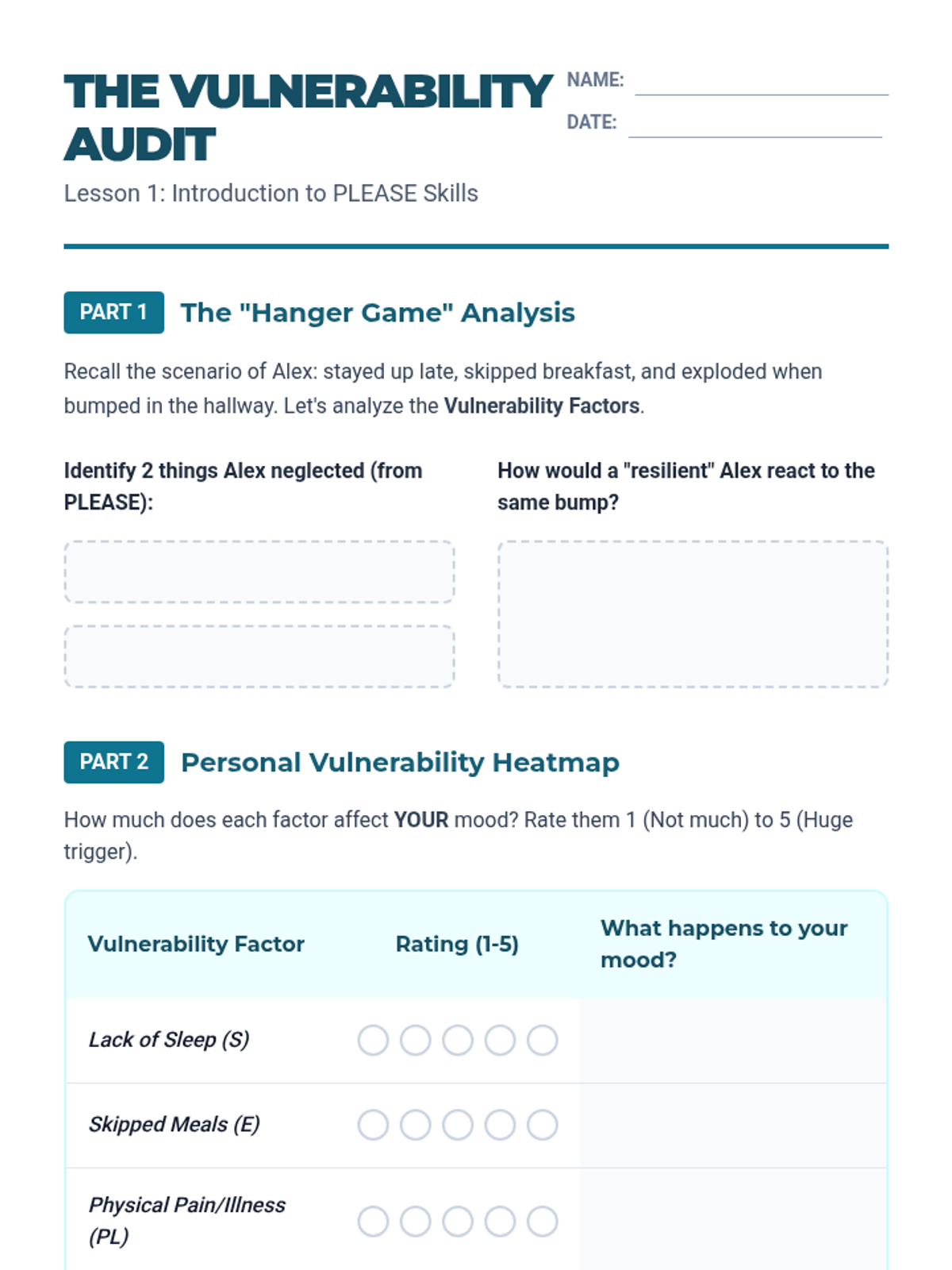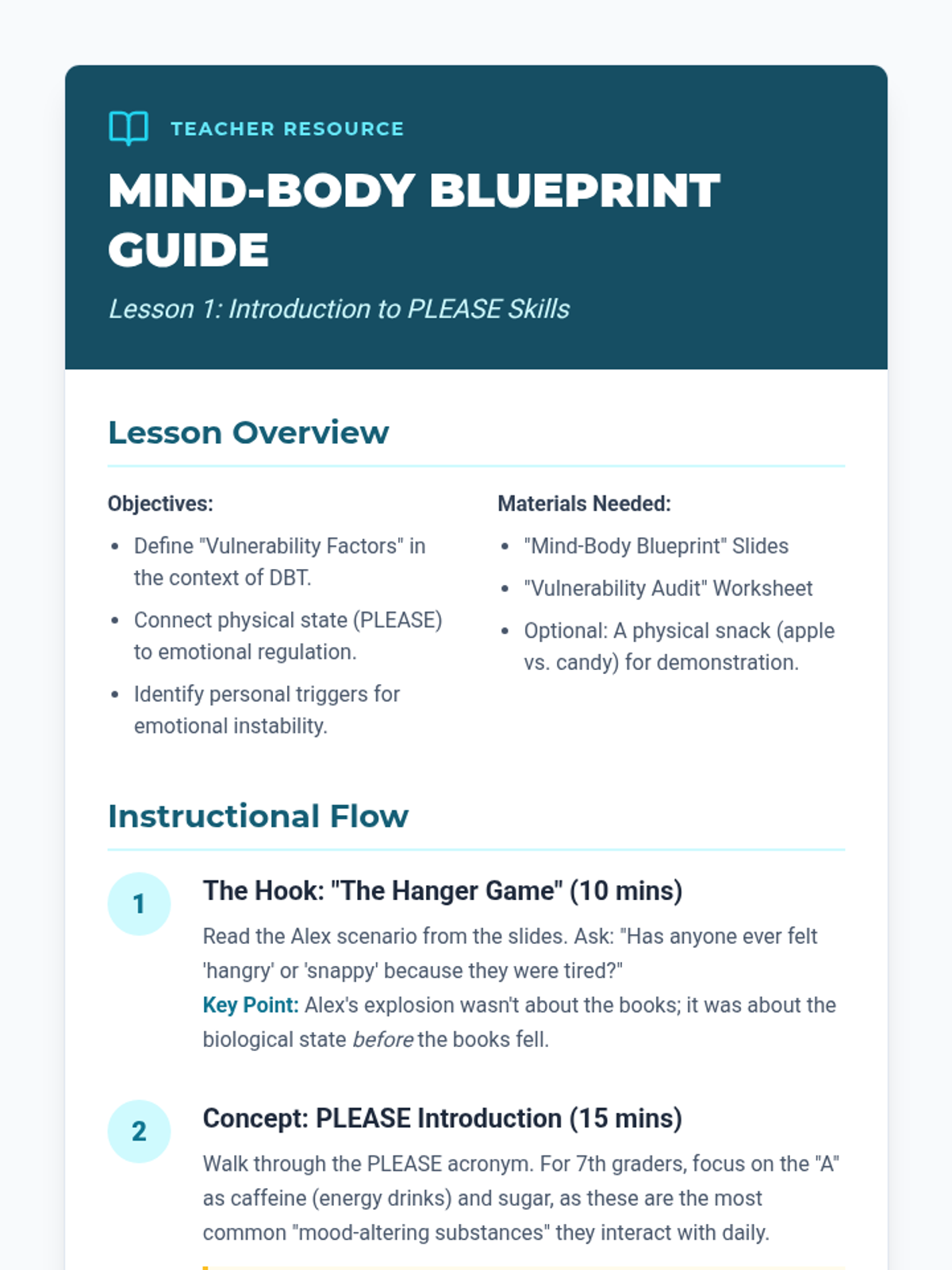 A comprehensive 5-lesson sequence for 7th graders on the DBT PLEASE skills, focusing on the connection between physical health and emotional regulation to reduce vulnerability to stress and intense emotions.