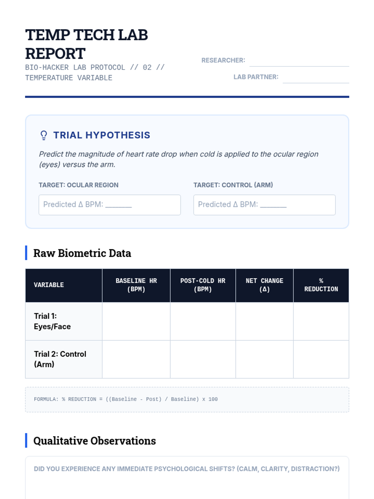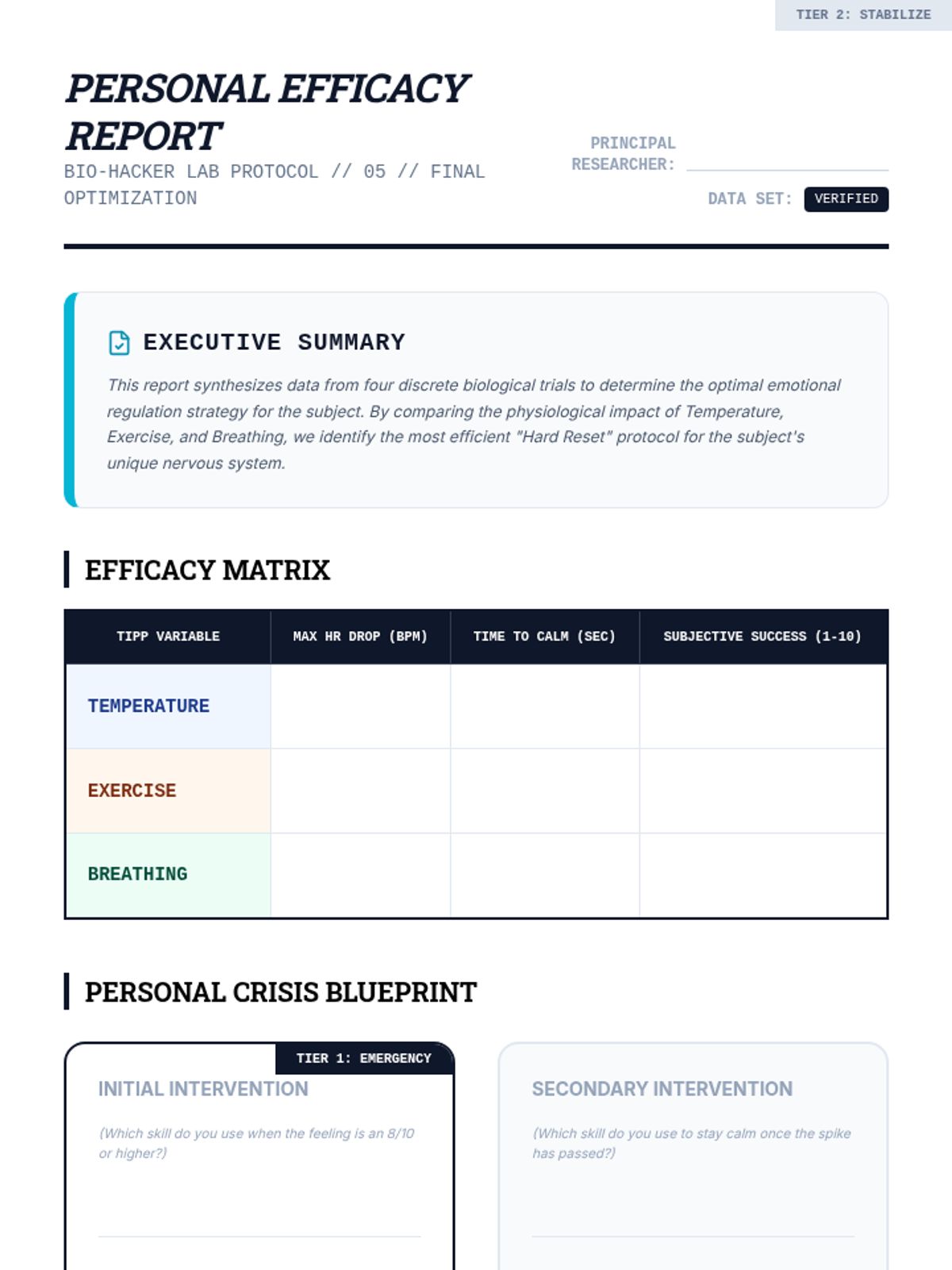 A 12th-grade counseling sequence that treats TIPP (Temperature, Intense Exercise, Paced Breathing, Paired Muscle Relaxation) as a series of biological experiments. Students act as researchers using biometric data to validate emotional regulation strategies.