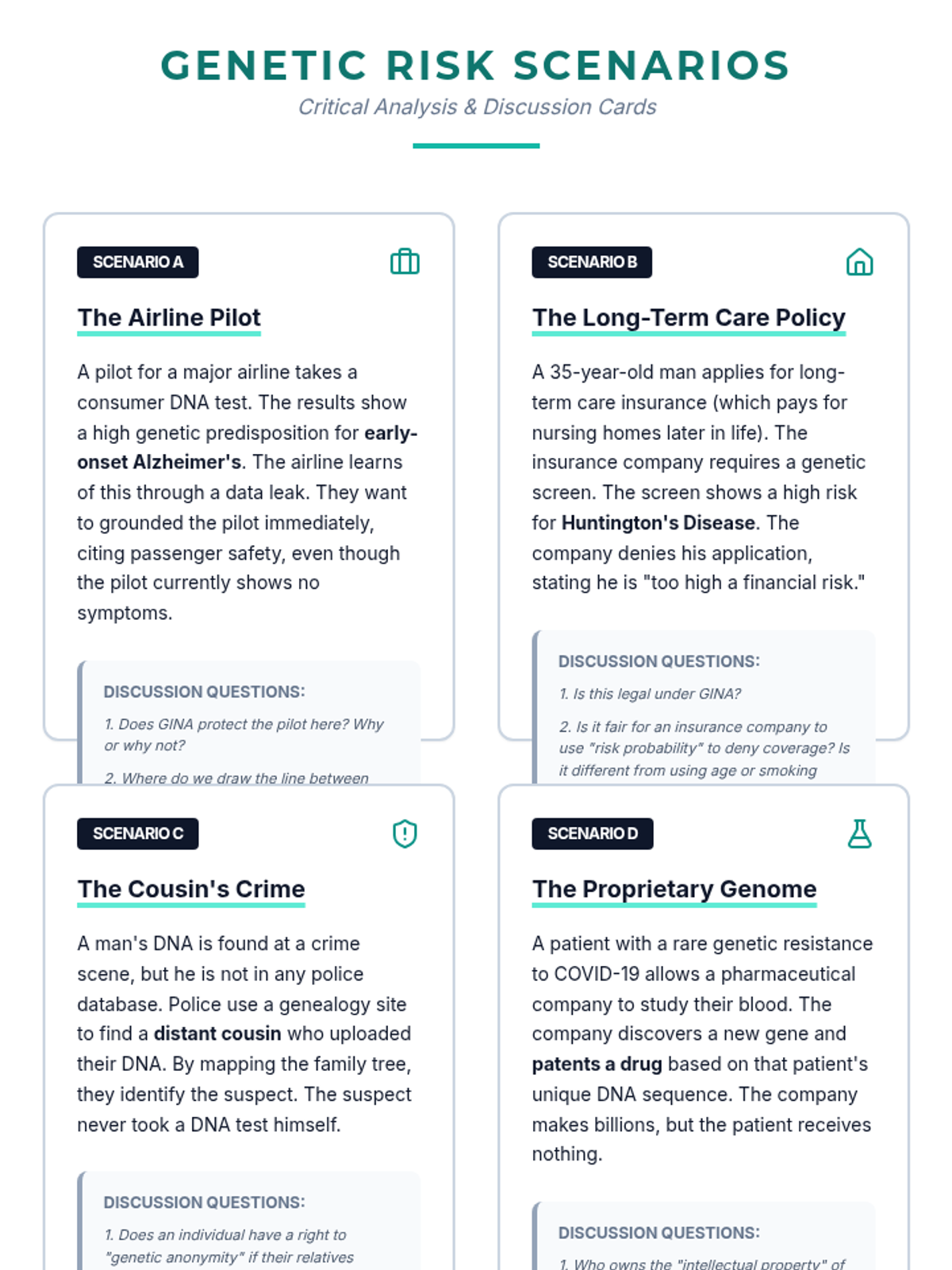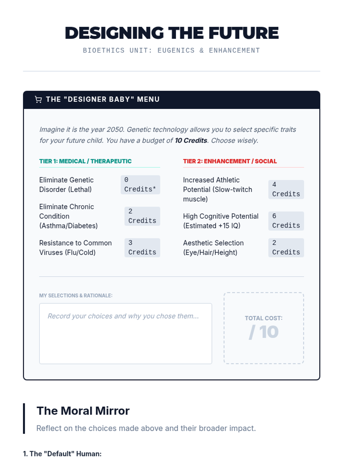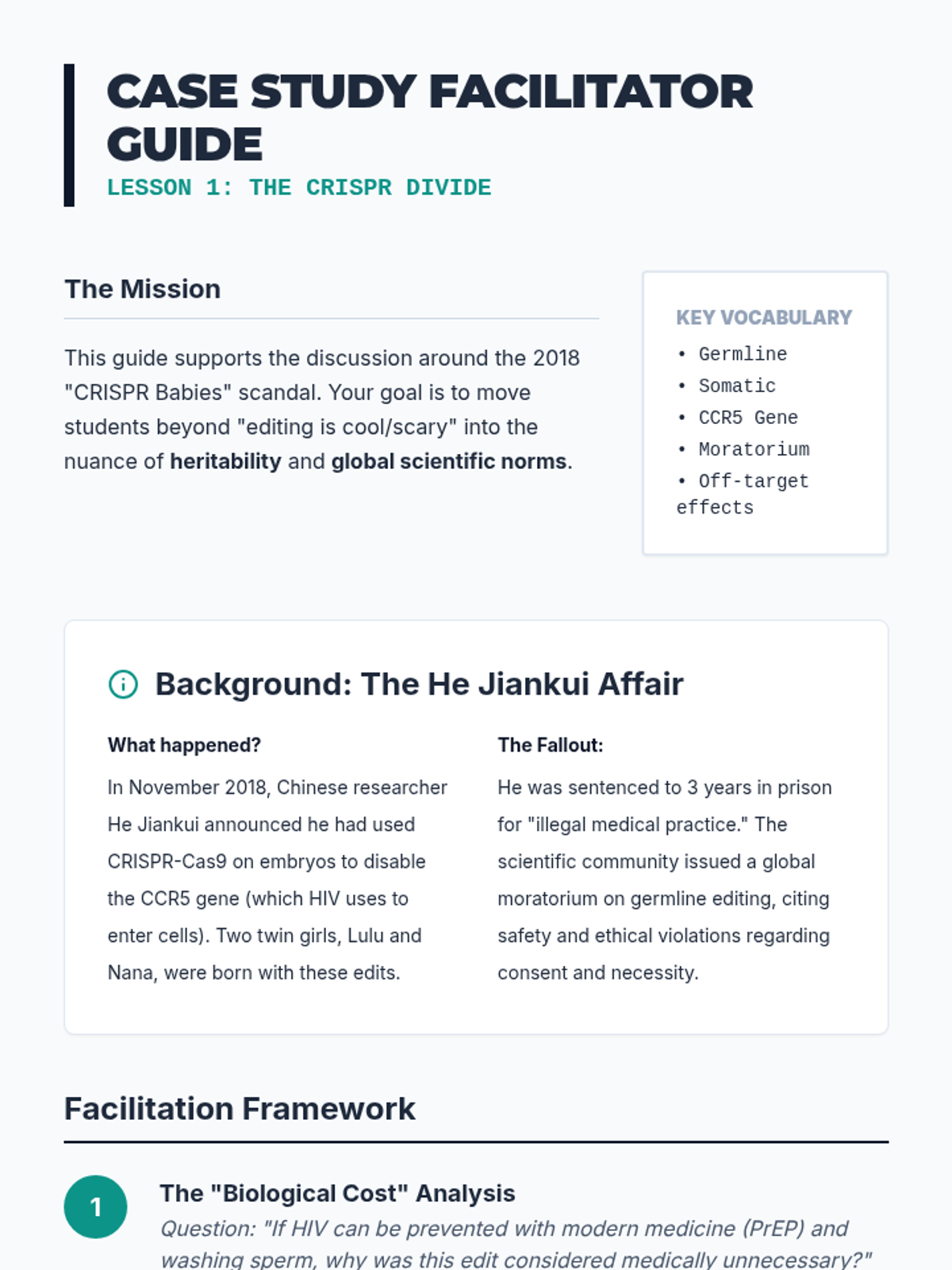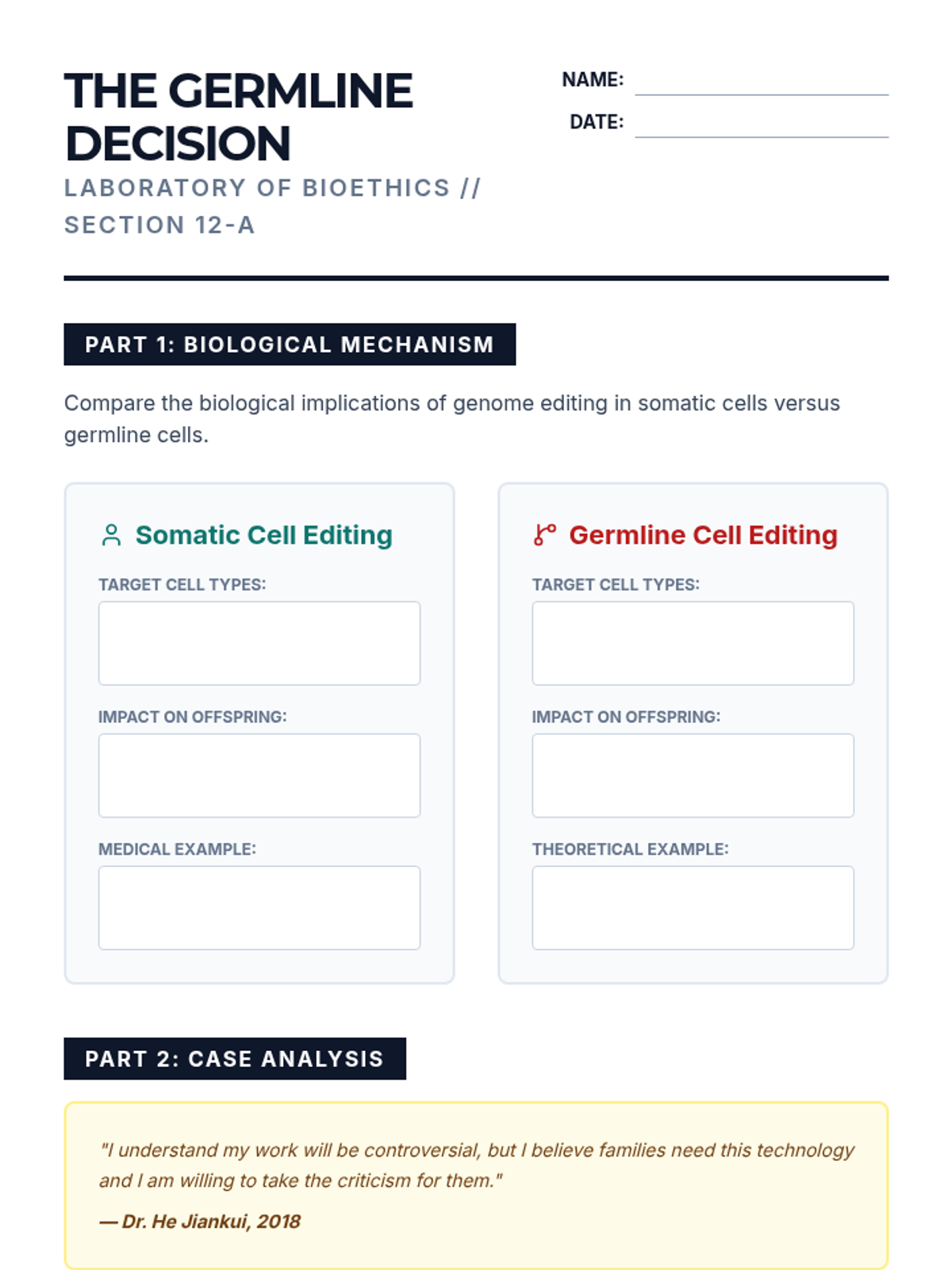 This high-school biology and bioethics sequence explores the scientific mechanisms and moral dilemmas of genome editing. Students progress from understanding the basic distinction between somatic and germline editing to evaluating genetic privacy, historical eugenics, agricultural GMOs, and finally proposing their own genetic policies.
