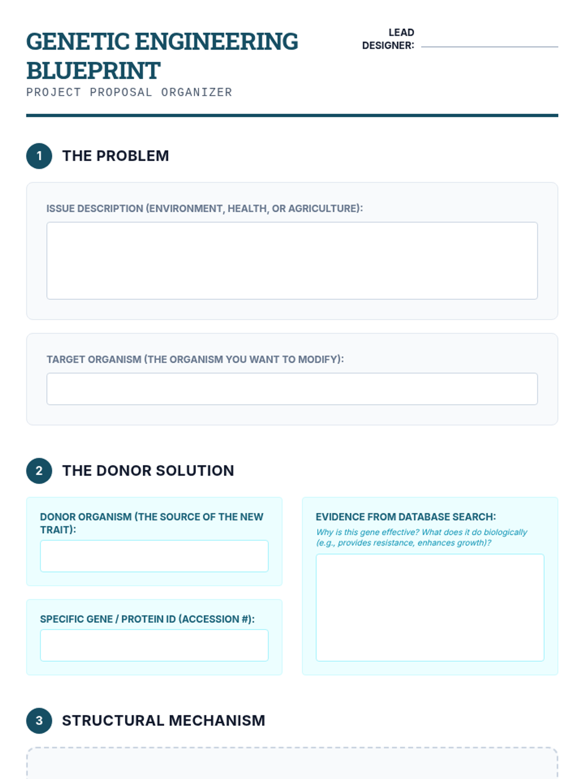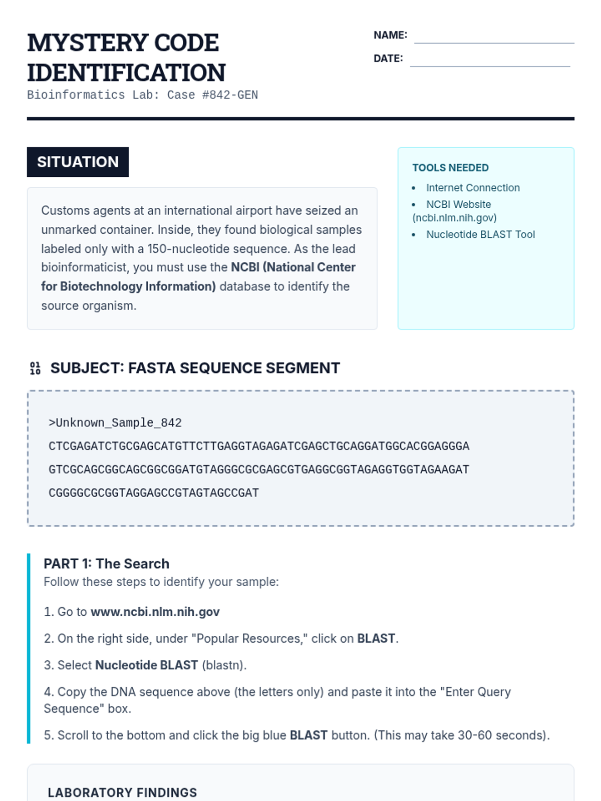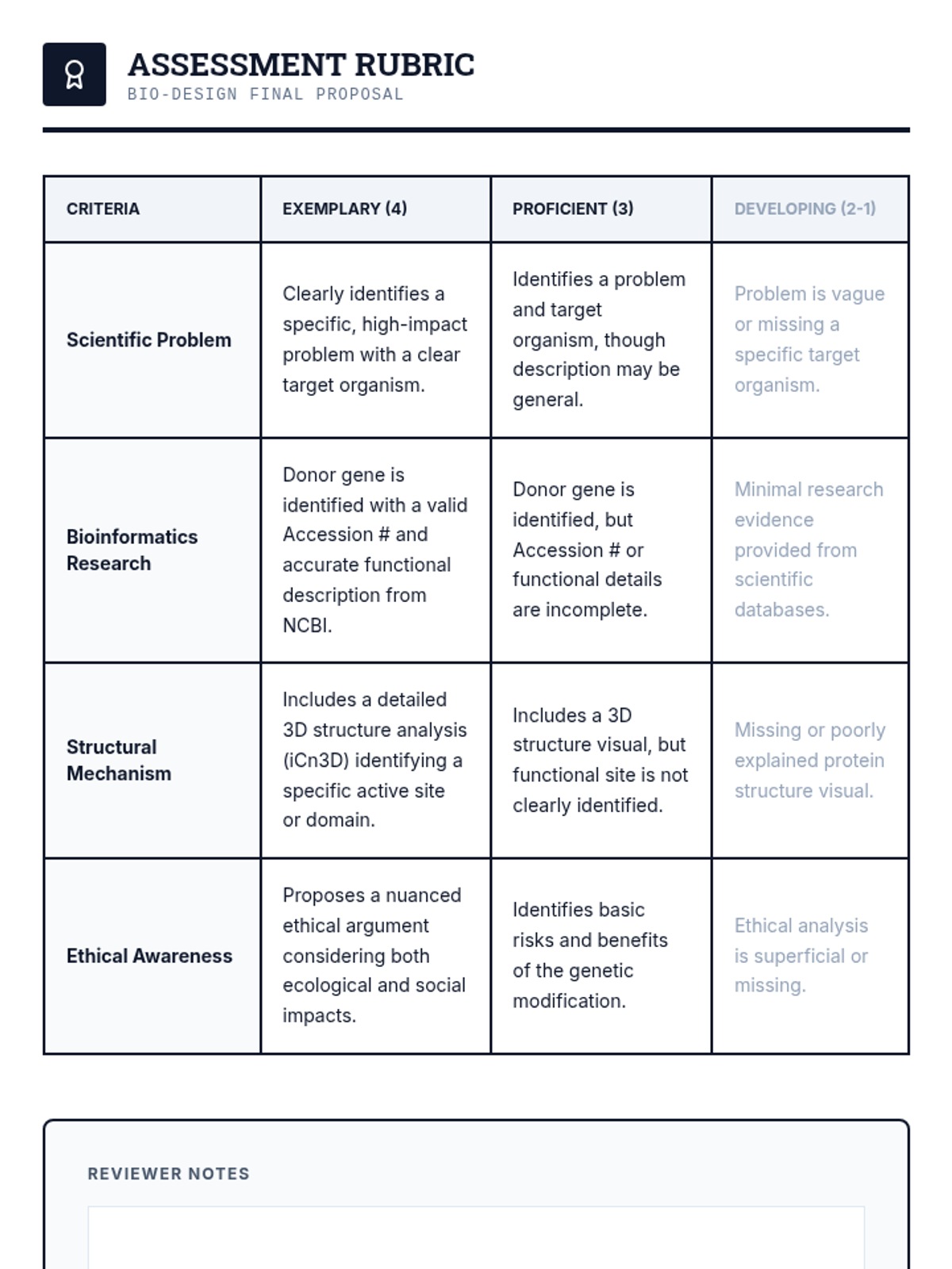 This technical workshop sequence introduces 10th-grade students to bioinformatics, using real-world databases like BLAST to compare genetic sequences and analyze protein structures. Students progress from raw DNA data to evolutionary analysis and theoretical protein engineering.