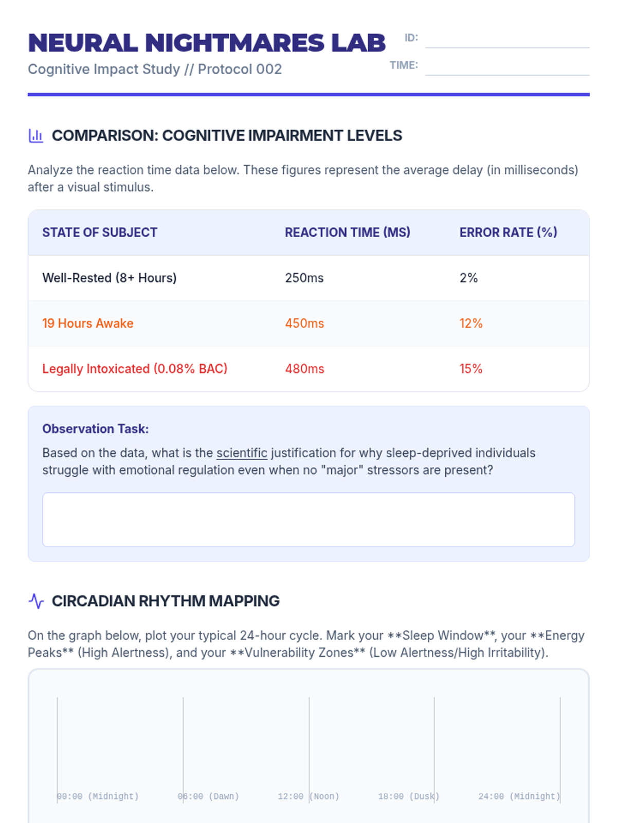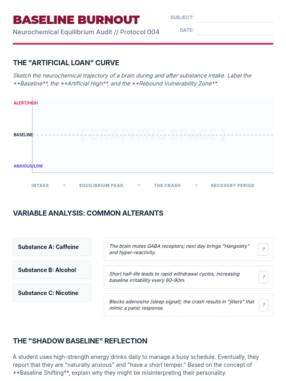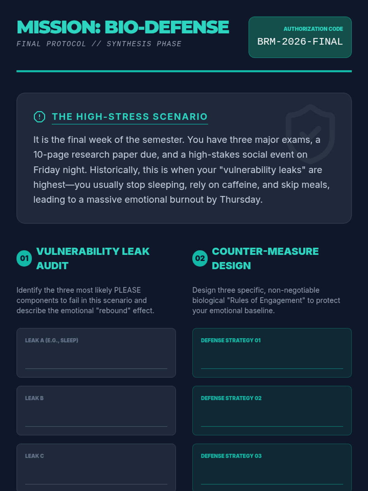 This sequence guides 12th-grade students through the physiological foundations of emotional regulation, focusing on the science behind the DBT 'PLEASE' skills. Students investigate how physical health factors like sleep, nutrition, and substance use create a biological threshold for emotional sensitivity.