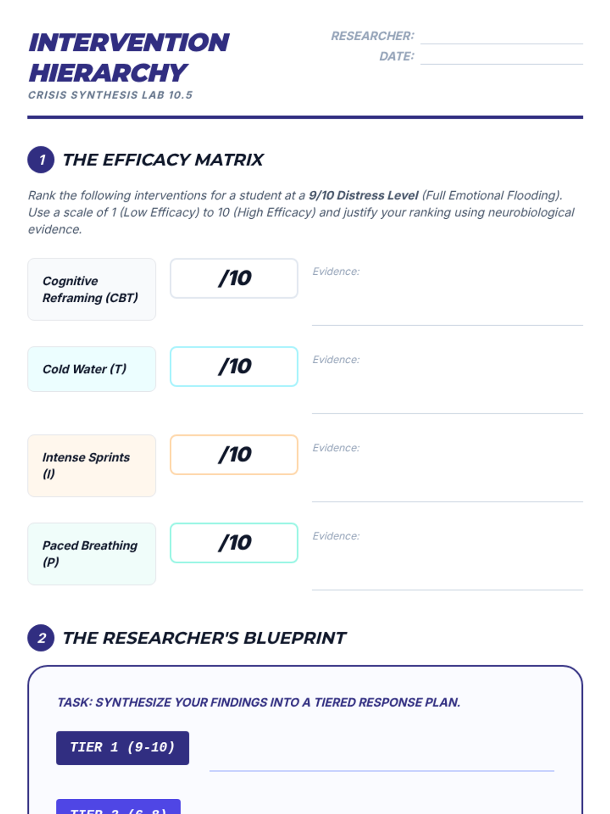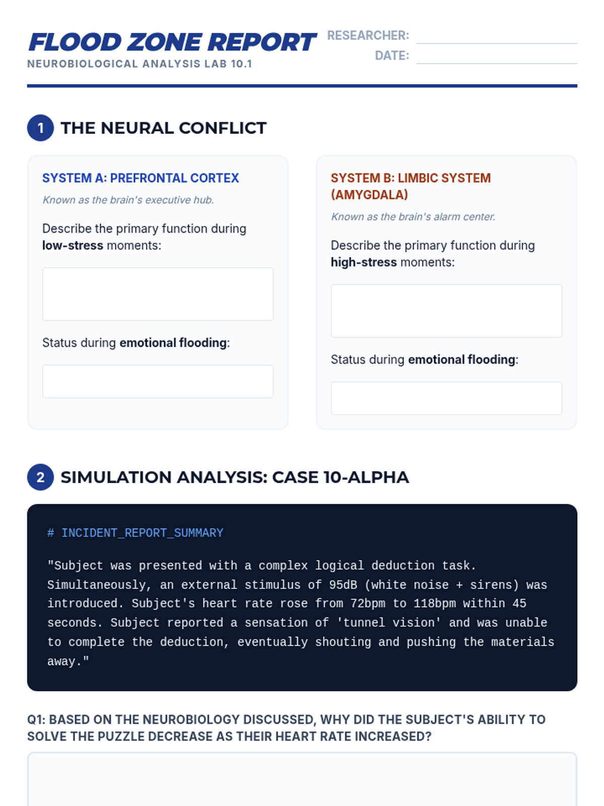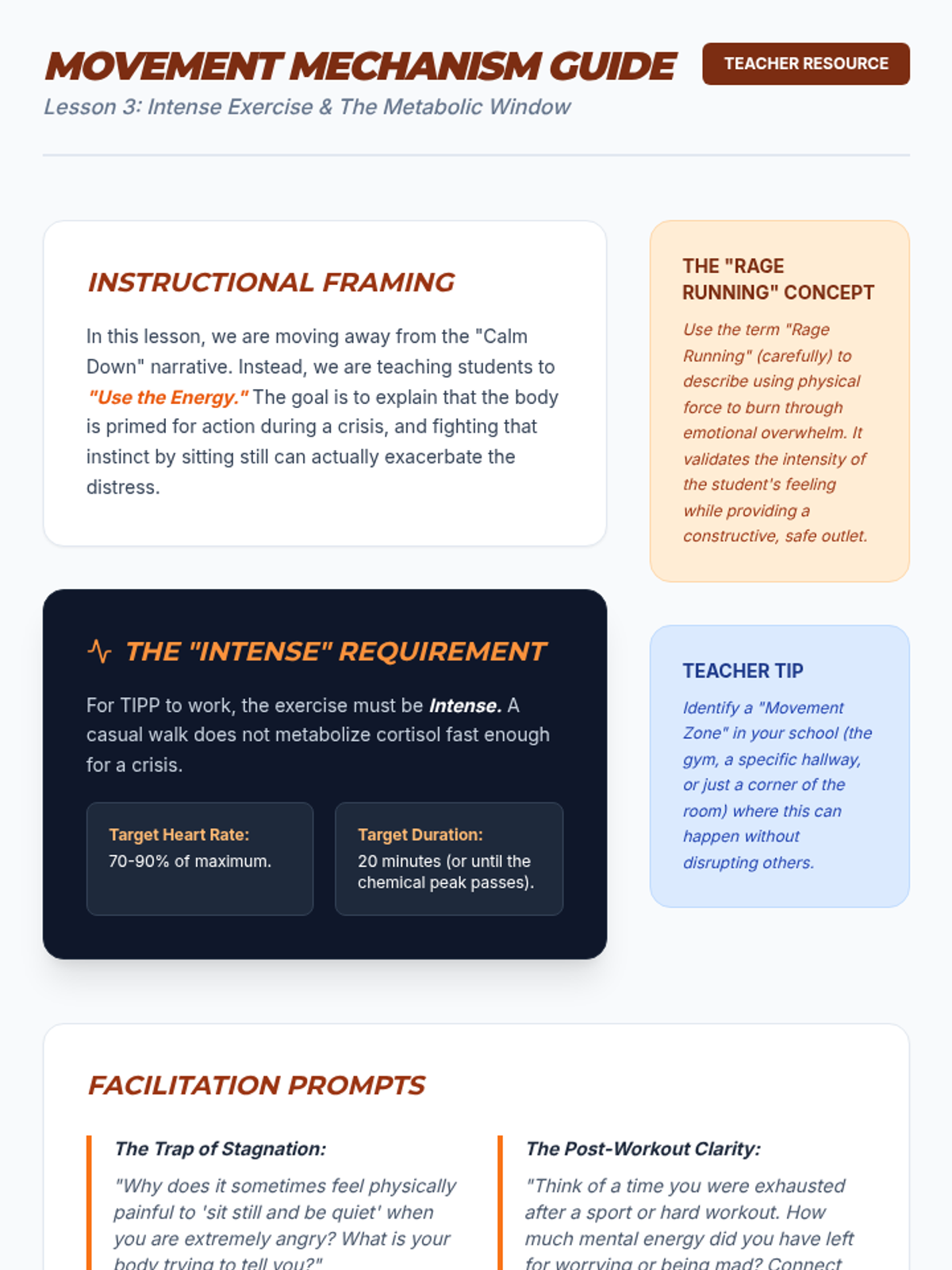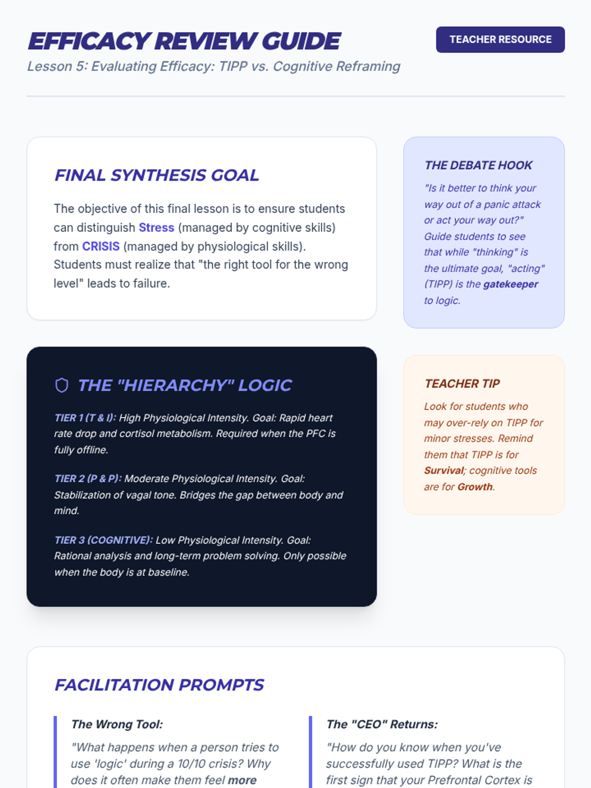A 10th-grade inquiry-based sequence exploring the neurobiological mechanisms behind TIPP (Temperature, Intense Exercise, Paced Breathing, Paired Muscle Relaxation) skills. Students investigate how physiological interventions 'hack' the nervous system during emotional flooding, shifting from cognitive reasoning to biological regulation.