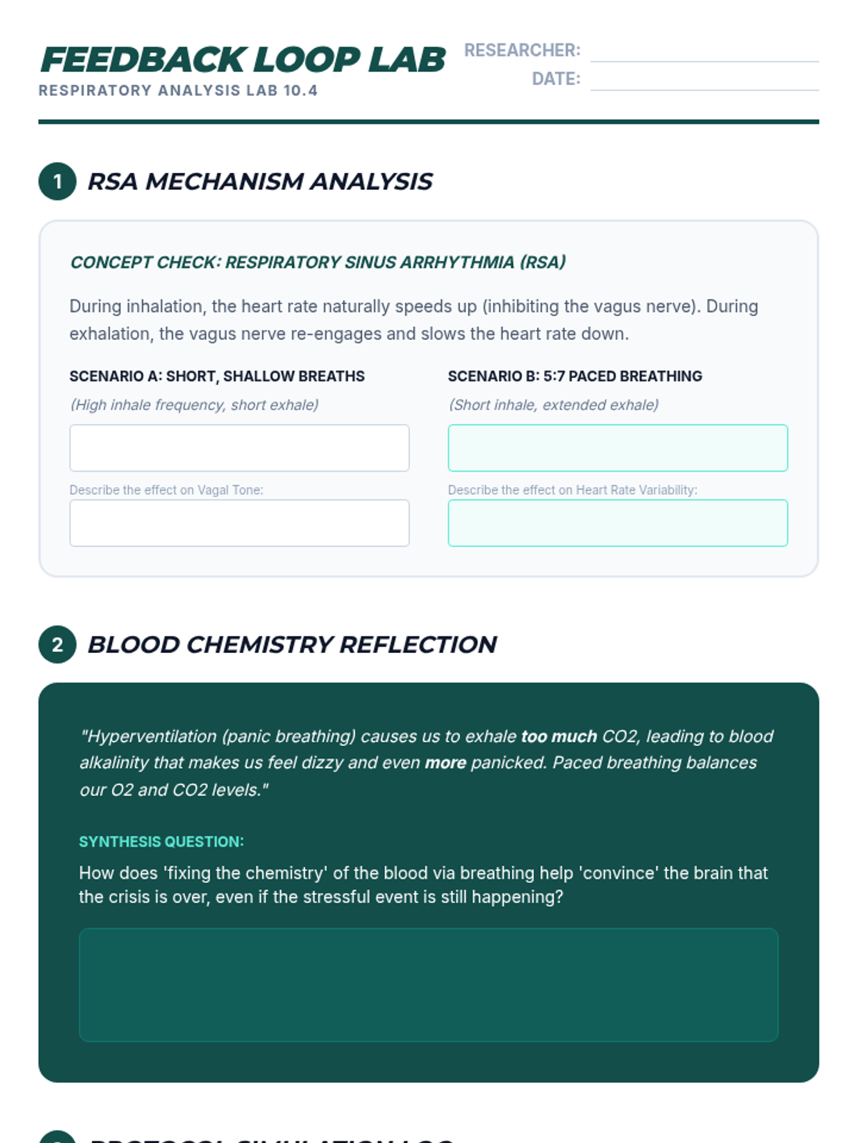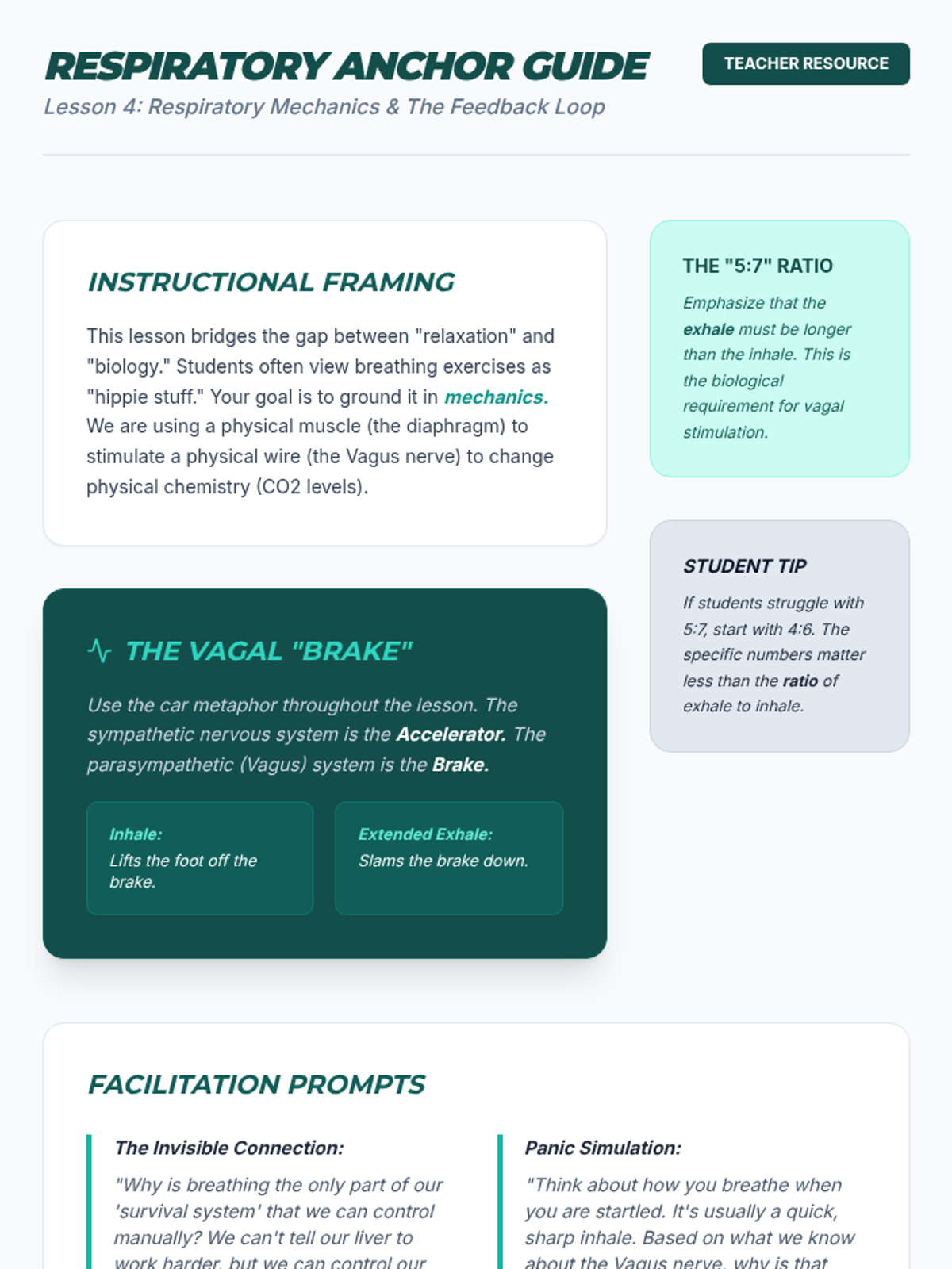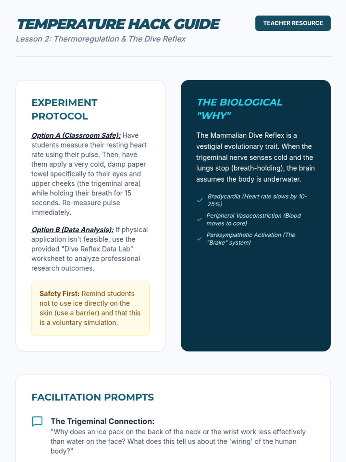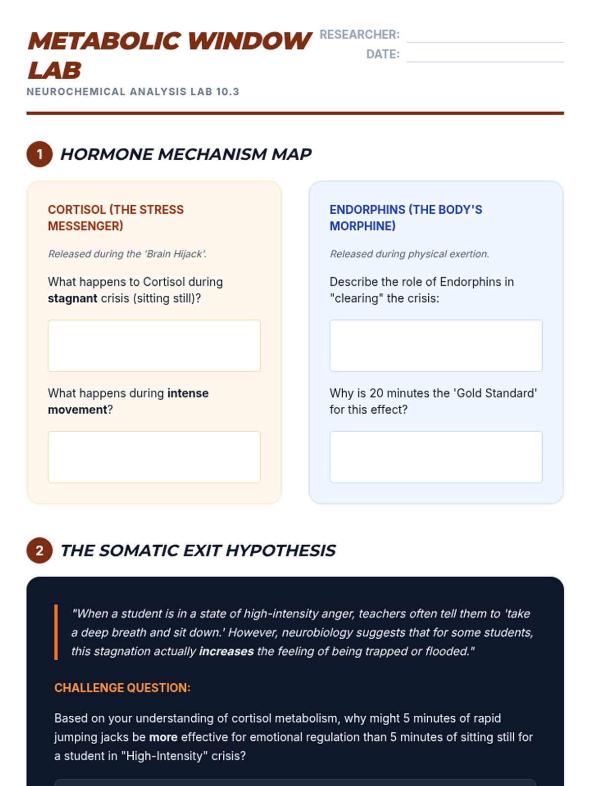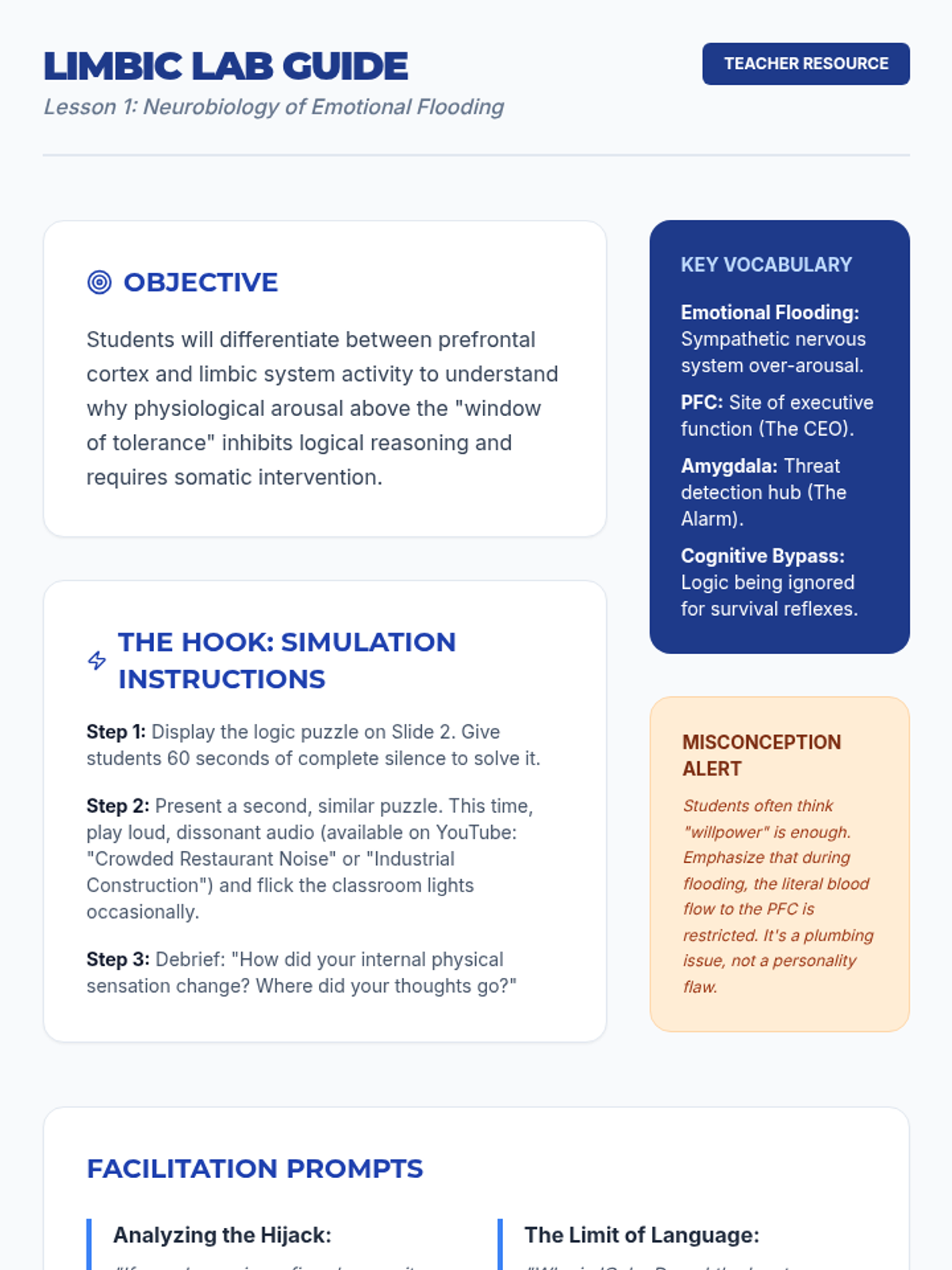 A 10th-grade inquiry-based sequence exploring the neurobiological mechanisms behind TIPP (Temperature, Intense Exercise, Paced Breathing, Paired Muscle Relaxation) skills. Students investigate how physiological interventions 'hack' the nervous system during emotional flooding, shifting from cognitive reasoning to biological regulation.
