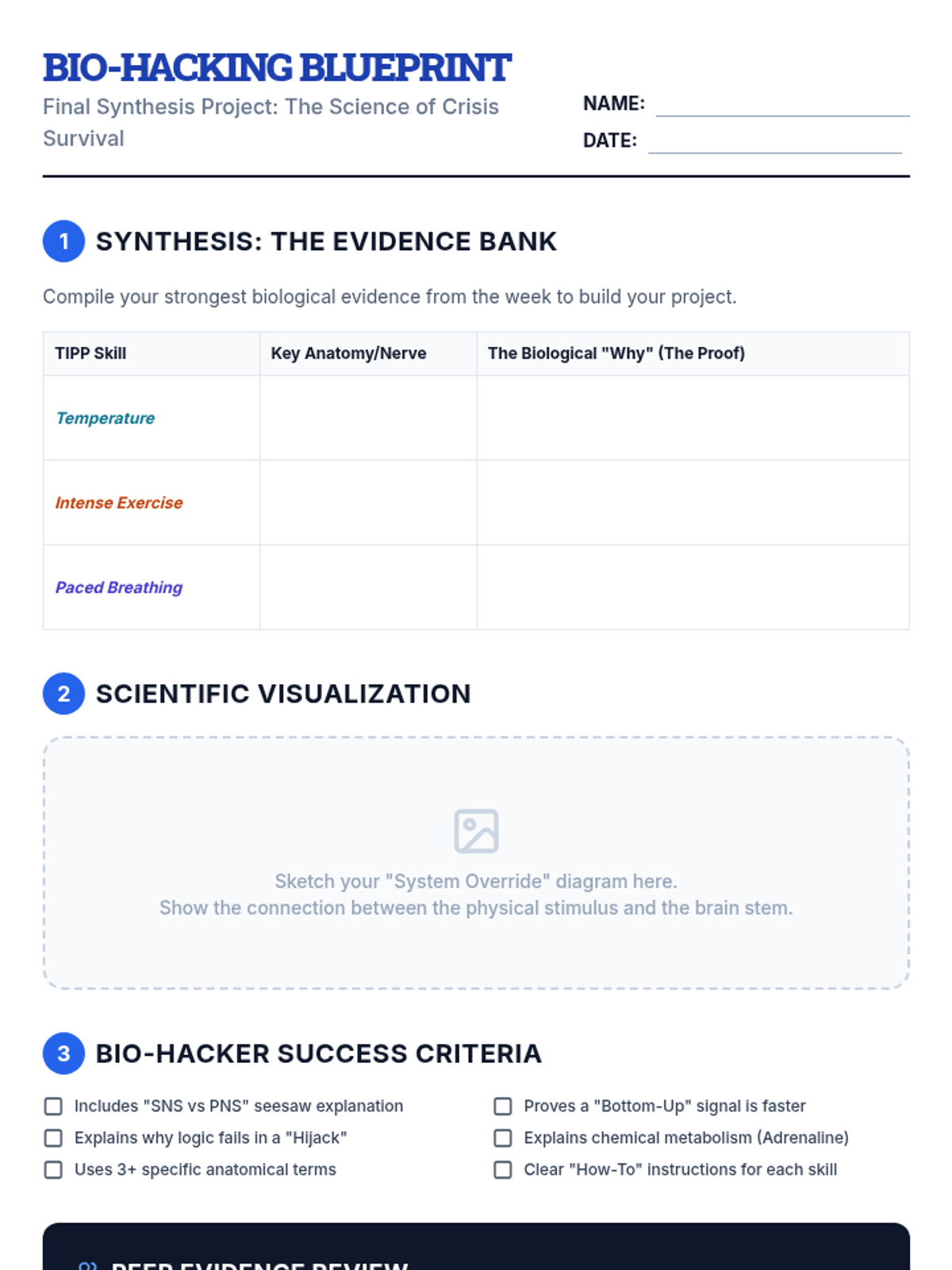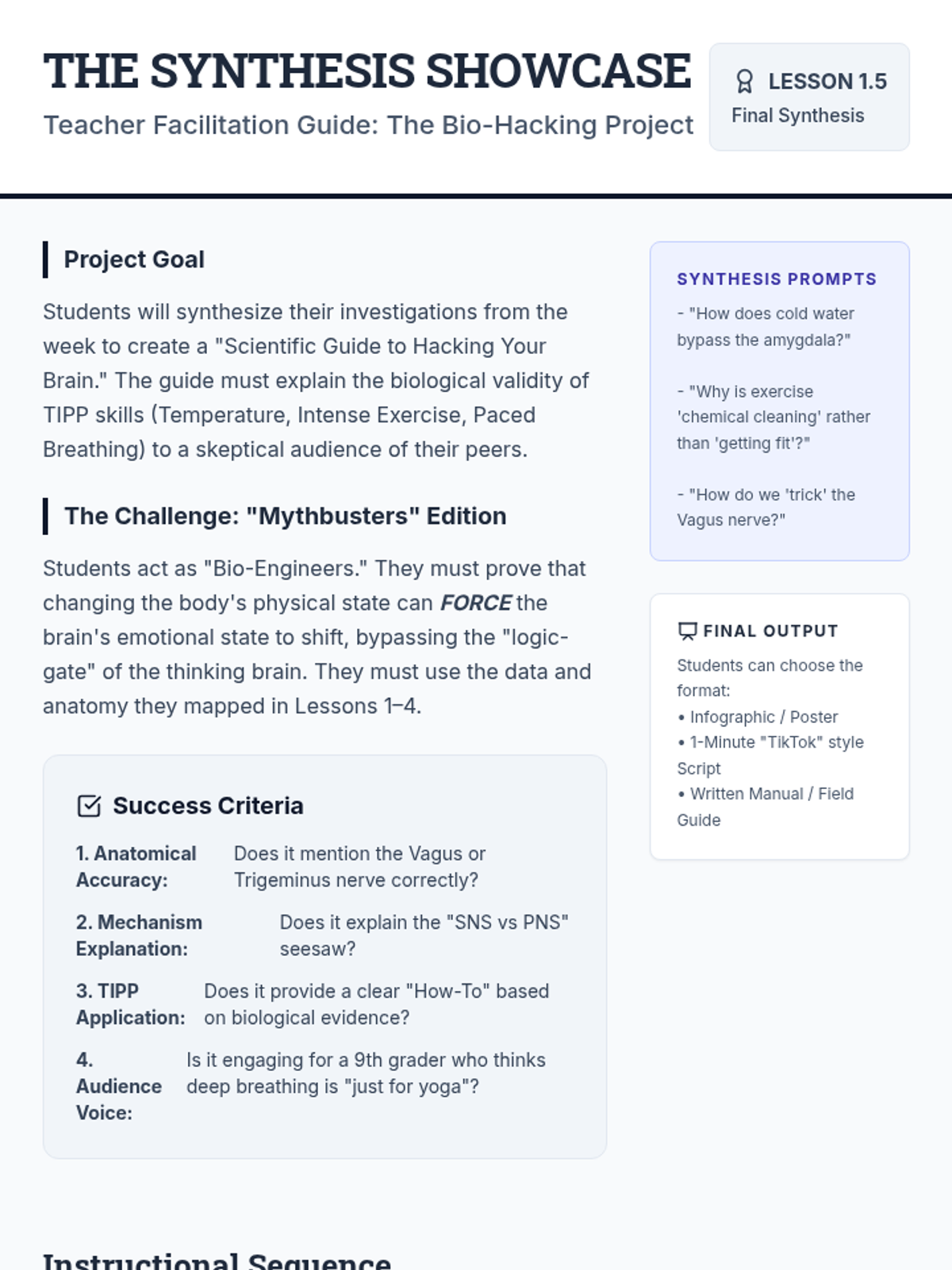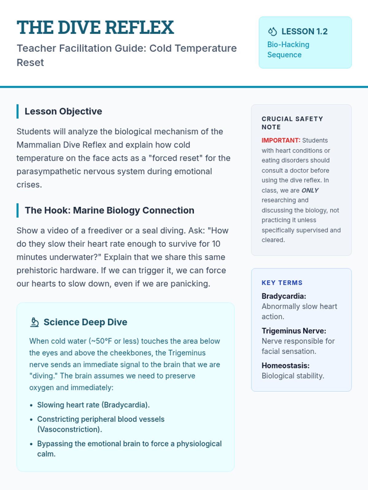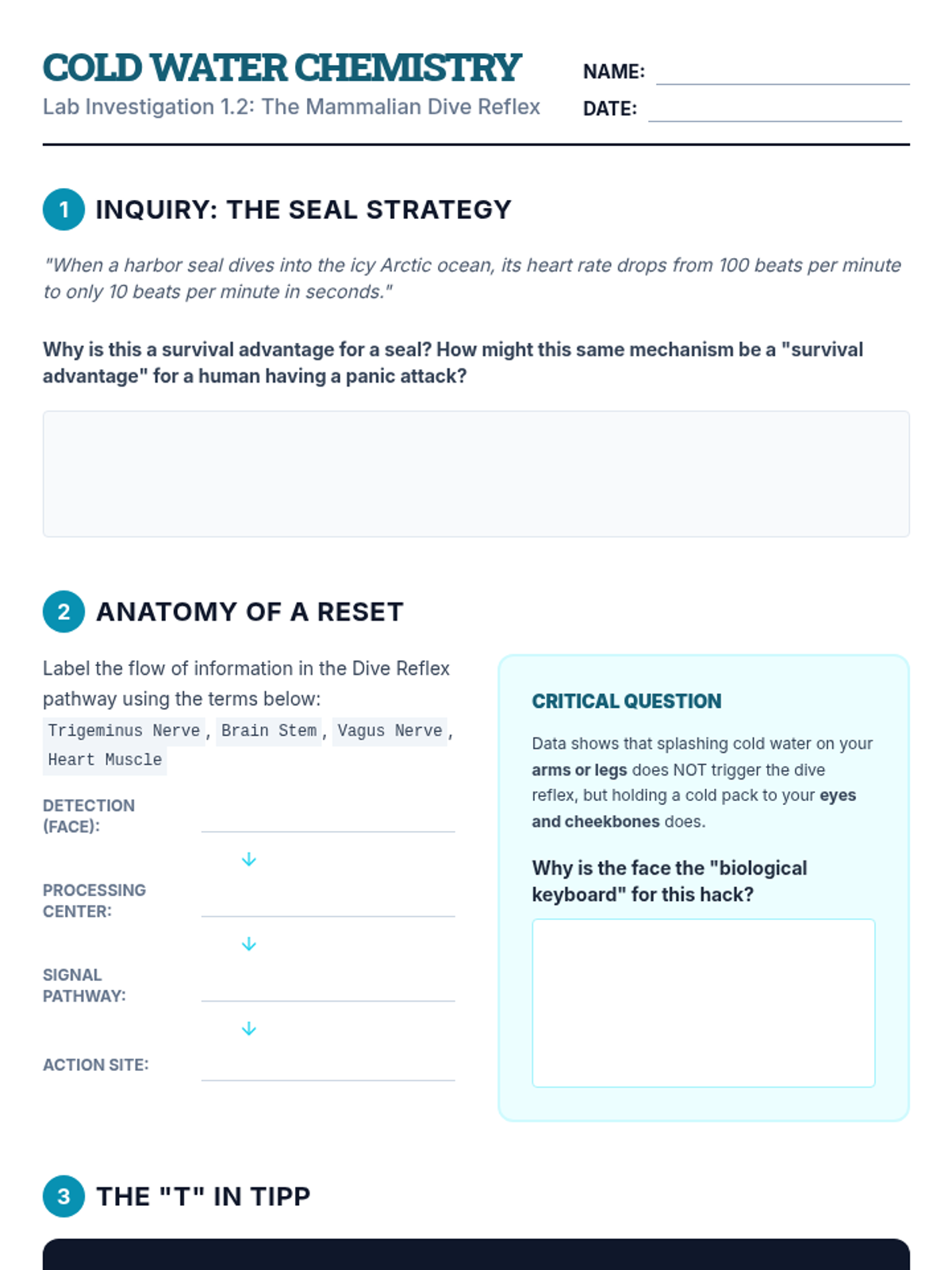This inquiry-based sequence bridges biology and psychology, guiding students to investigate the neurological underpinnings of TIPP crisis survival skills. Students explore how the sympathetic and parasympathetic nervous systems interact with physical inputs to regulate emotional distress.