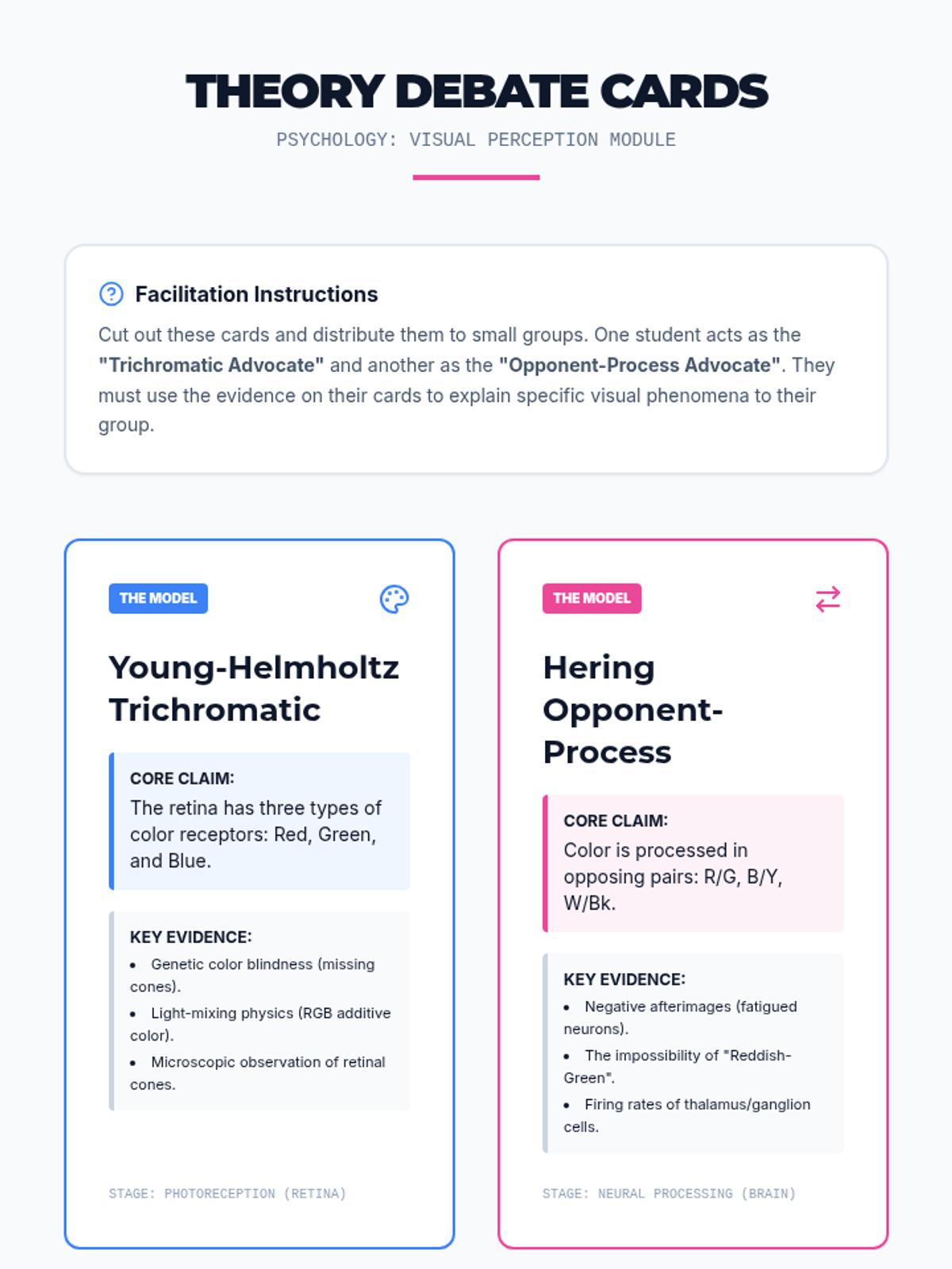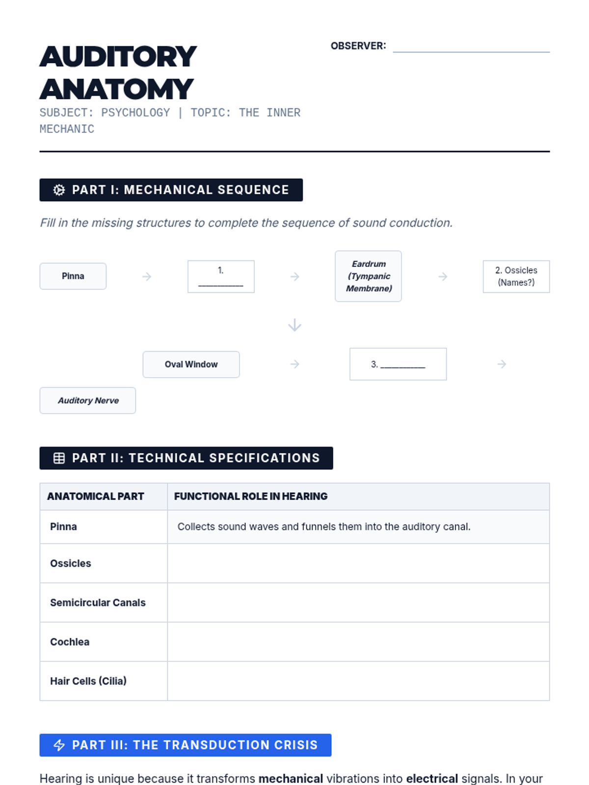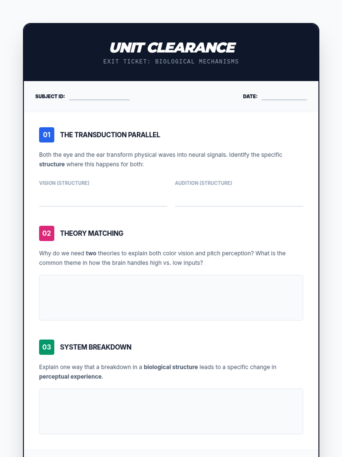A comprehensive 12th-grade psychology unit focusing on the anatomical and neural mechanisms of vision and audition. Students explore the transformation of physical waves into neural signals, comparing scientific theories of color and pitch perception while investigating sensory deficits and modern prosthetics.
