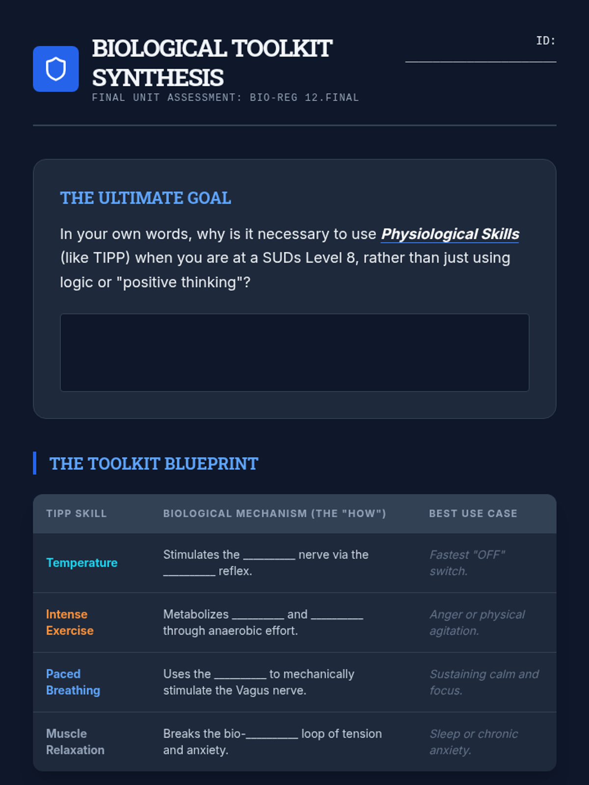 A high-school level exploration of the biological and neurological foundations of TIPP skills, focusing on how the Autonomic Nervous System can be manually regulated through physiological intervention.