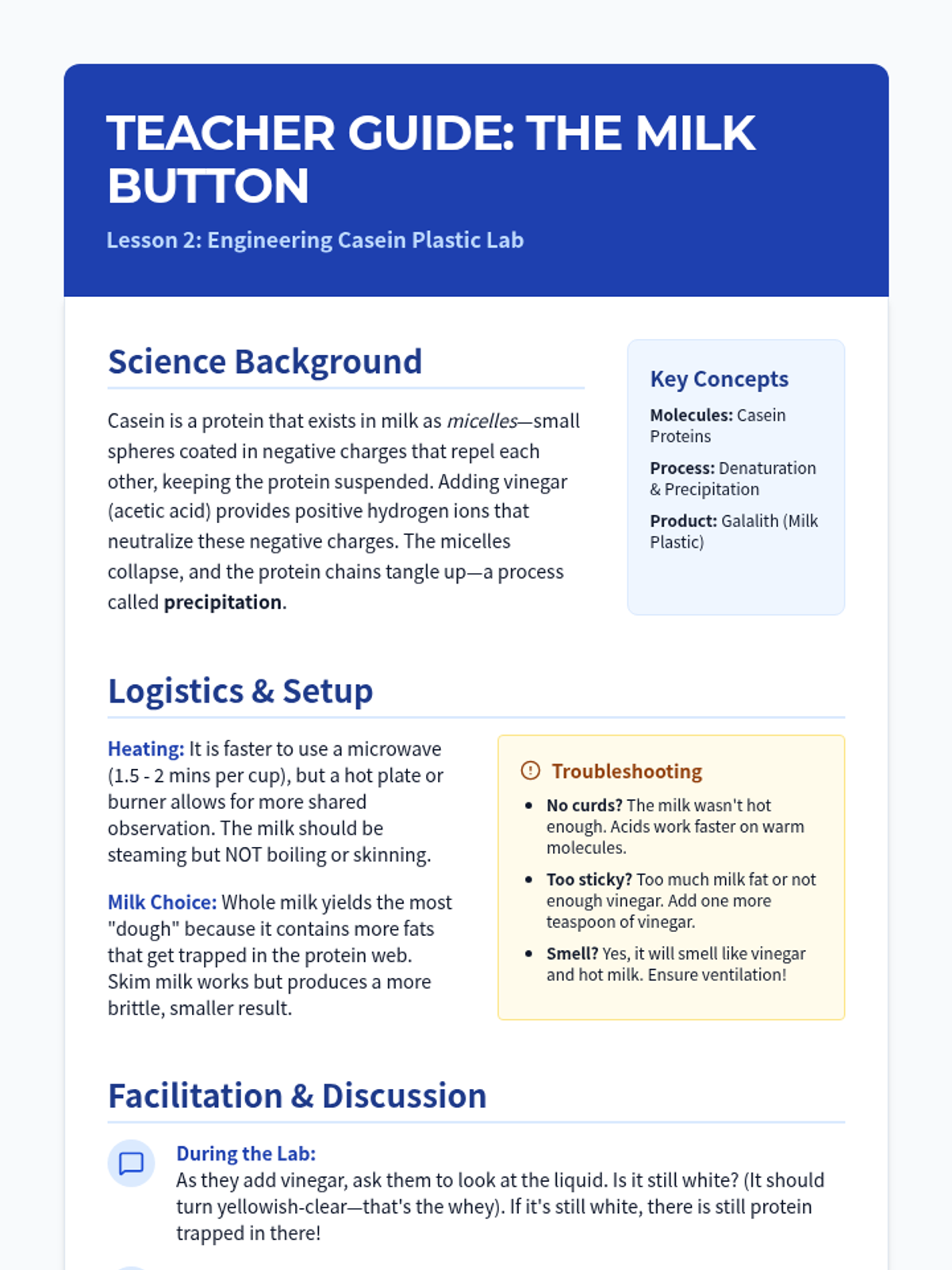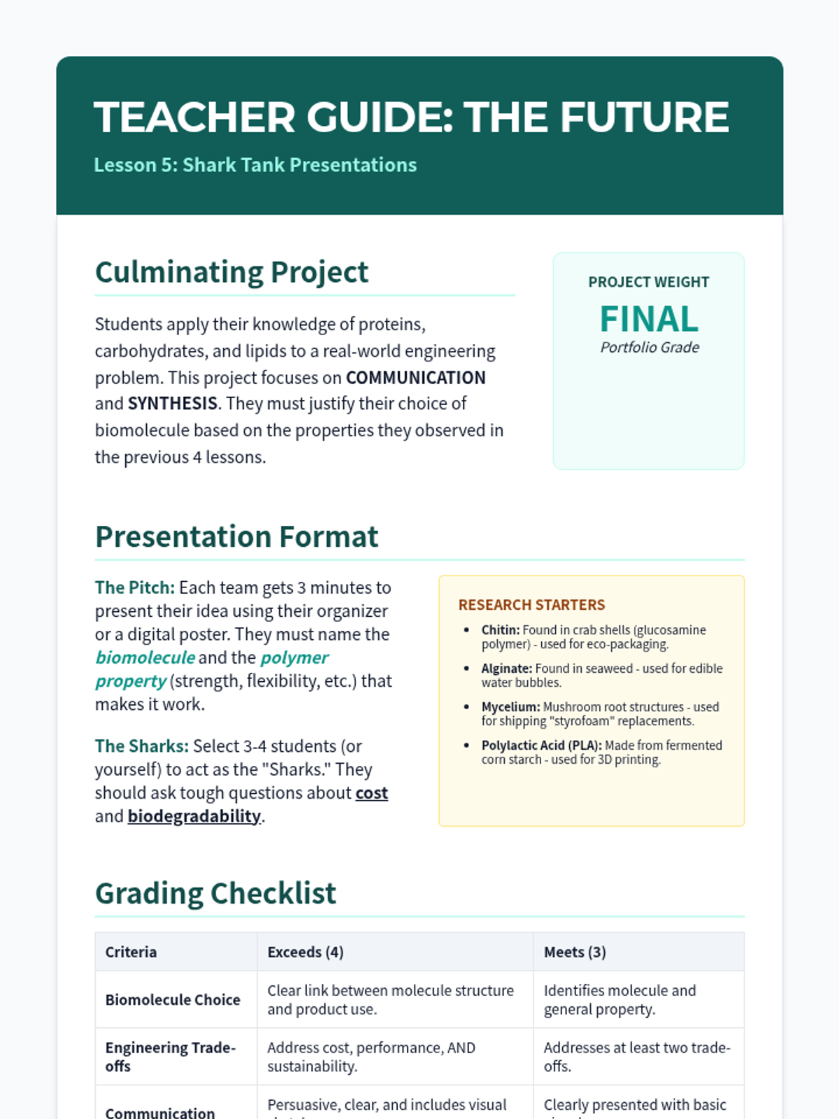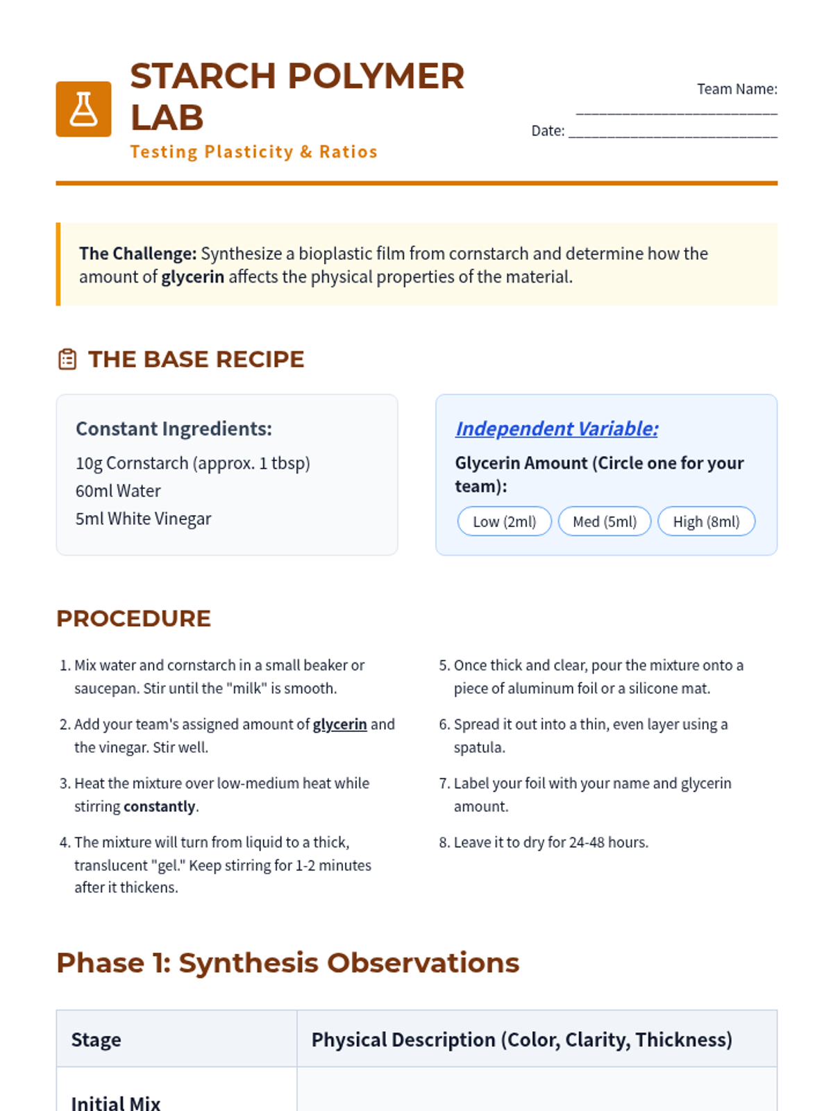 An engineering-focused biology sequence where students explore biomolecules as raw materials. They synthesize bioplastics from milk and starch, test their properties against synthetic plastics, and research future sustainable materials.