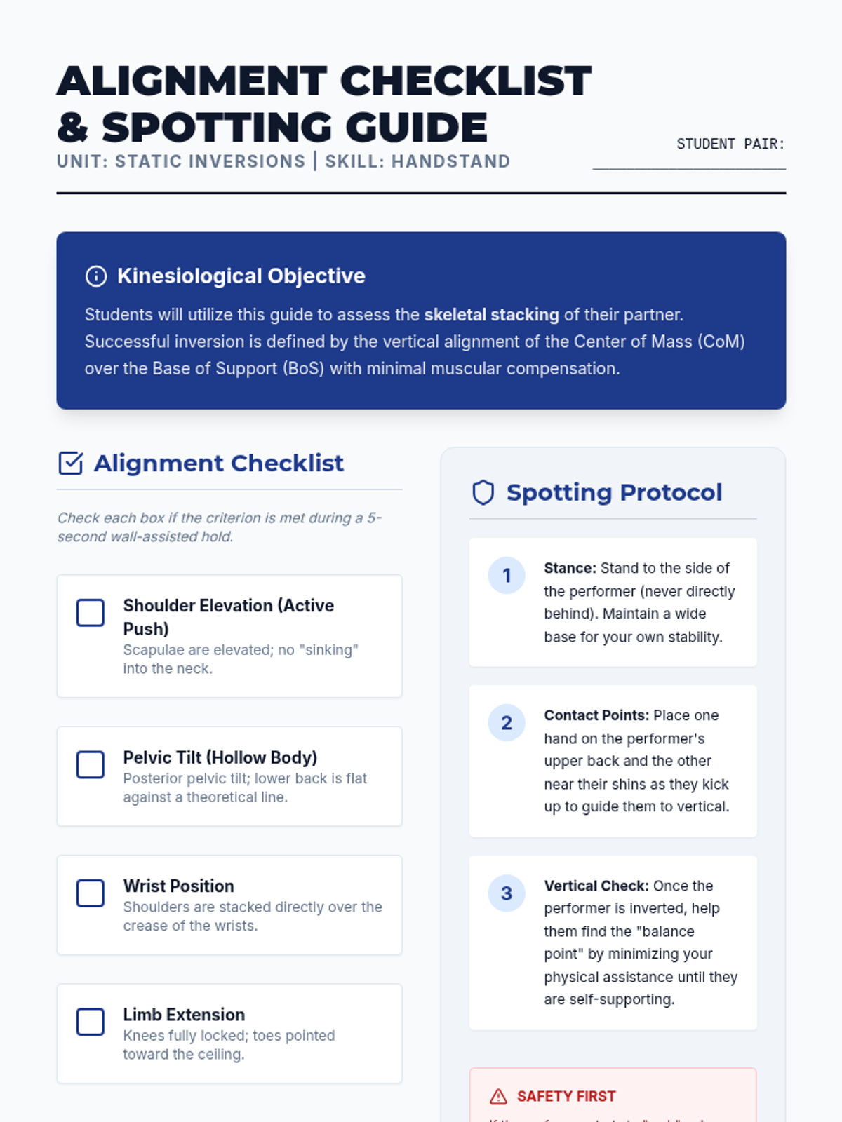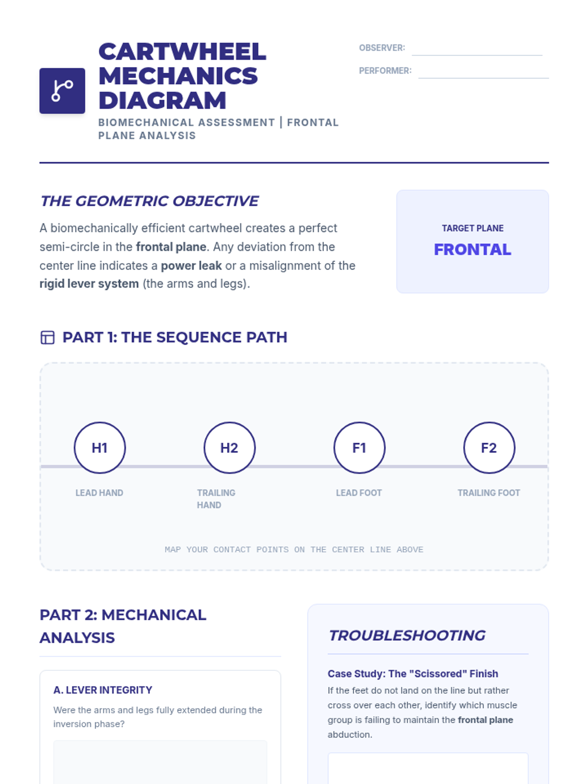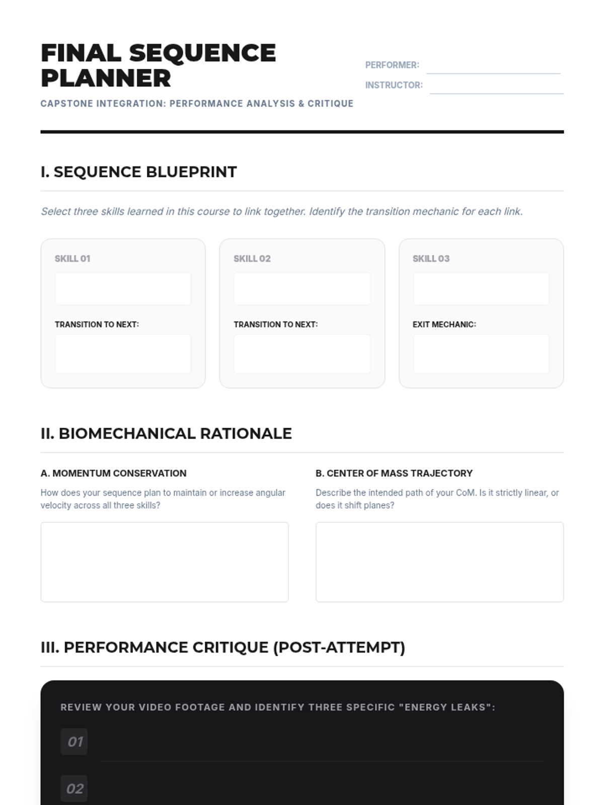 This undergraduate sequence explores fundamental tumbling skills through a kinesiological lens, focusing on biomechanical principles like moment of inertia, skeletal stacking, and kinetic power transfer. Students progress from basic rolls to complex rotational movements, analyzing the physics that drive efficiency and safety.