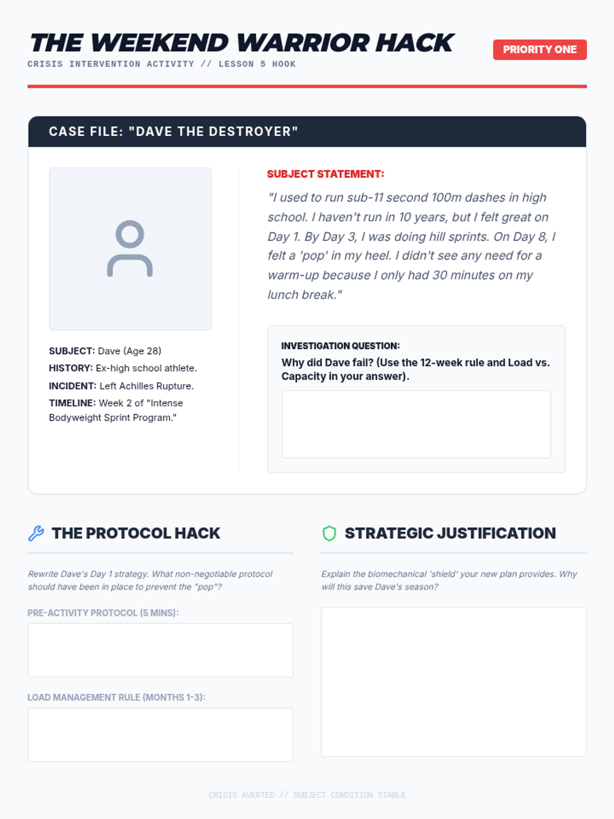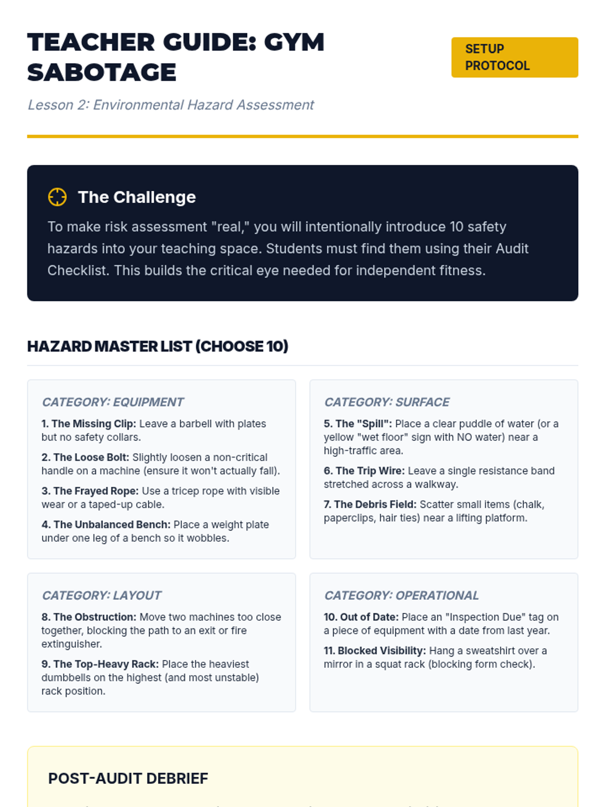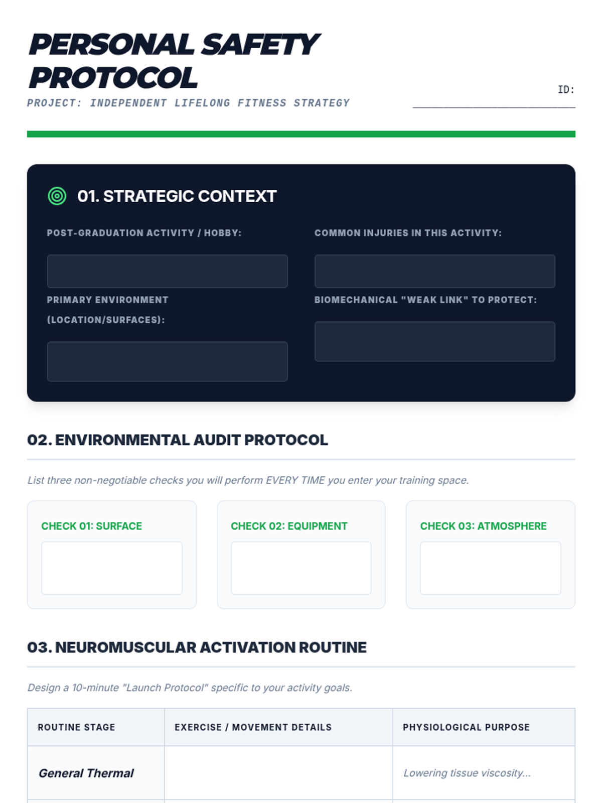This high-school senior unit explores the biomechanical and environmental factors of injury prevention. Students analyze injury mechanisms, conduct safety audits, and design personalized safety protocols for lifelong physical health.