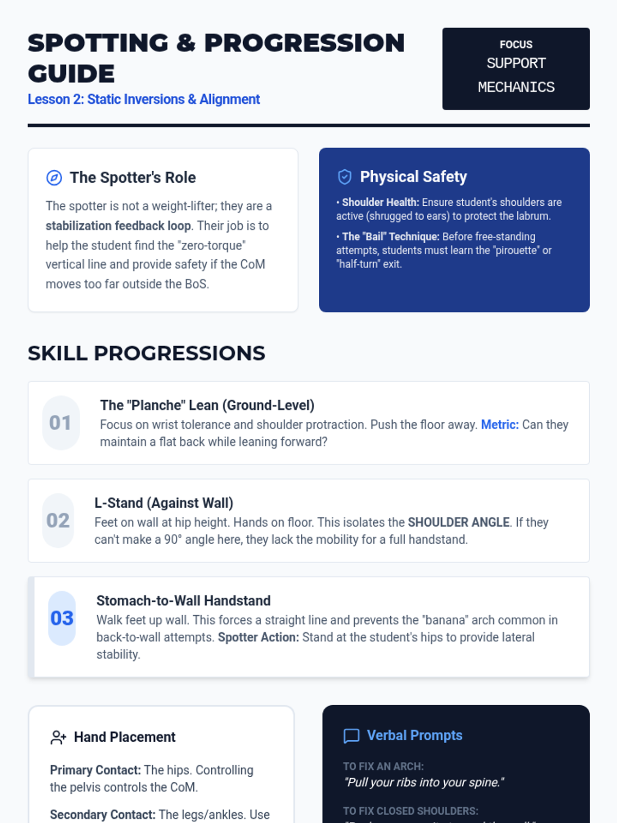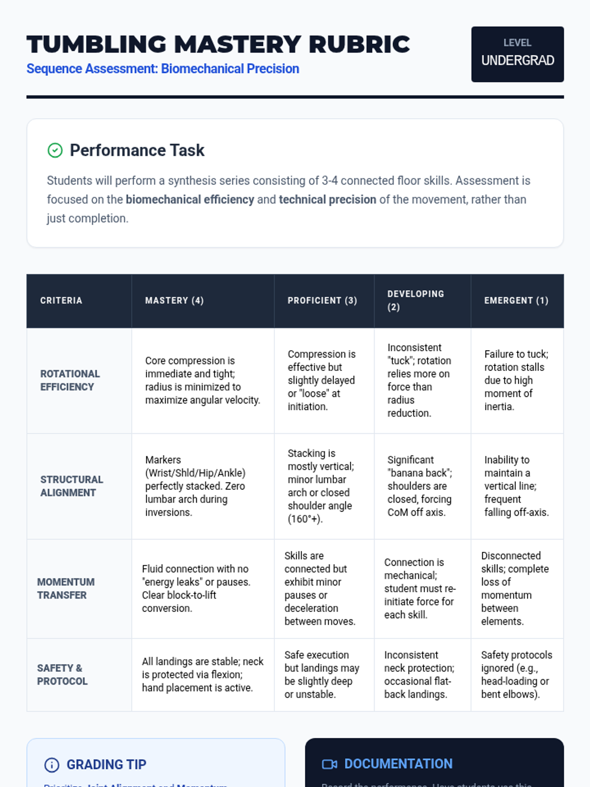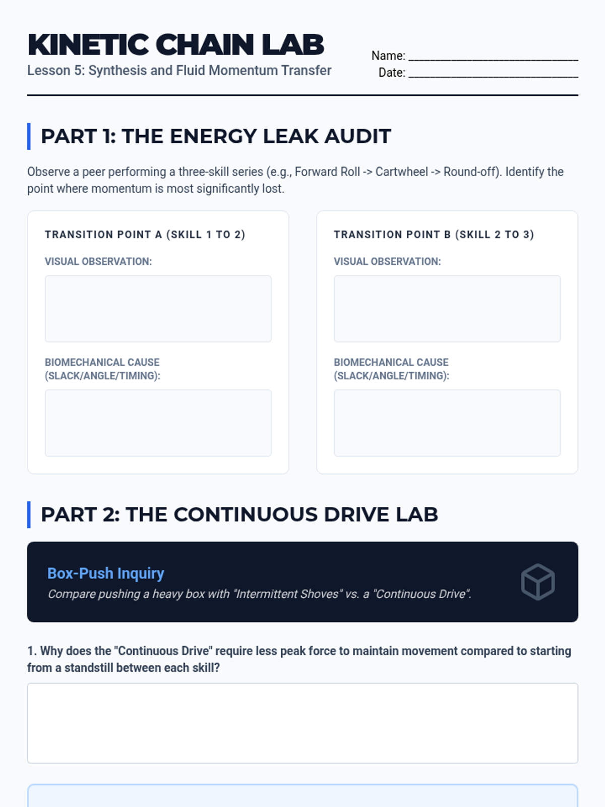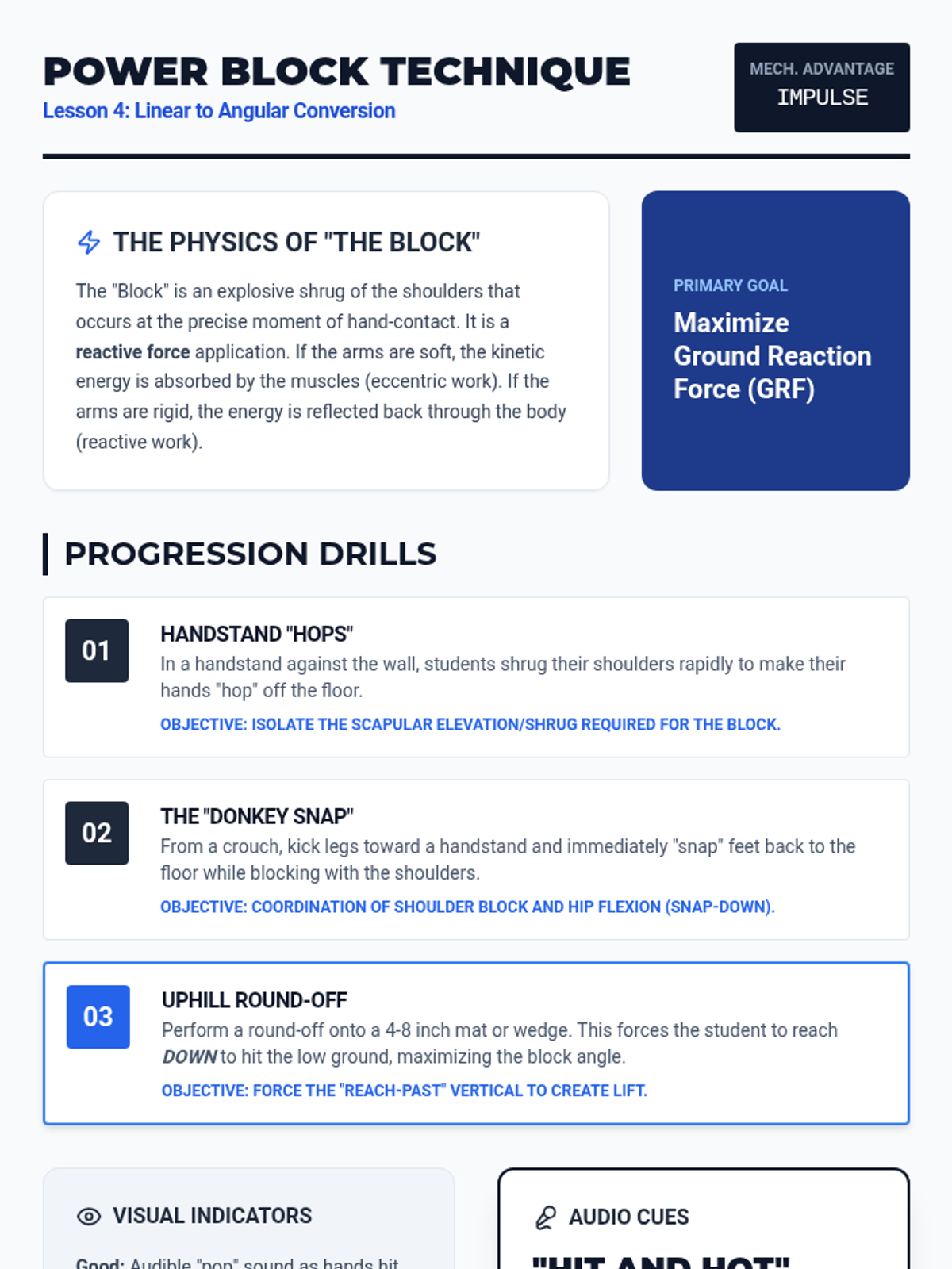 This sequence integrates physics concepts with fundamental floor skills to help students understand the mechanics of tumbling. Students explore center of mass, rotational mechanics, leverage, and force absorption through hands-on practice and video analysis.