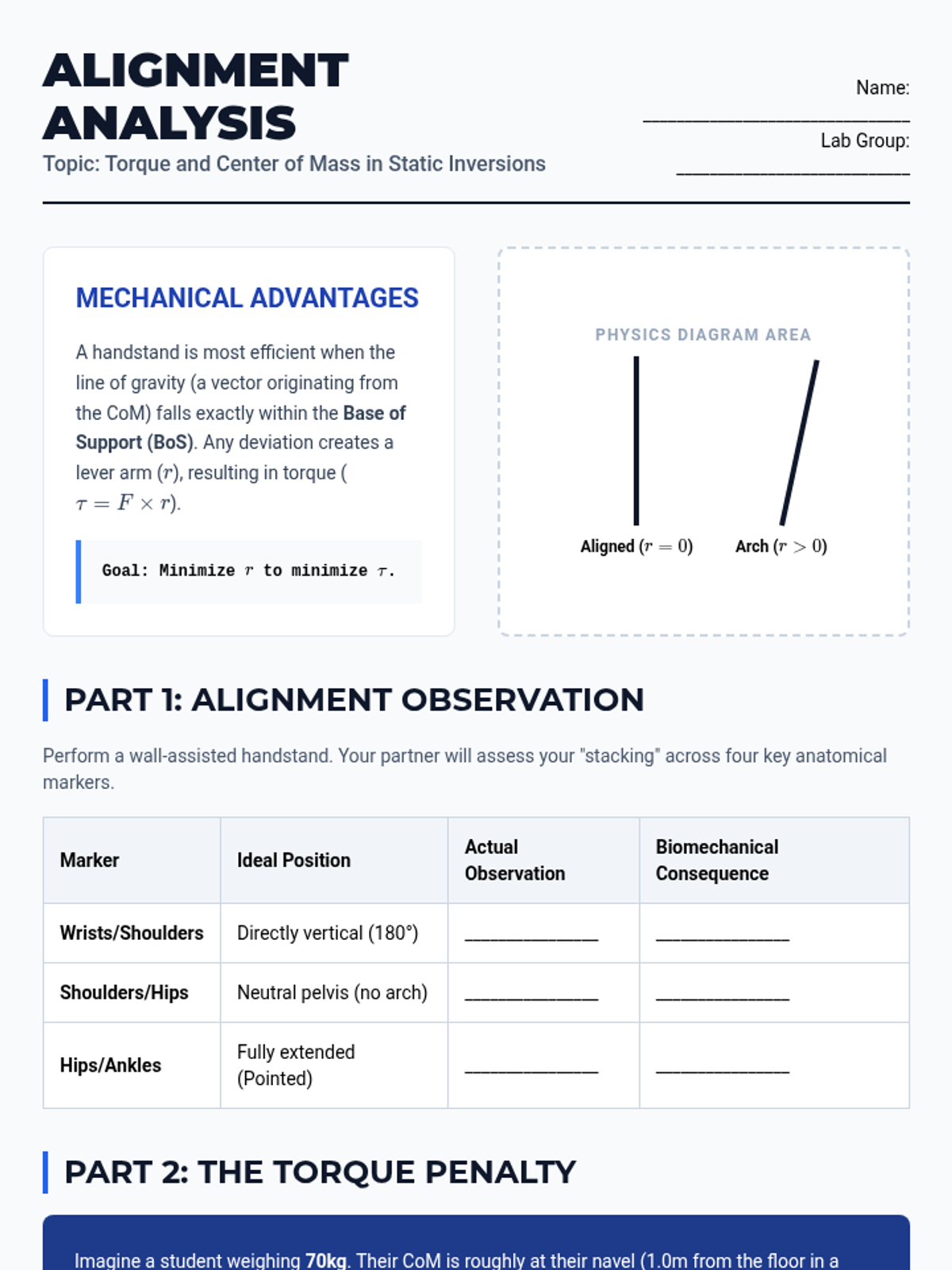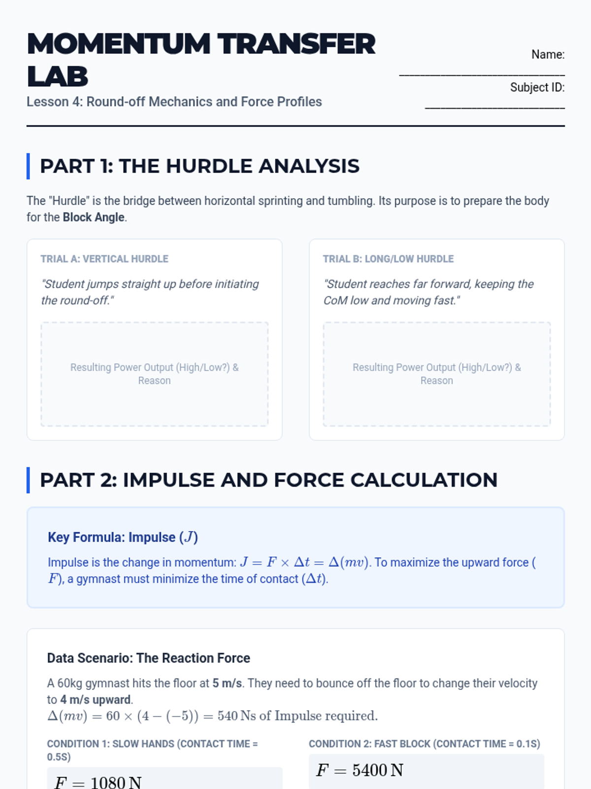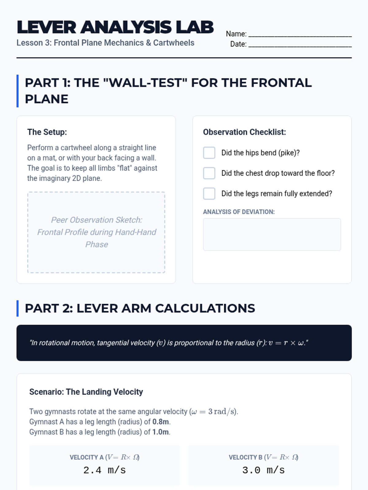An undergraduate-level sequence exploring the biomechanical principles of gymnastics floor skills, focusing on rotational mechanics, static stability, and momentum transfer.