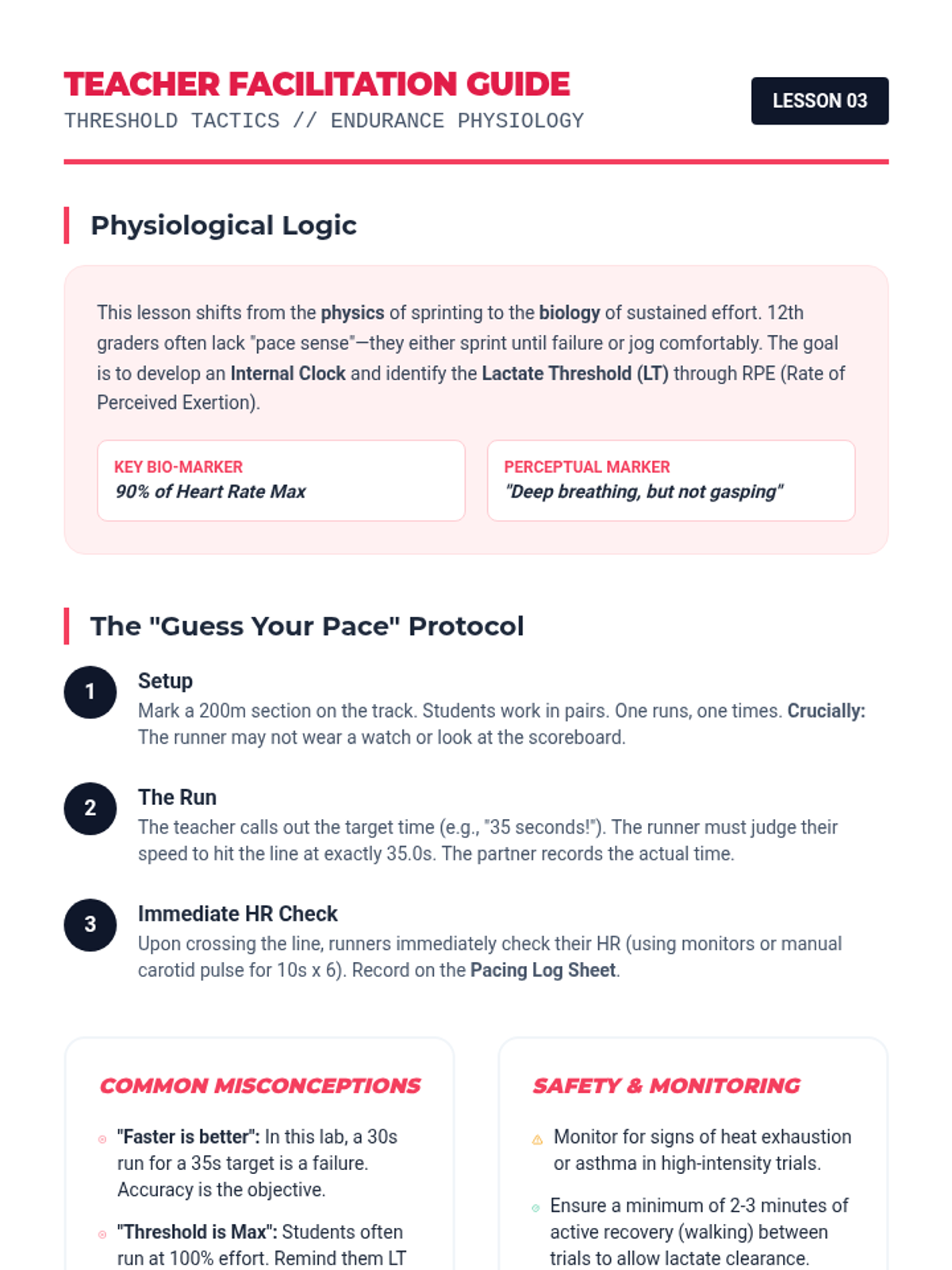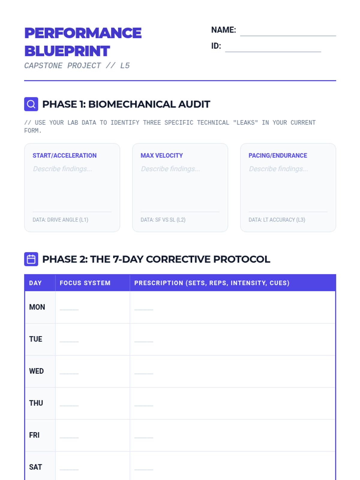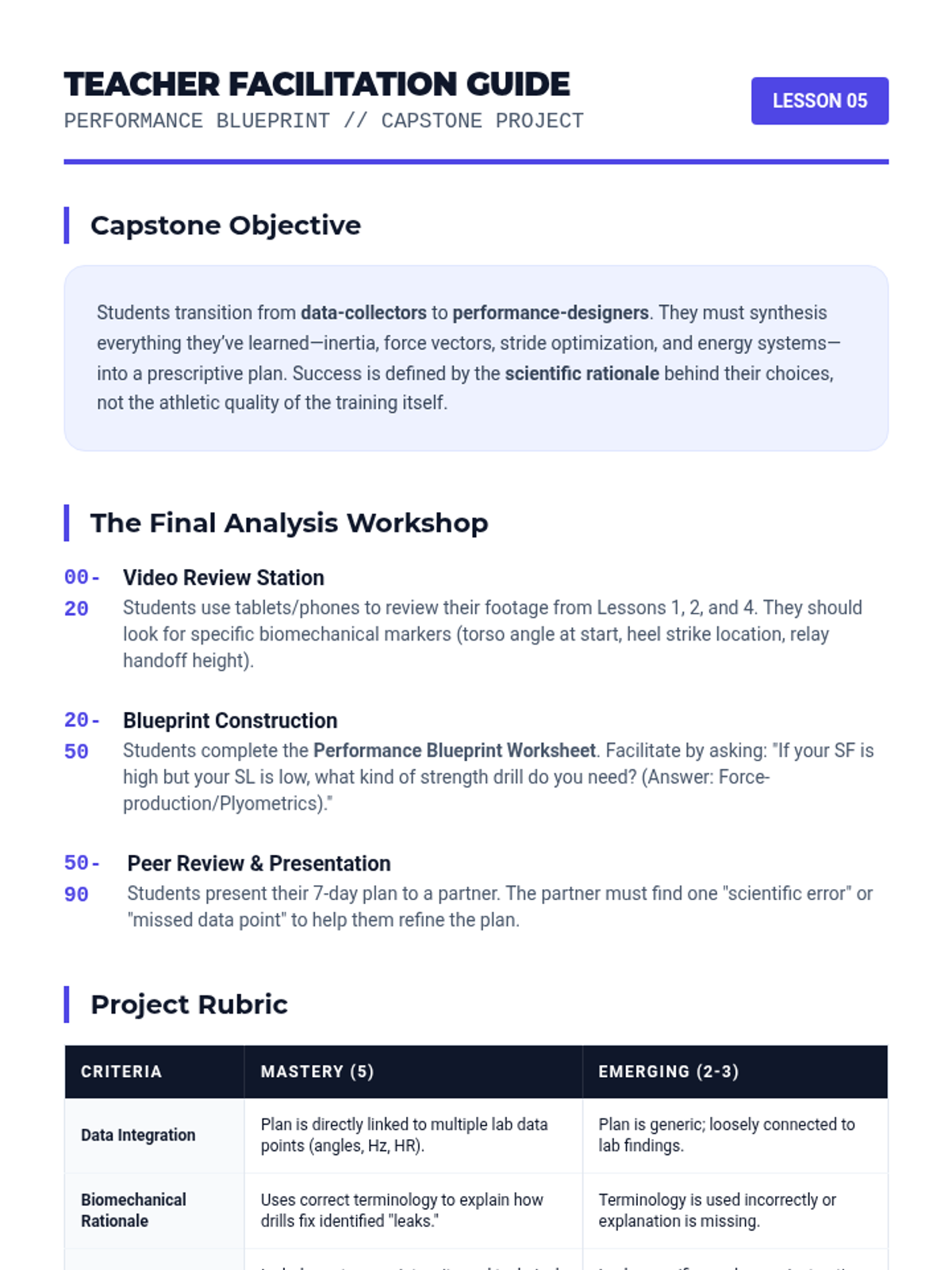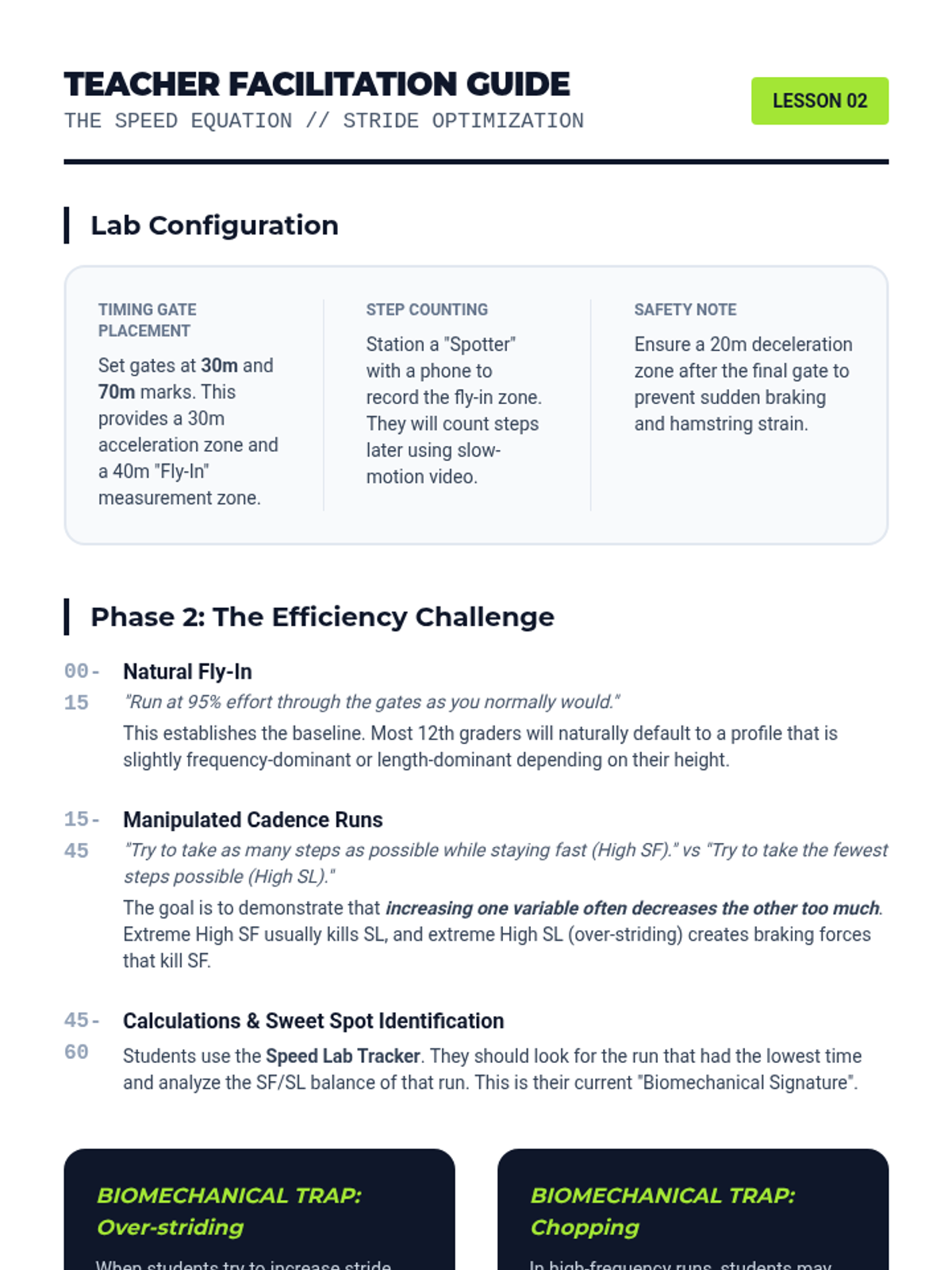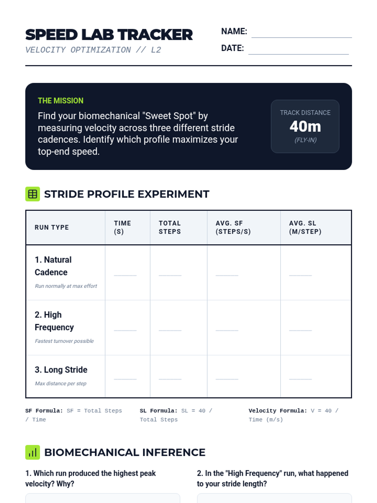A high-performance track and field unit for 12th-grade students that integrates biomechanics and physiology. Students analyze acceleration physics, stride efficiency, energy systems, and relay coordination to optimize their athletic performance through data-driven training.