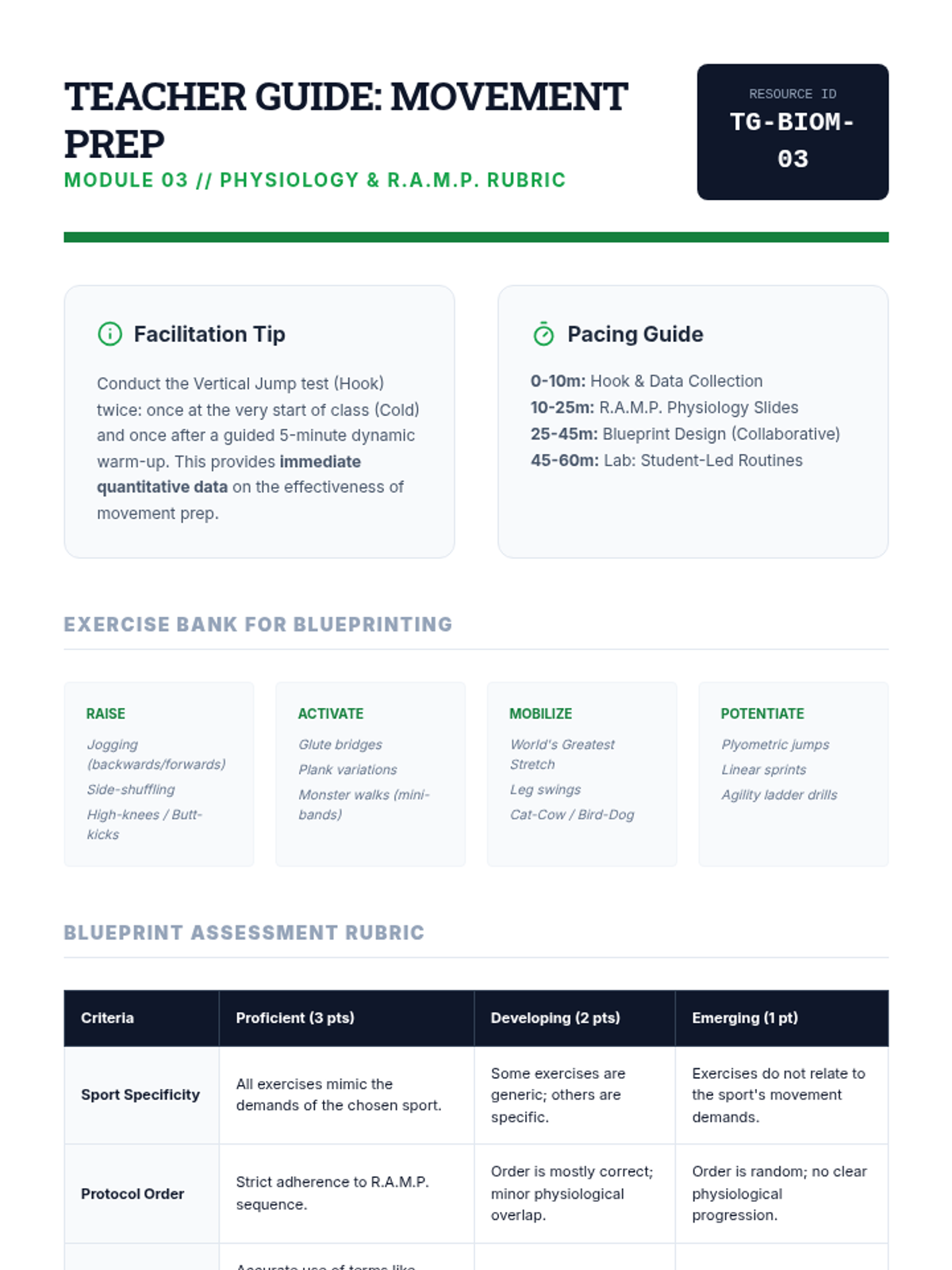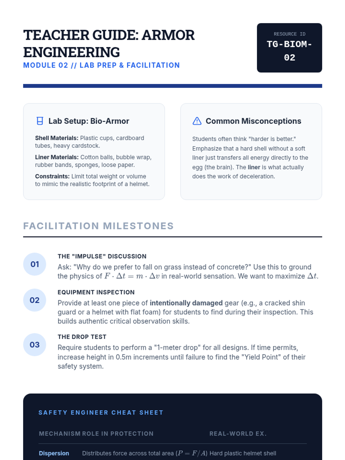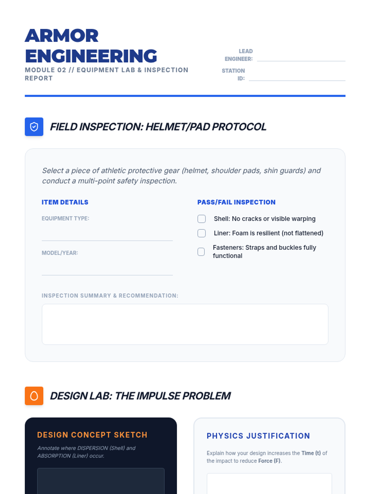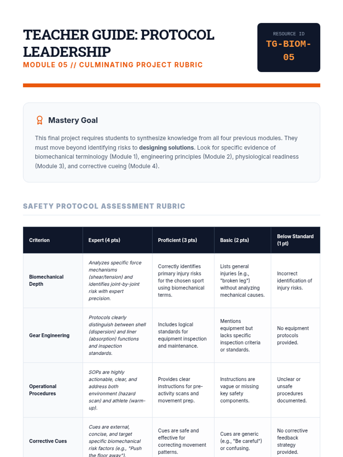 This 10th-grade Health and Physical Education sequence integrates biomechanics and safety engineering to teach students how to prevent sports injuries. Students progress from understanding tissue-level failure to analyzing movement patterns and designing comprehensive safety protocols for athletic environments.