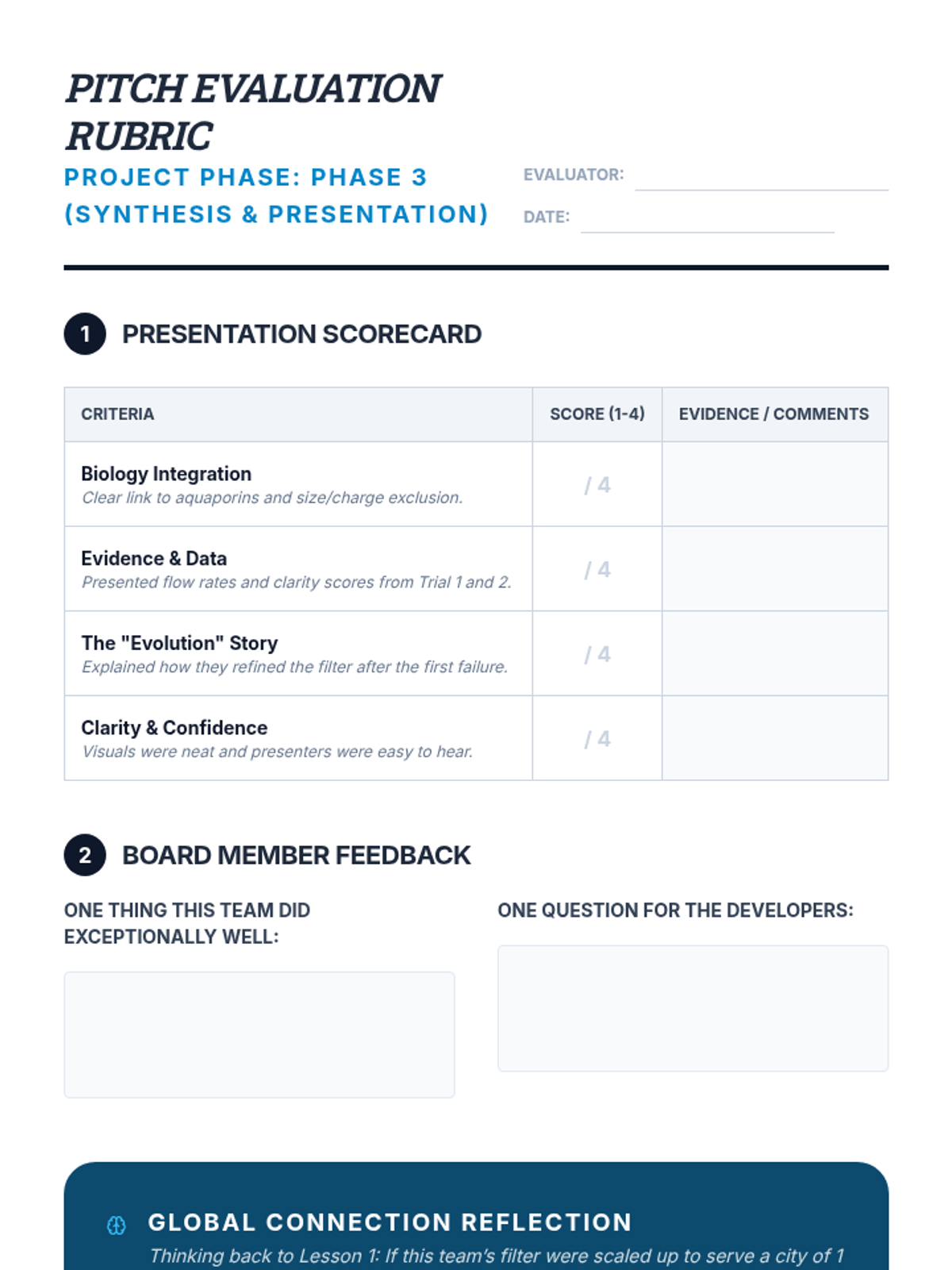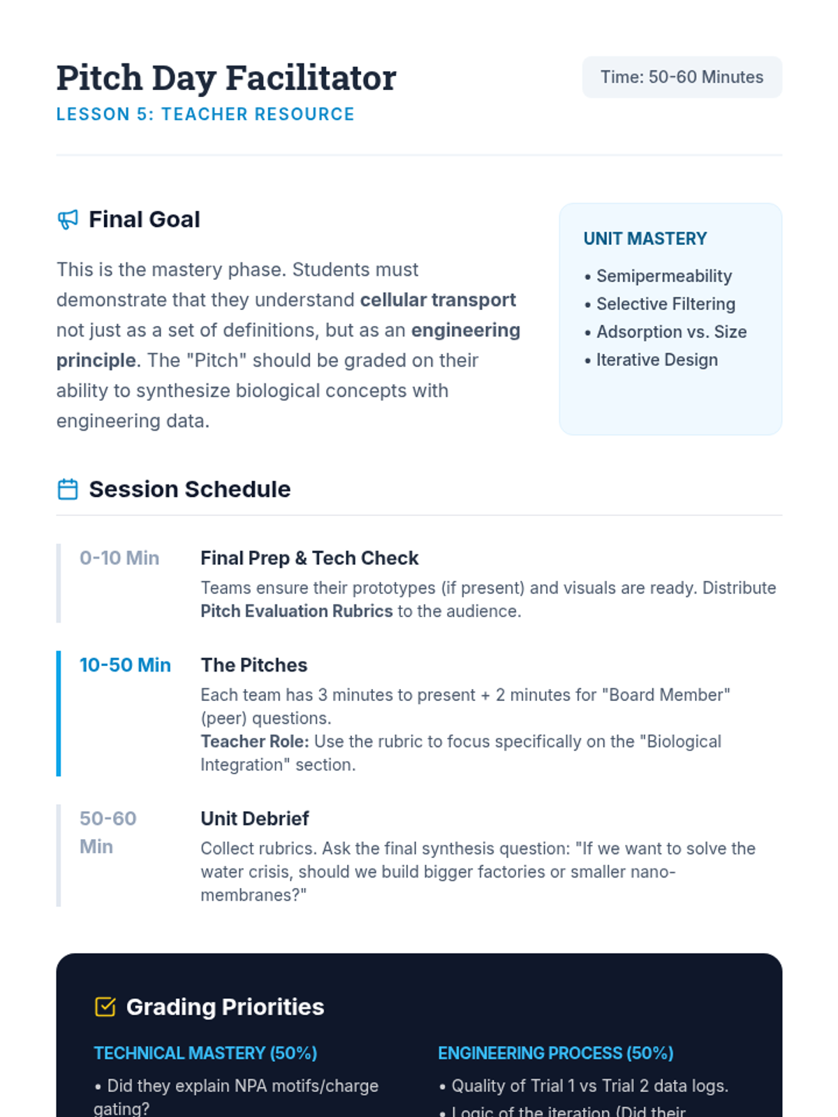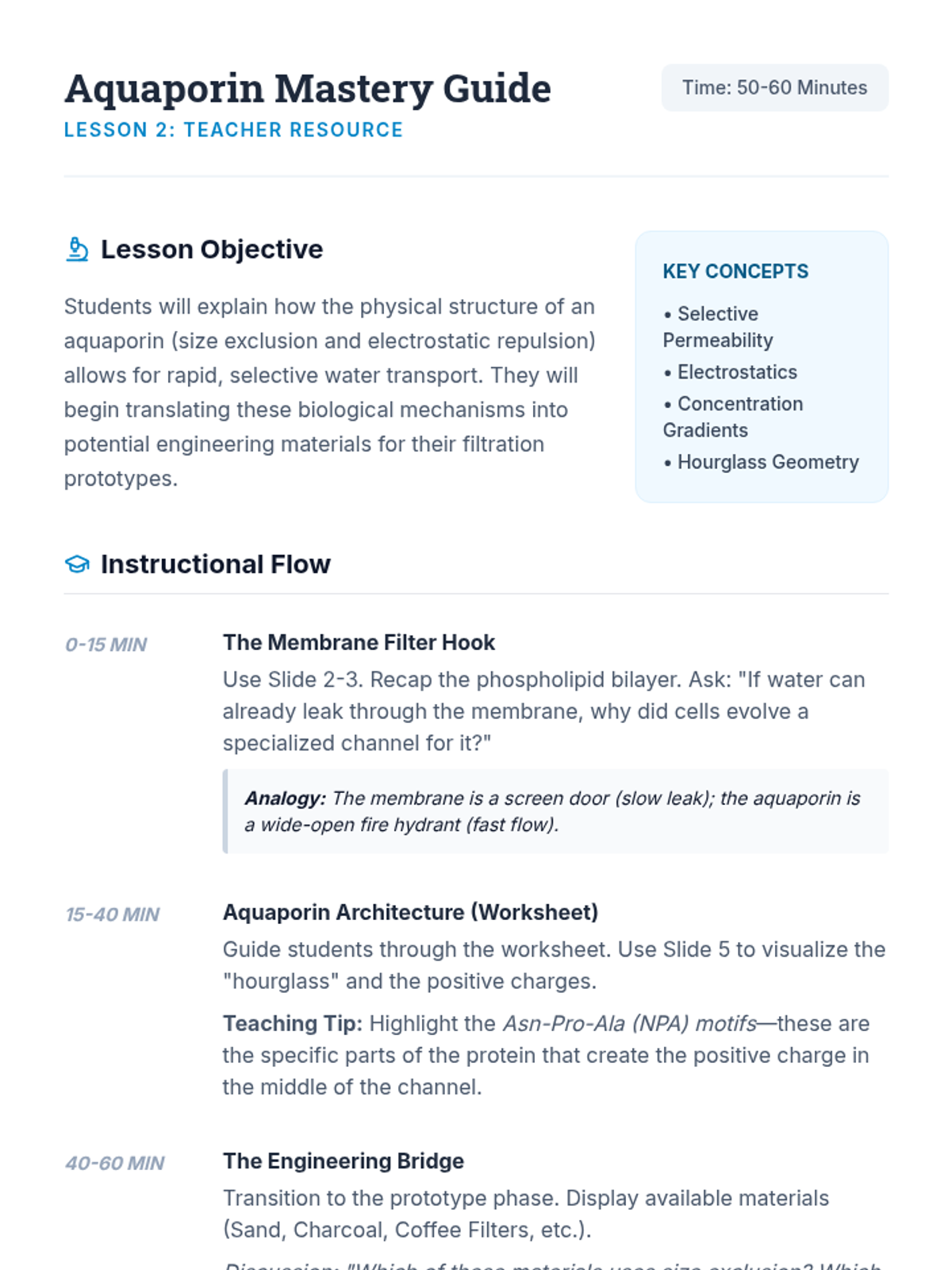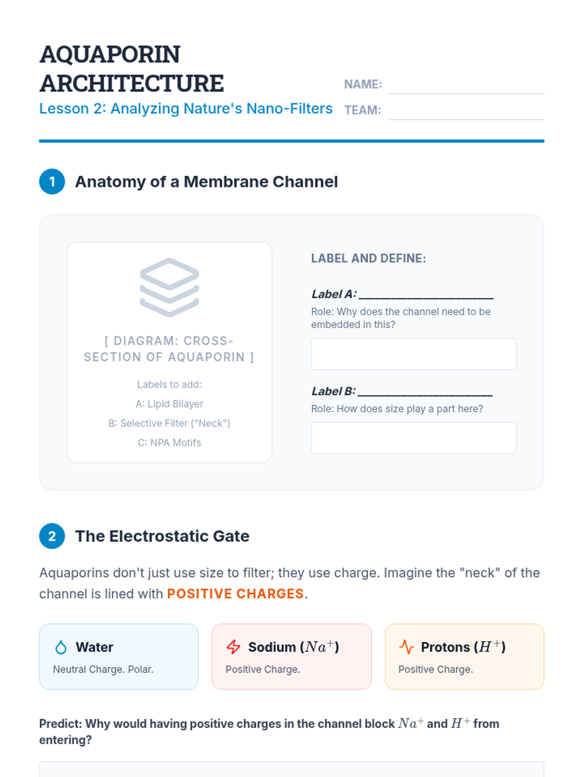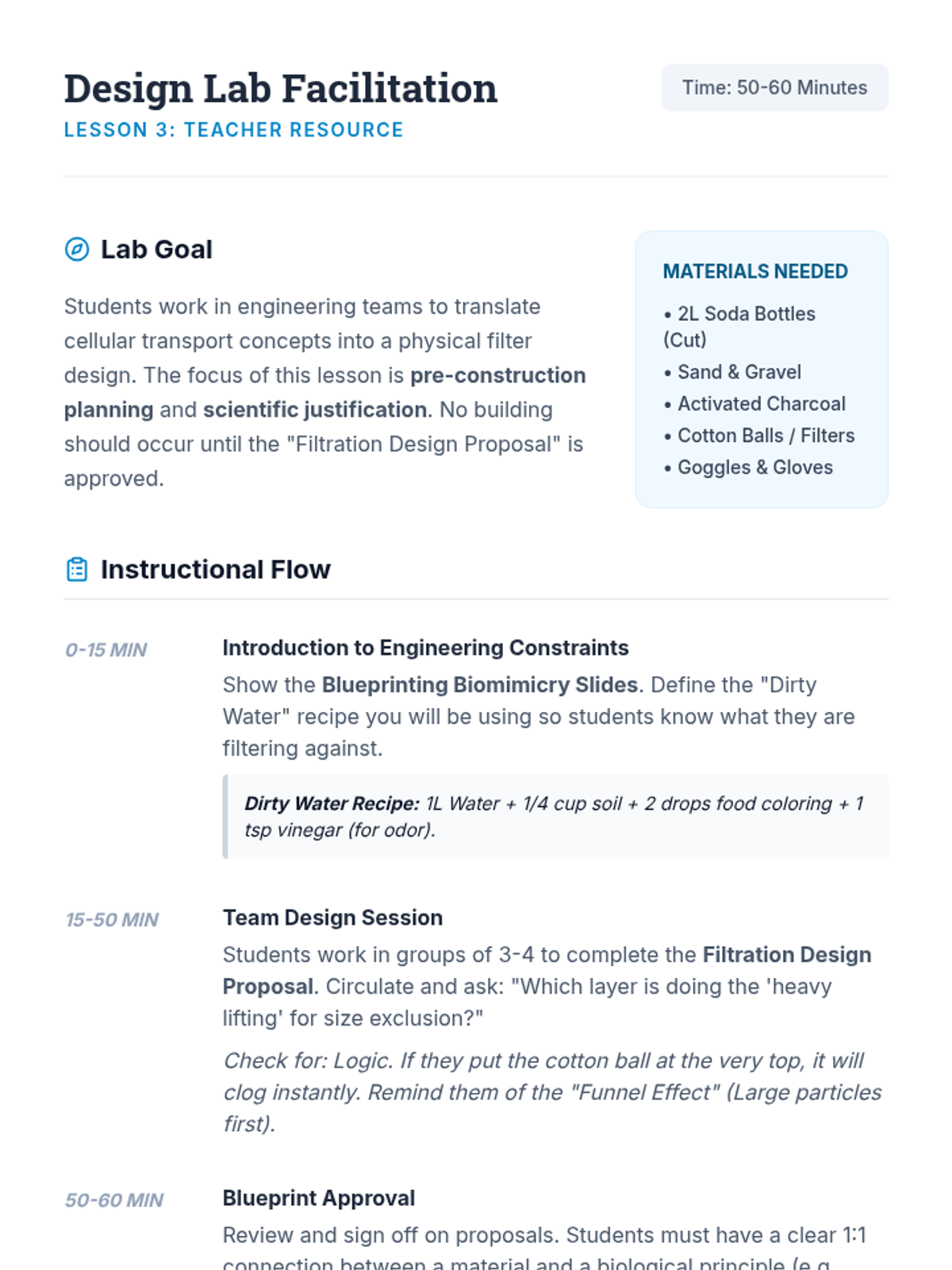 A 9th-grade biology sequence exploring cellular transport through the lens of biomimicry and engineering. Students investigate the global water crisis, analyze the efficiency of aquaporins, and design, test, and pitch their own biomimetic water filtration prototypes.