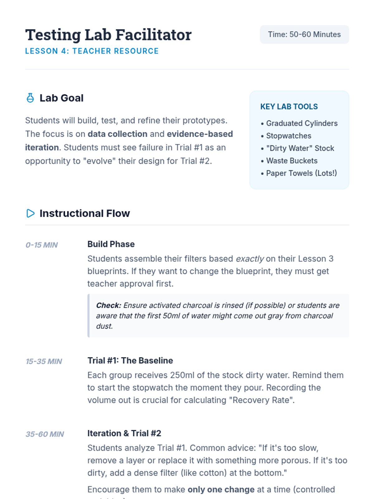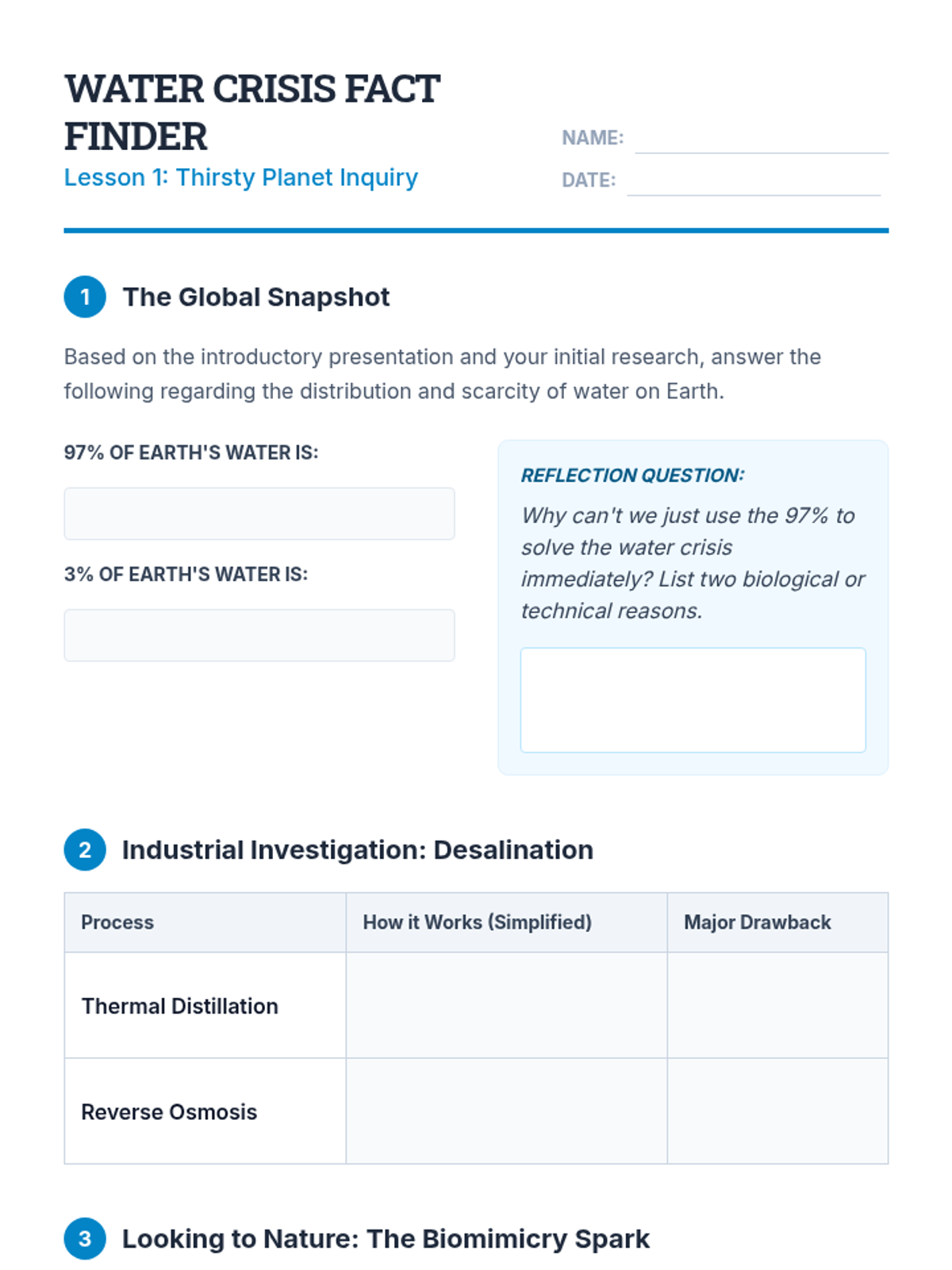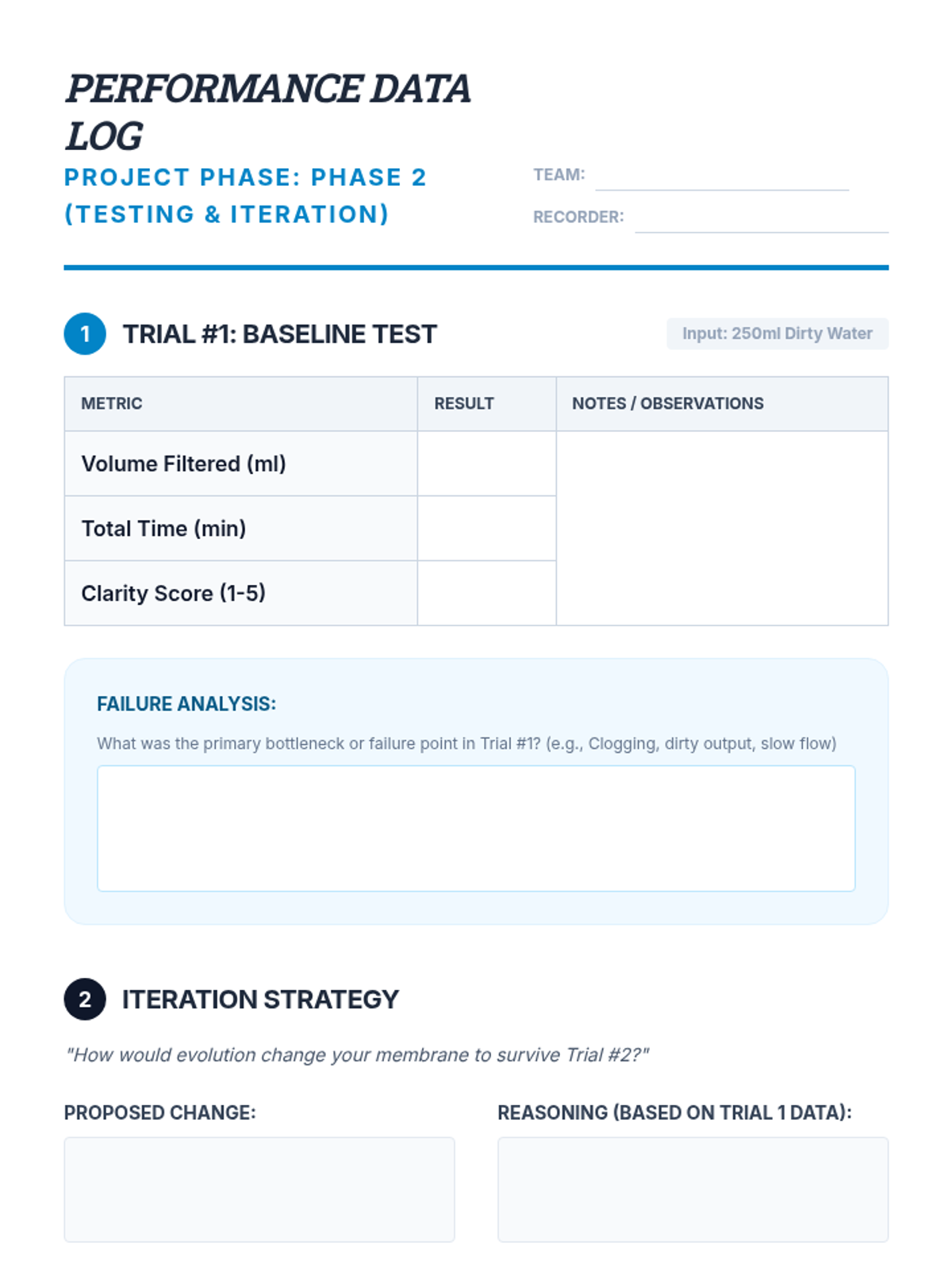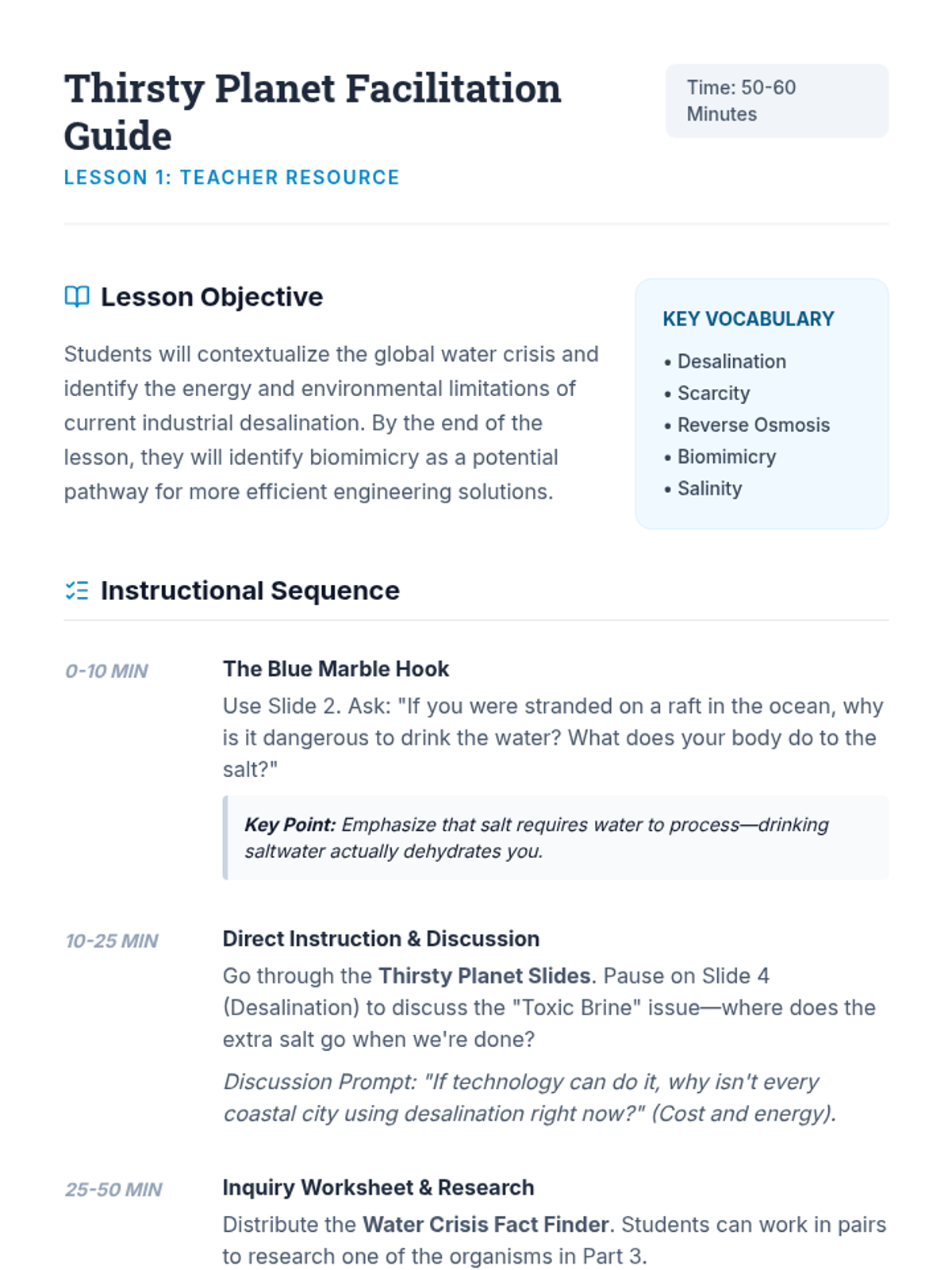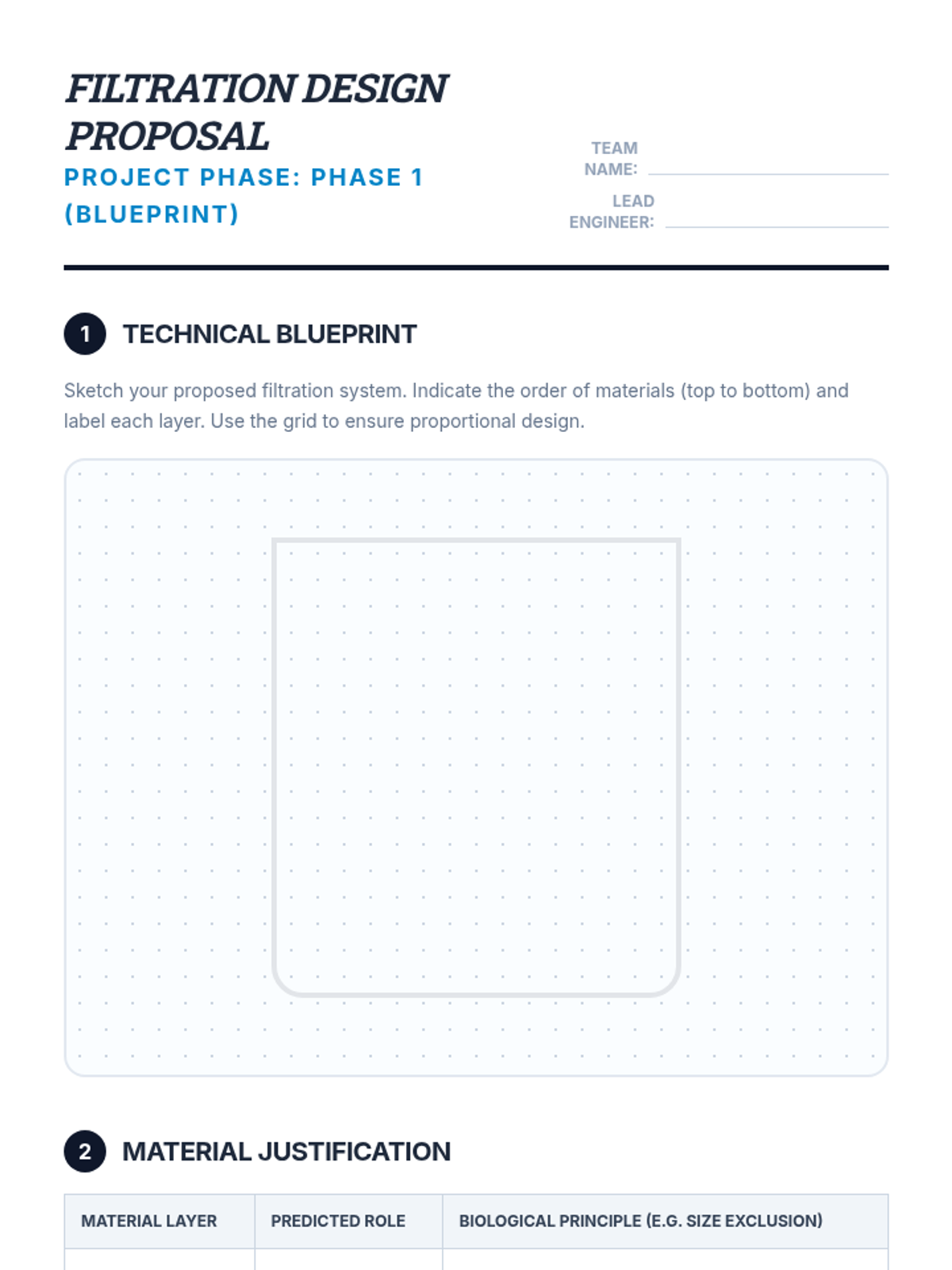A 9th-grade biology sequence exploring cellular transport through the lens of biomimicry and engineering. Students investigate the global water crisis, analyze the efficiency of aquaporins, and design, test, and pitch their own biomimetic water filtration prototypes.