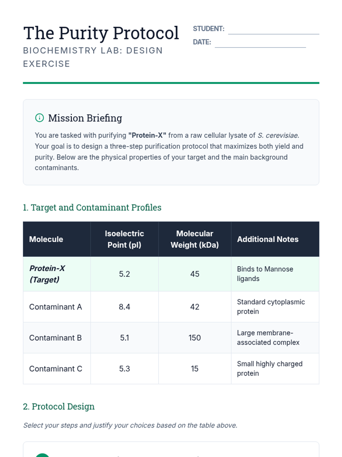 A comprehensive sequence for undergraduate biochemistry students focused on the practical and theoretical aspects of biomolecule isolation, structural analysis, and quantitative measurement. Students progress from separation techniques like chromatography and electrophoresis to high-resolution structural determination using X-ray and NMR, mass spectrometry sequencing, and the design of robust quantitative assays.