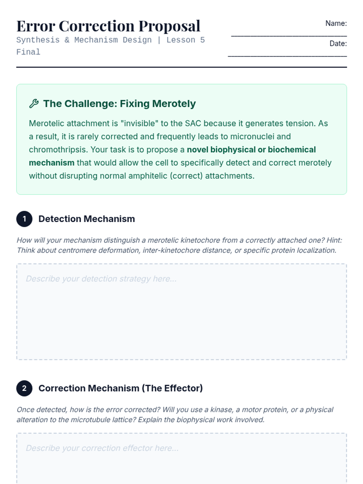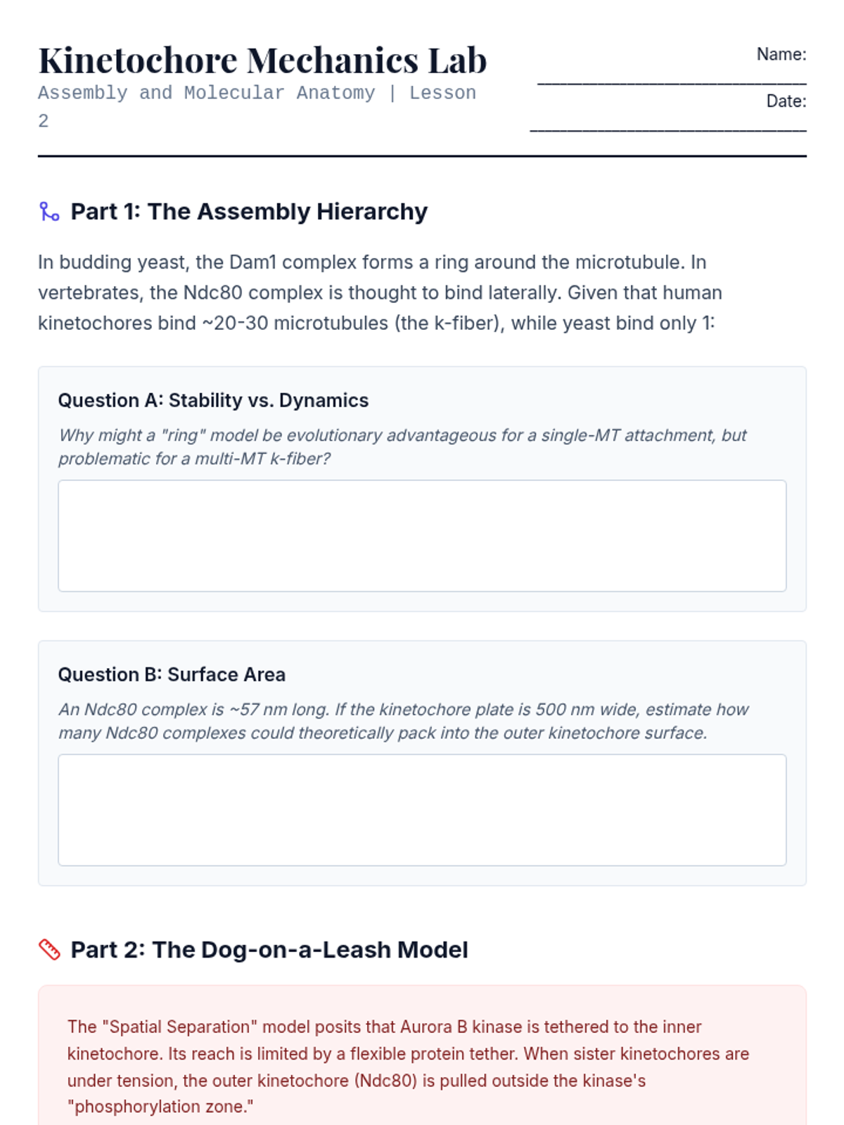 A graduate-level investigation into the biophysics of chromosome segregation, focusing on the mechanical forces, molecular assembly, and signaling pathways that prevent aneuploidy and chromosomal instability.