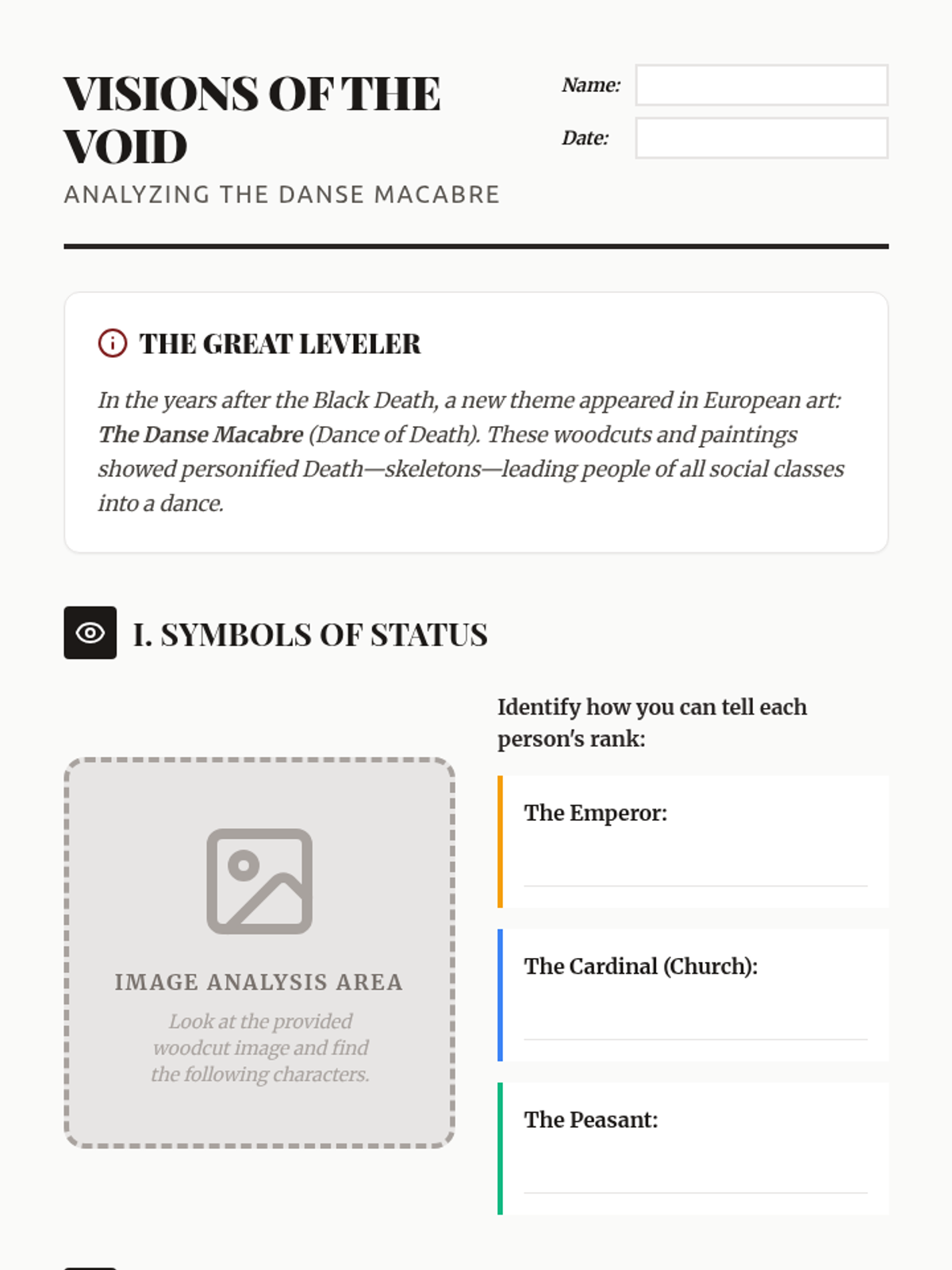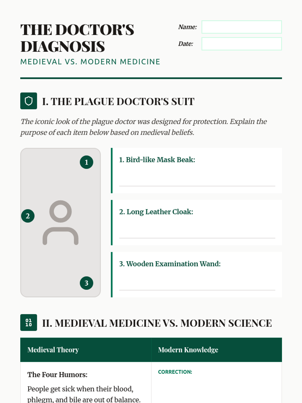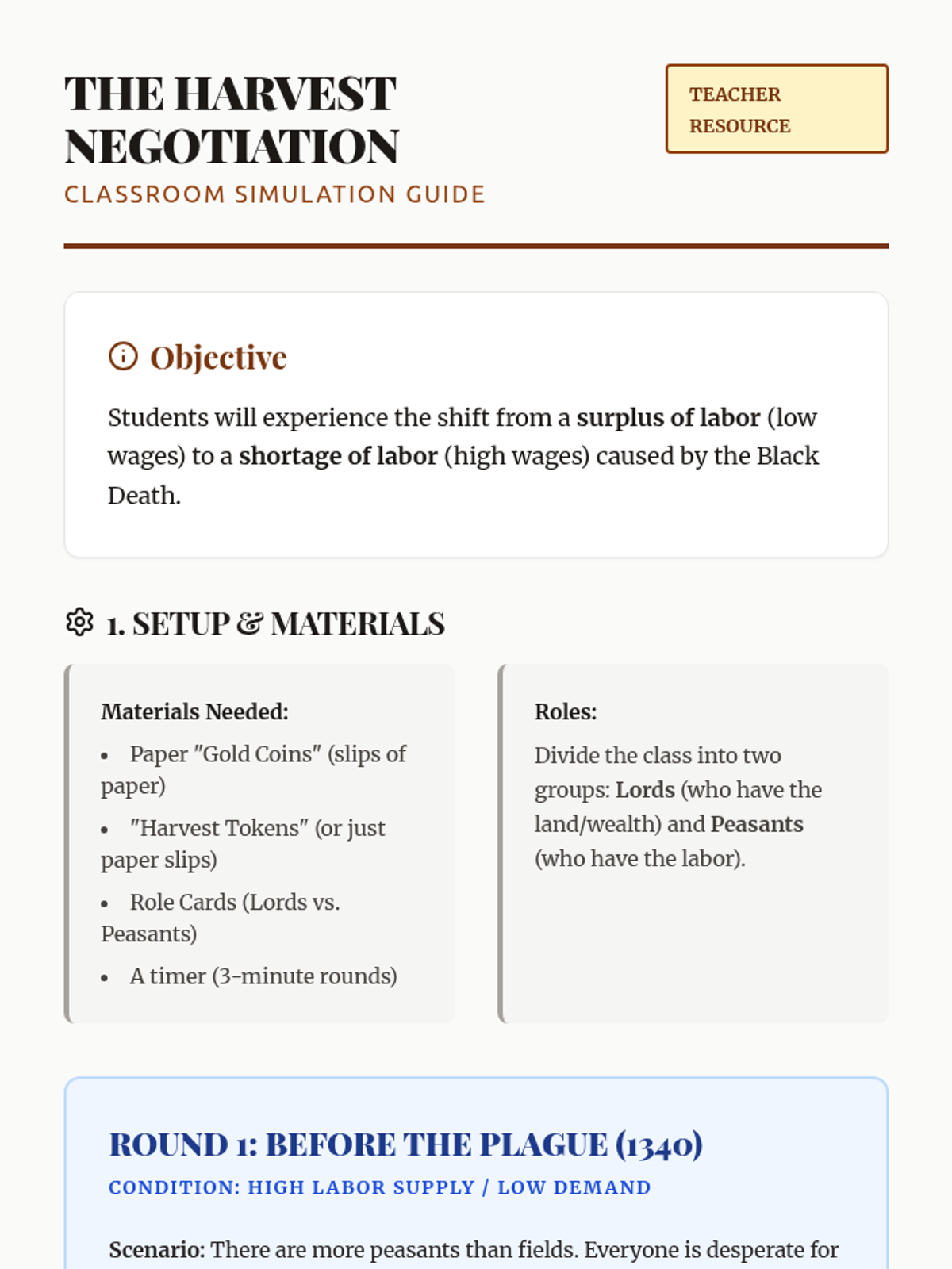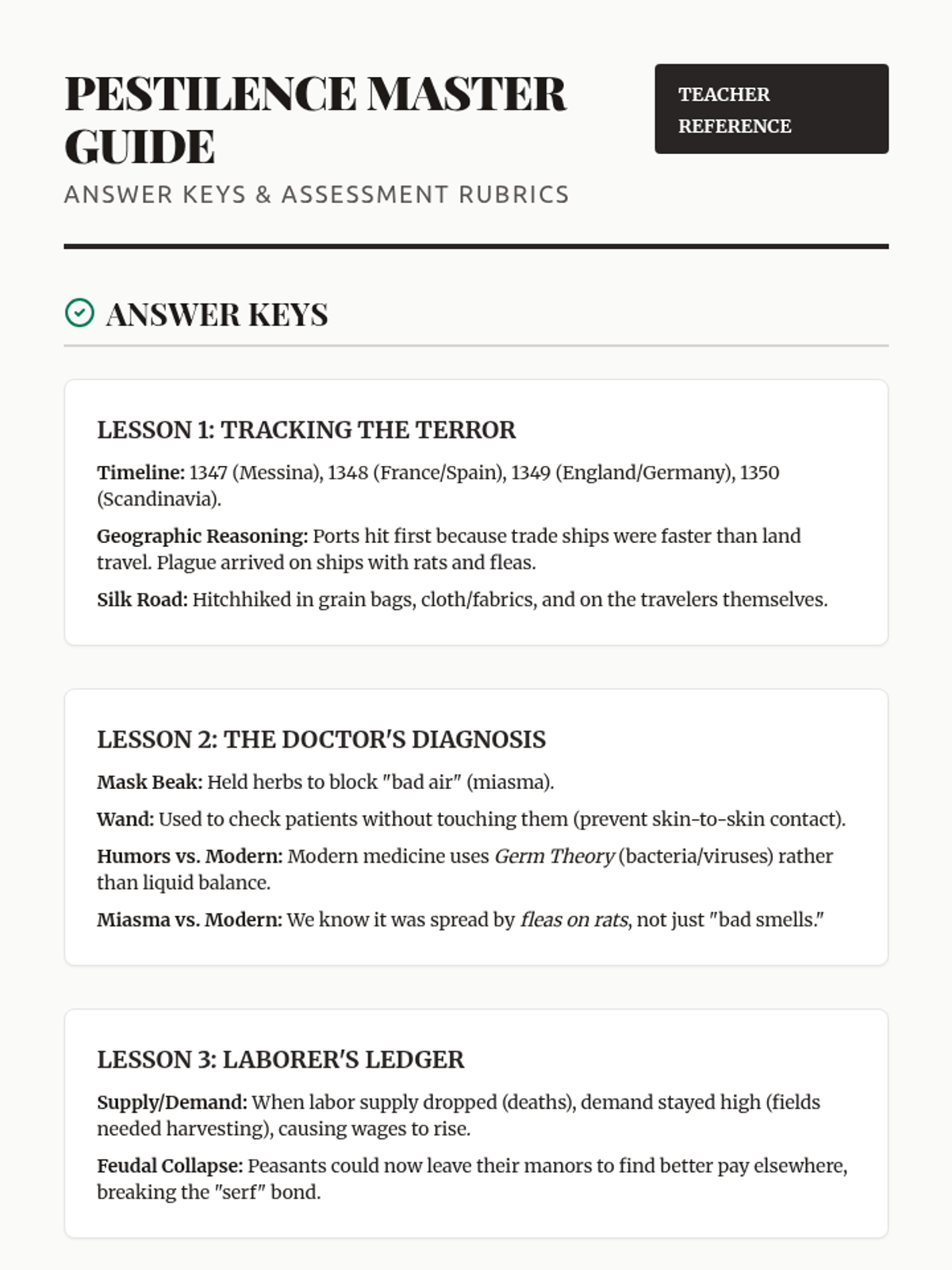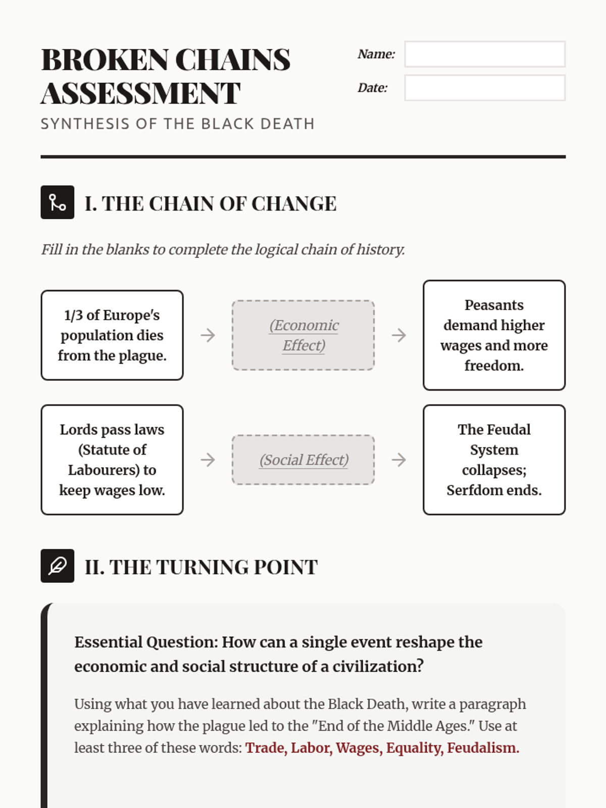 This sequence explores the arrival, spread, and transformative impact of the Black Death on medieval Europe. Students analyze geographic routes, compare medieval and modern medicine, simulate economic shifts, and evaluate how the pandemic triggered the collapse of the feudal system.