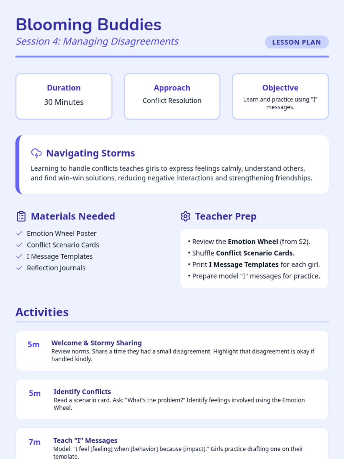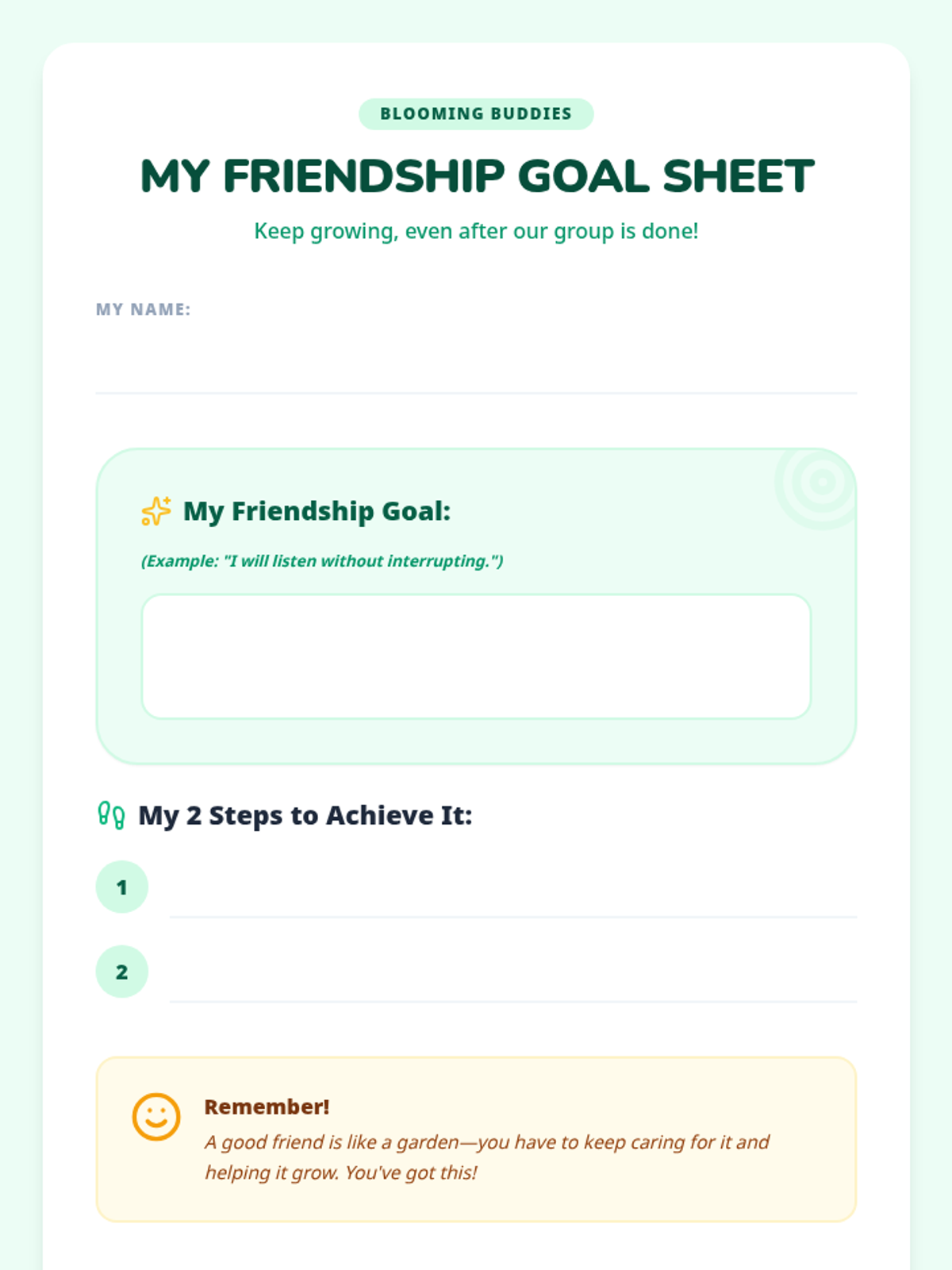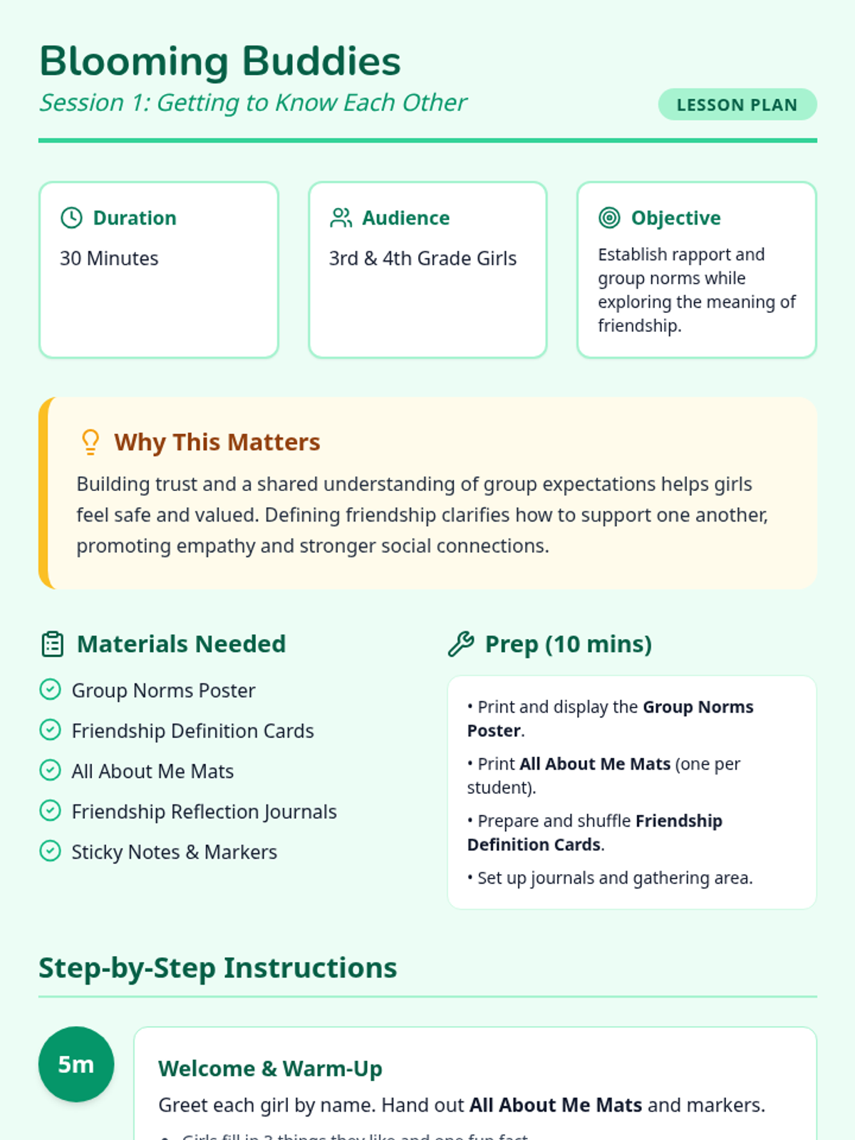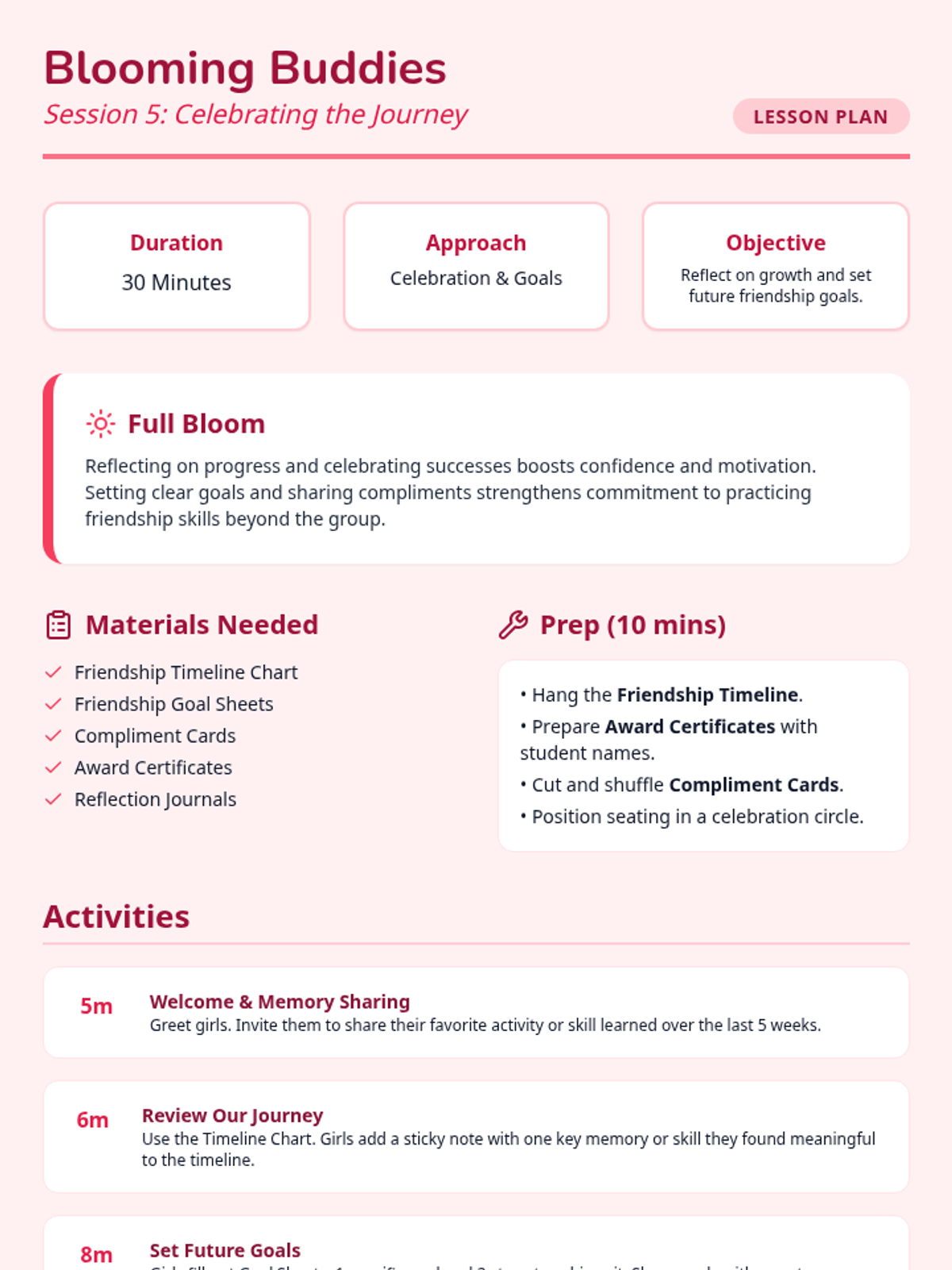 A 5-session friendship skills group for 3rd and 4th grade girls, focusing on empathy, communication, cooperation, and conflict resolution through a 'blooming' garden theme.