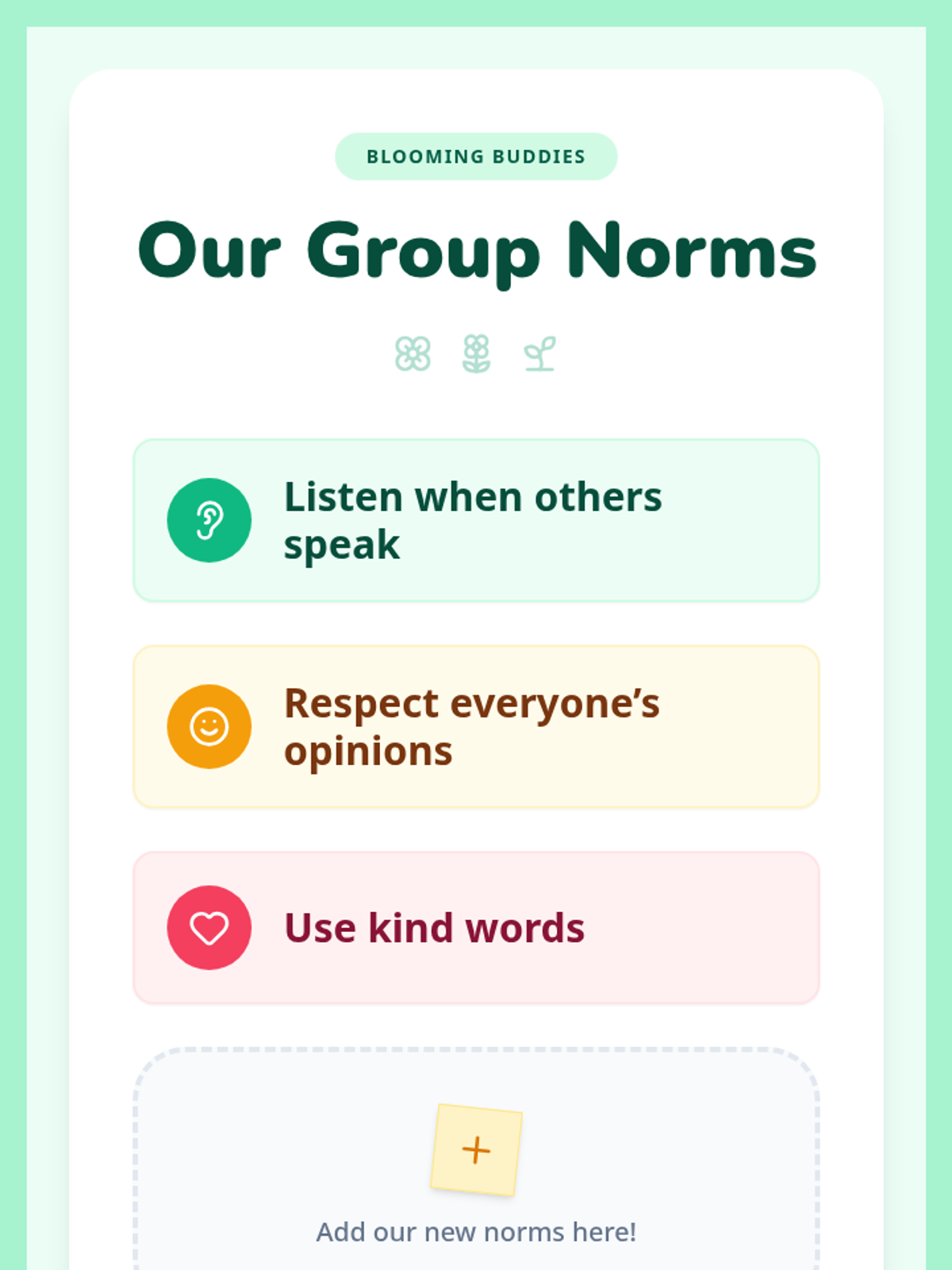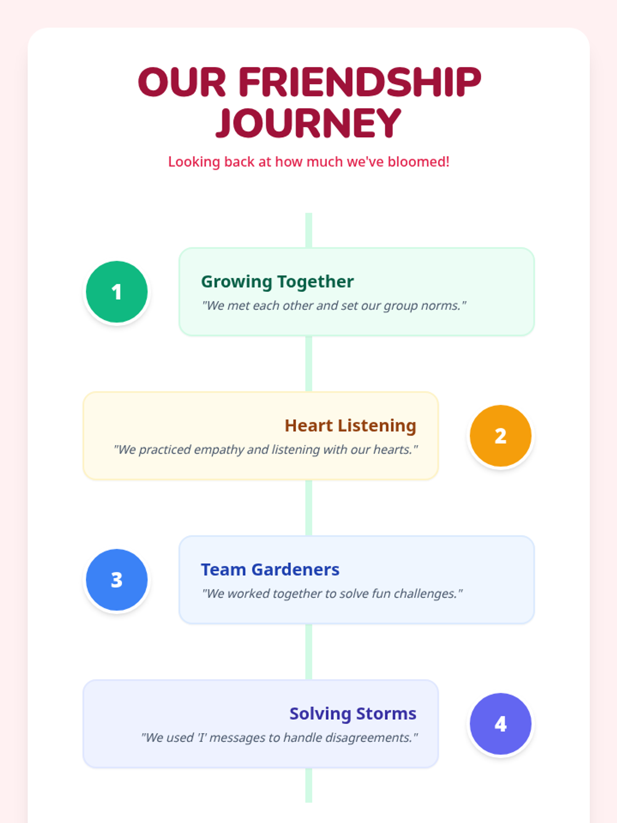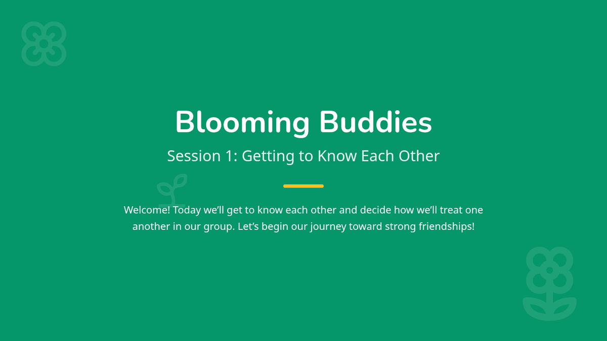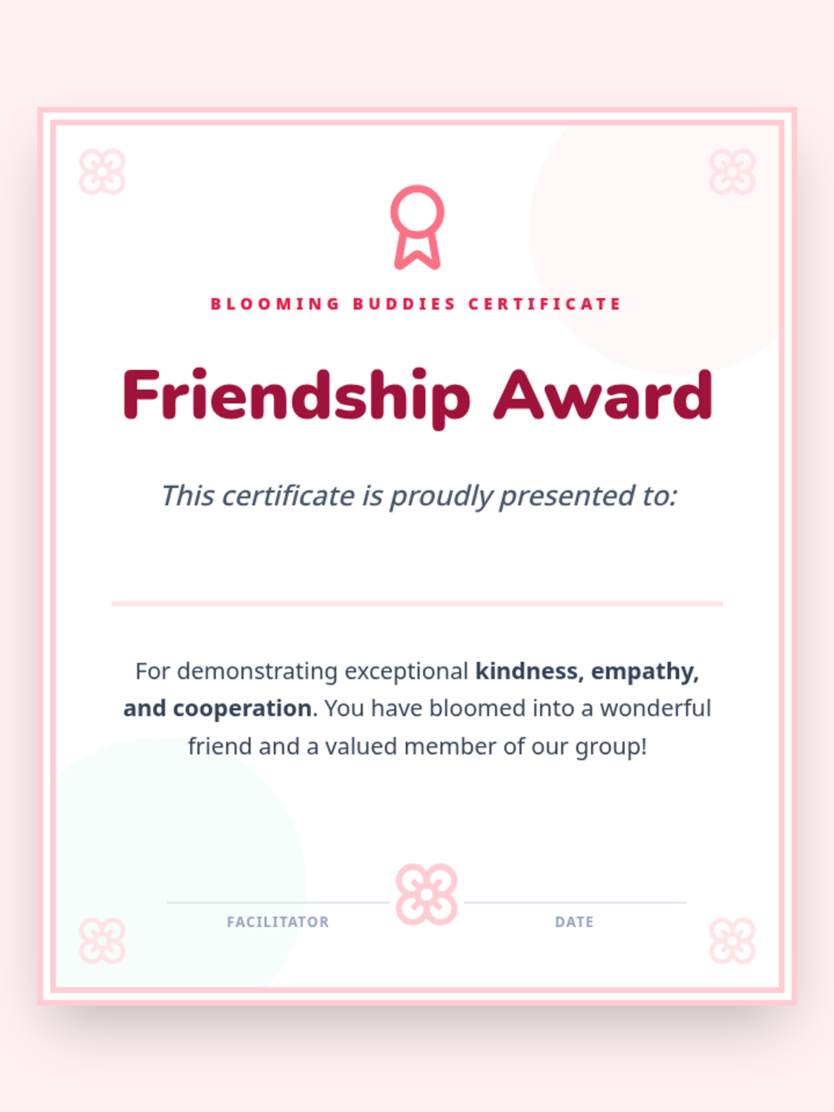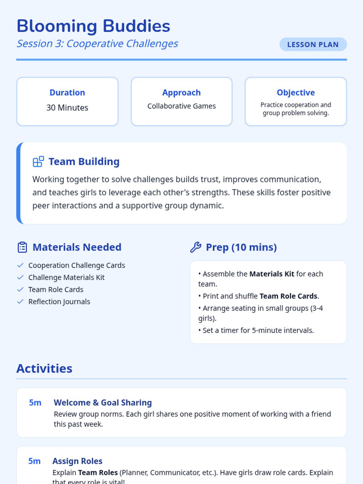 A 5-session friendship skills group for 3rd and 4th grade girls, focusing on empathy, communication, cooperation, and conflict resolution through a 'blooming' garden theme.