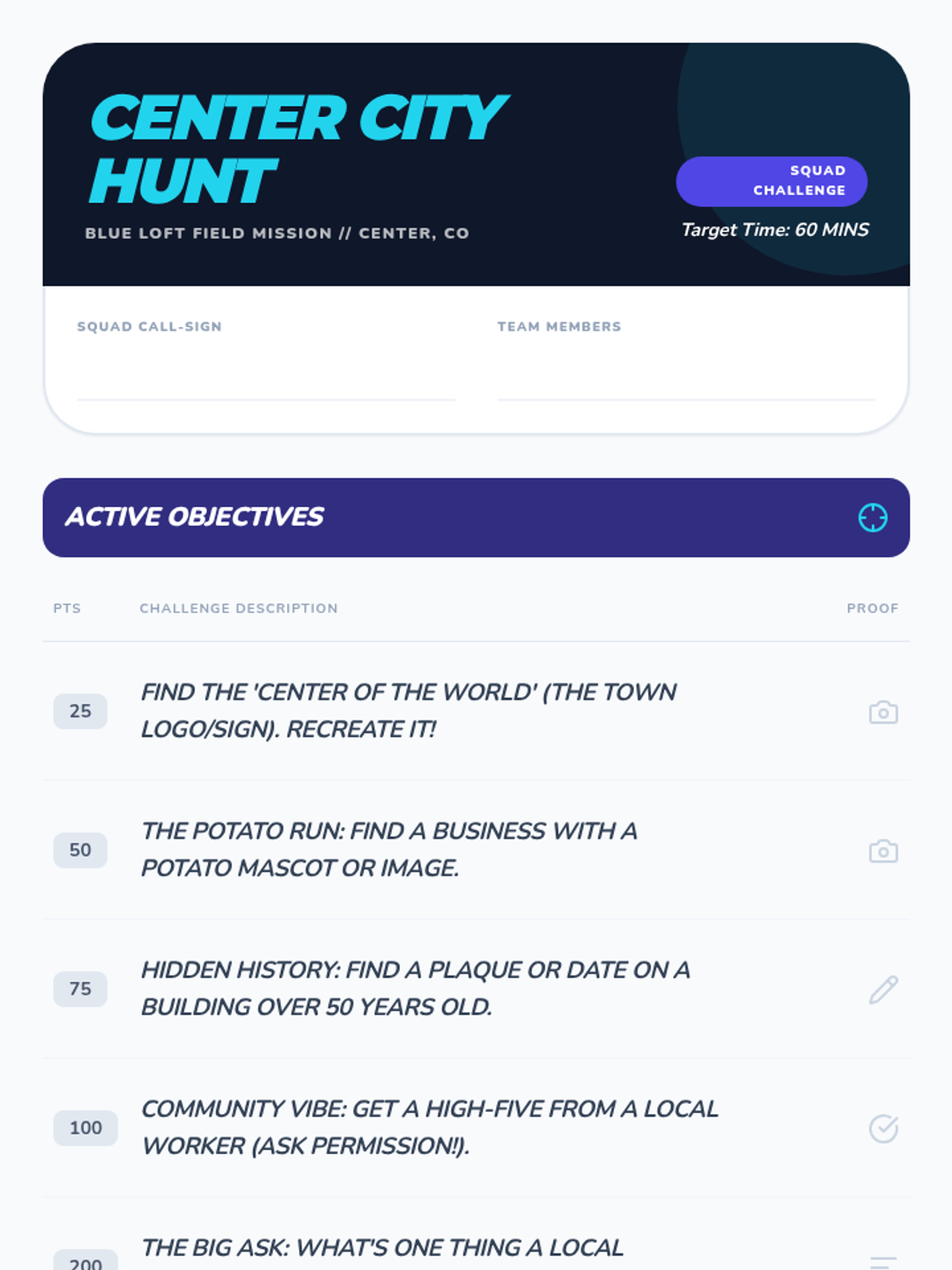A series of engaging after-school activities for the Blue Loft teen center, focusing on community building, gaming, art, and local exploration in Center, Colorado.