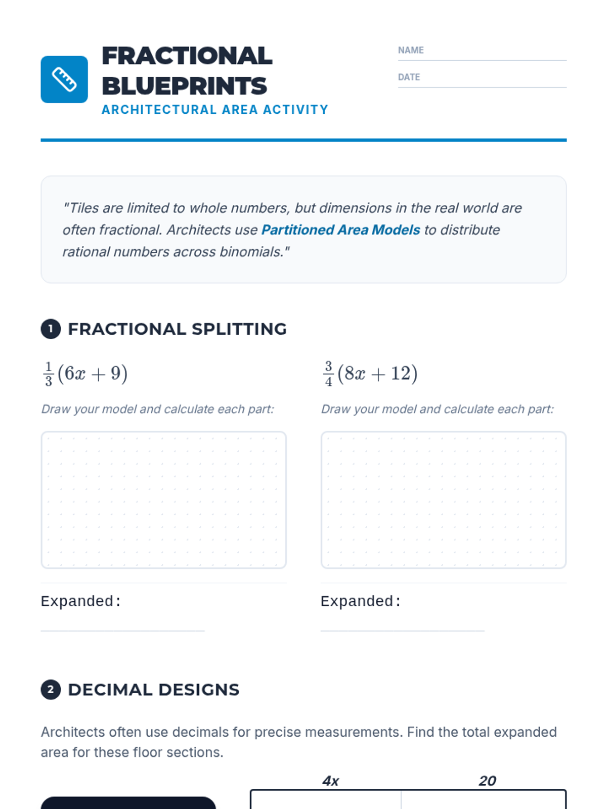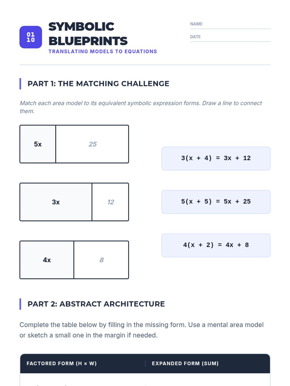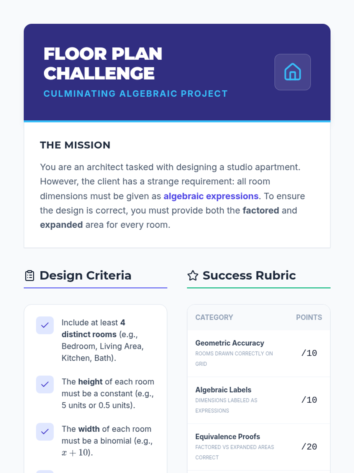 A 5-lesson sequence for 8th-grade algebra that uses geometric area models to teach equivalent expressions, distributive property, and factoring. Students move from concrete algebra tiles to abstract symbolic manipulation, culminating in an architectural design project.