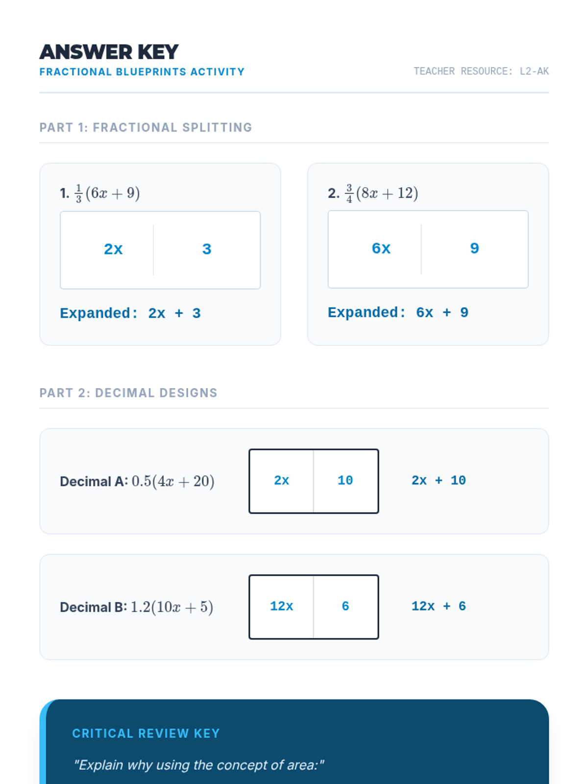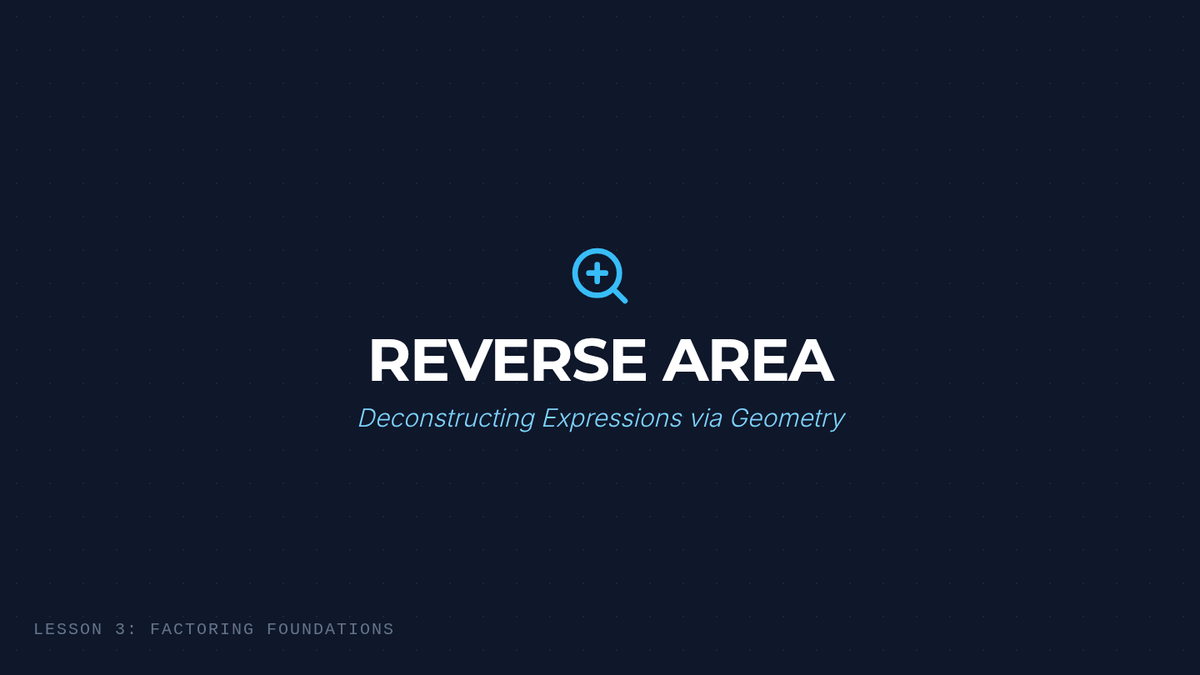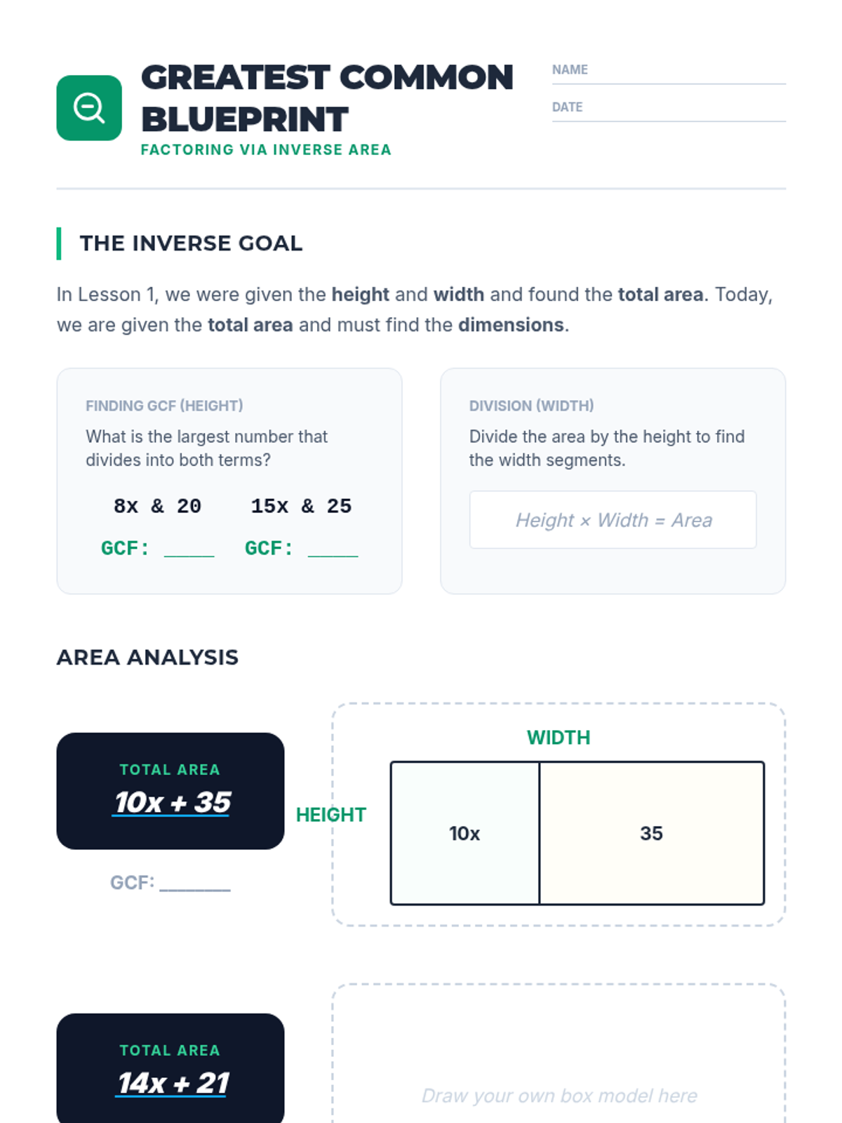 A 5-lesson sequence for 8th-grade algebra that uses geometric area models to teach equivalent expressions, distributive property, and factoring. Students move from concrete algebra tiles to abstract symbolic manipulation, culminating in an architectural design project.