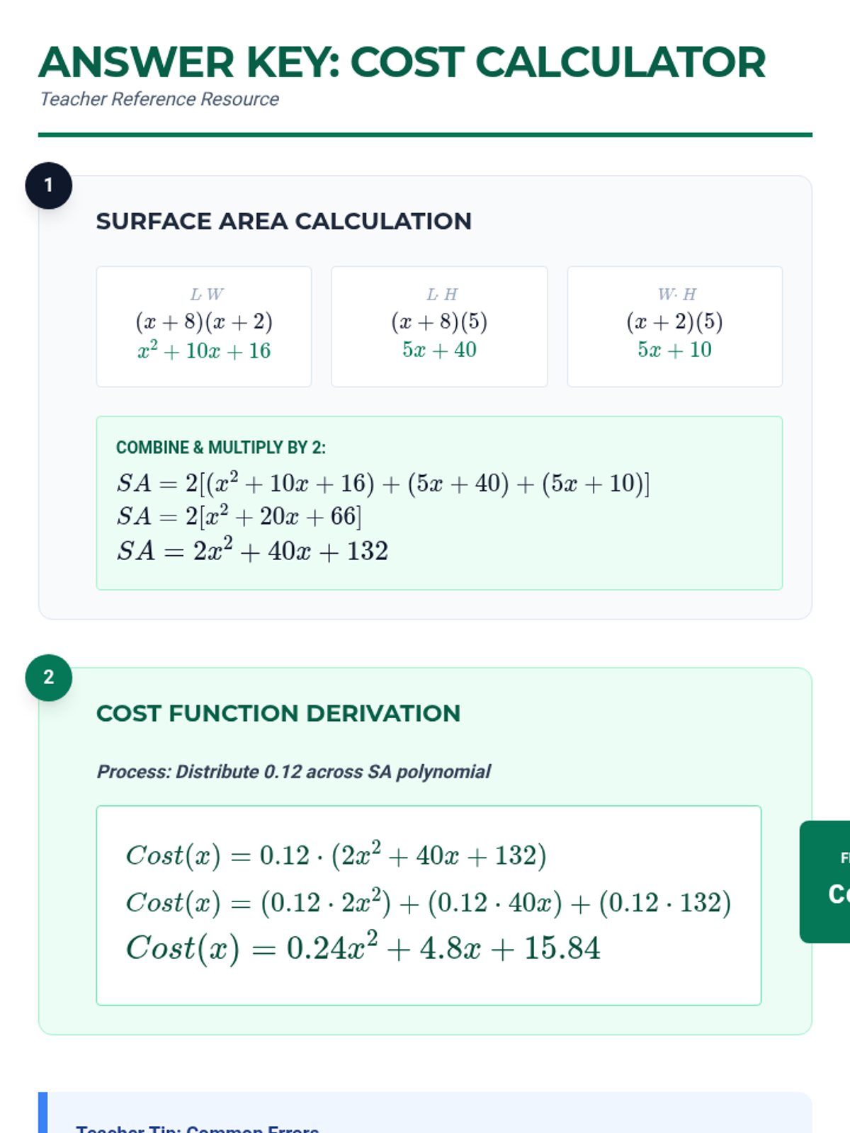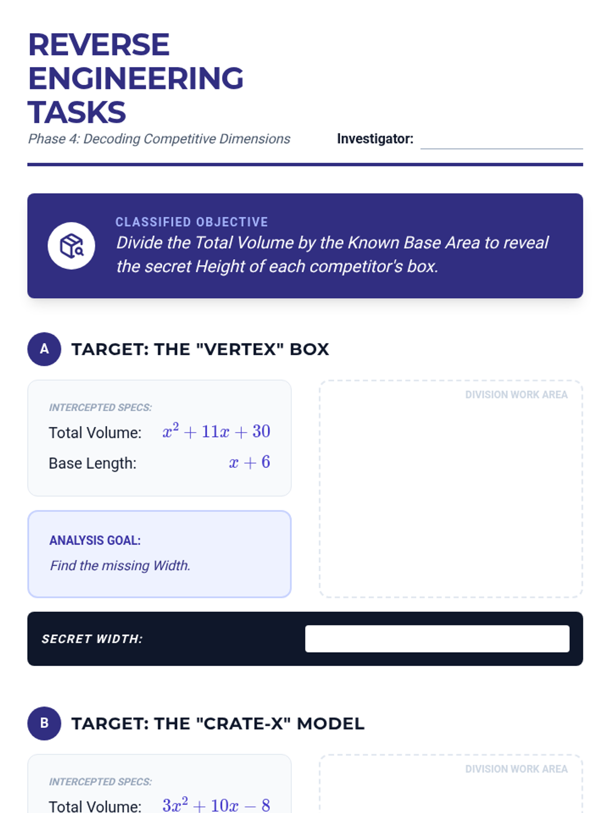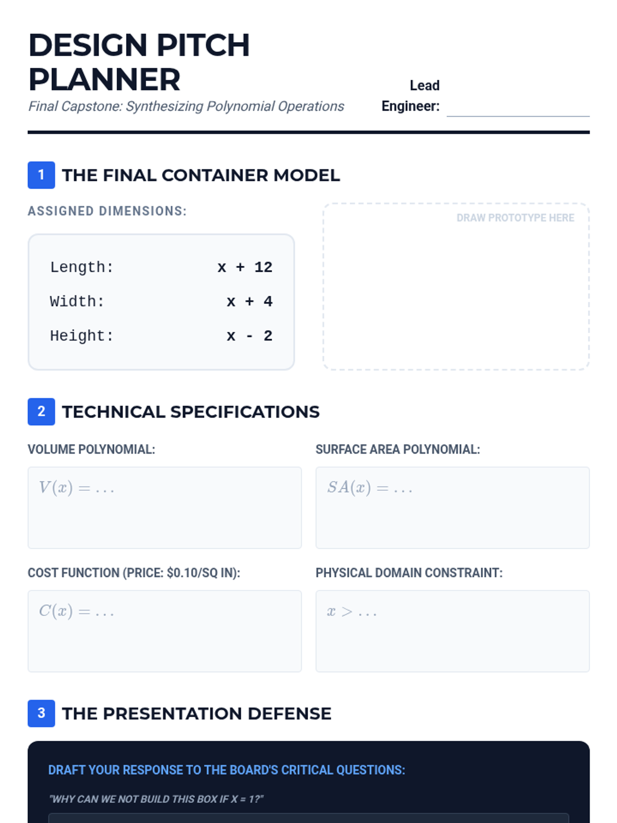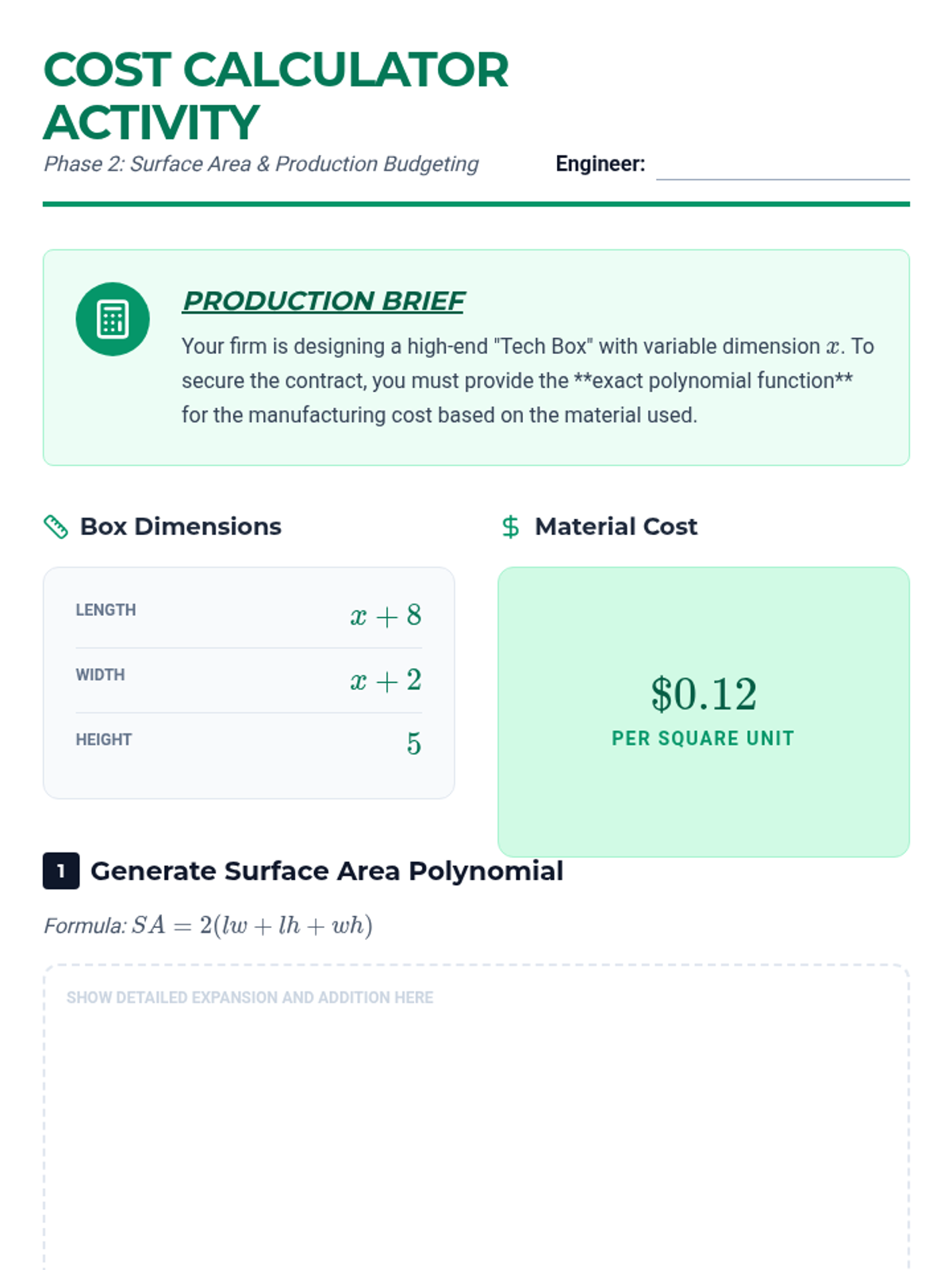 Students act as packaging engineers, using polynomial operations to design and analyze 3D containers. They will master adding, subtracting, multiplying, and dividing polynomials through the lens of geometric modeling and cost analysis.