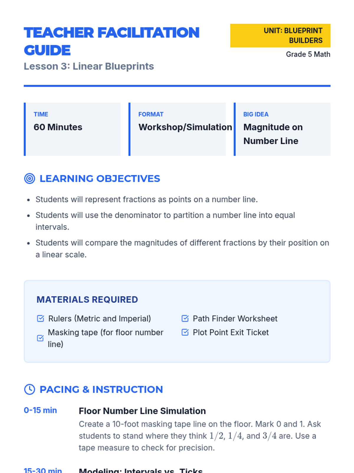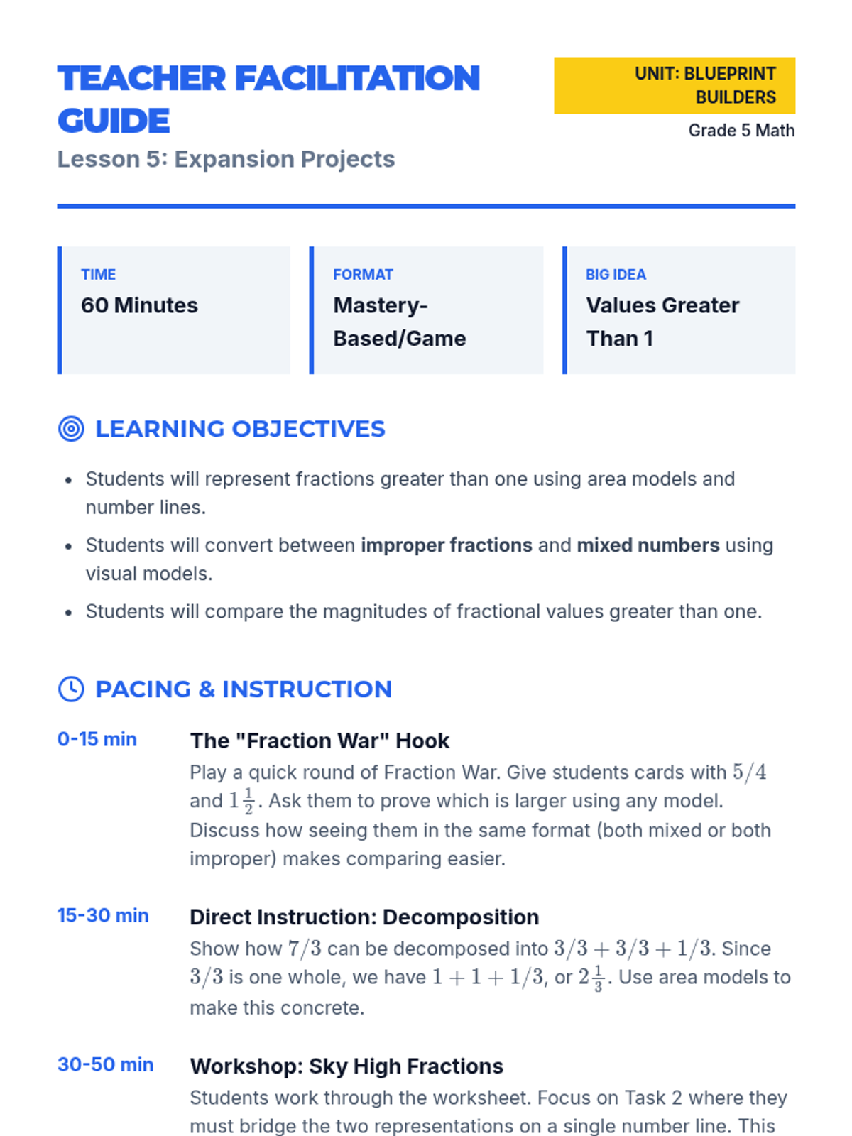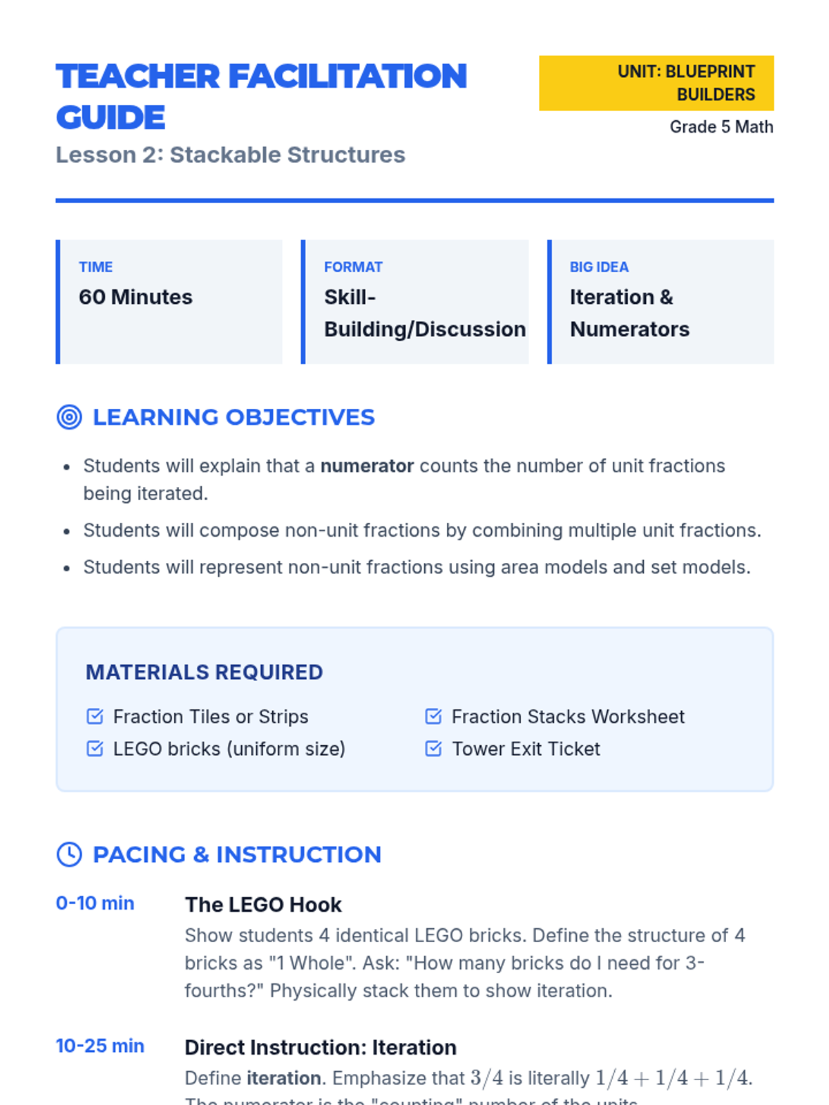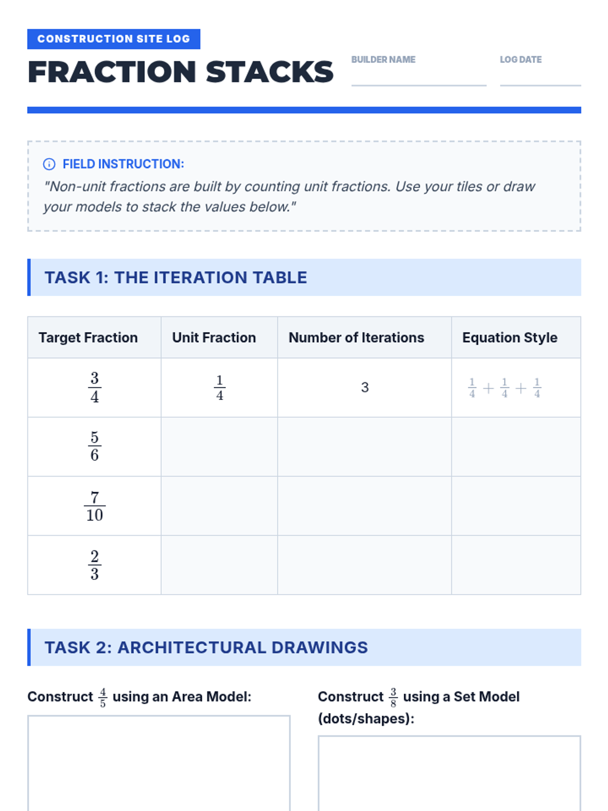 This sequence strengthens student understanding of fractions as numbers through a rigorous workshop model designed to solidify foundational concepts before advanced operations. Students progress from identifying unit fractions to constructing complex fractional values using area models, set models, and number lines.