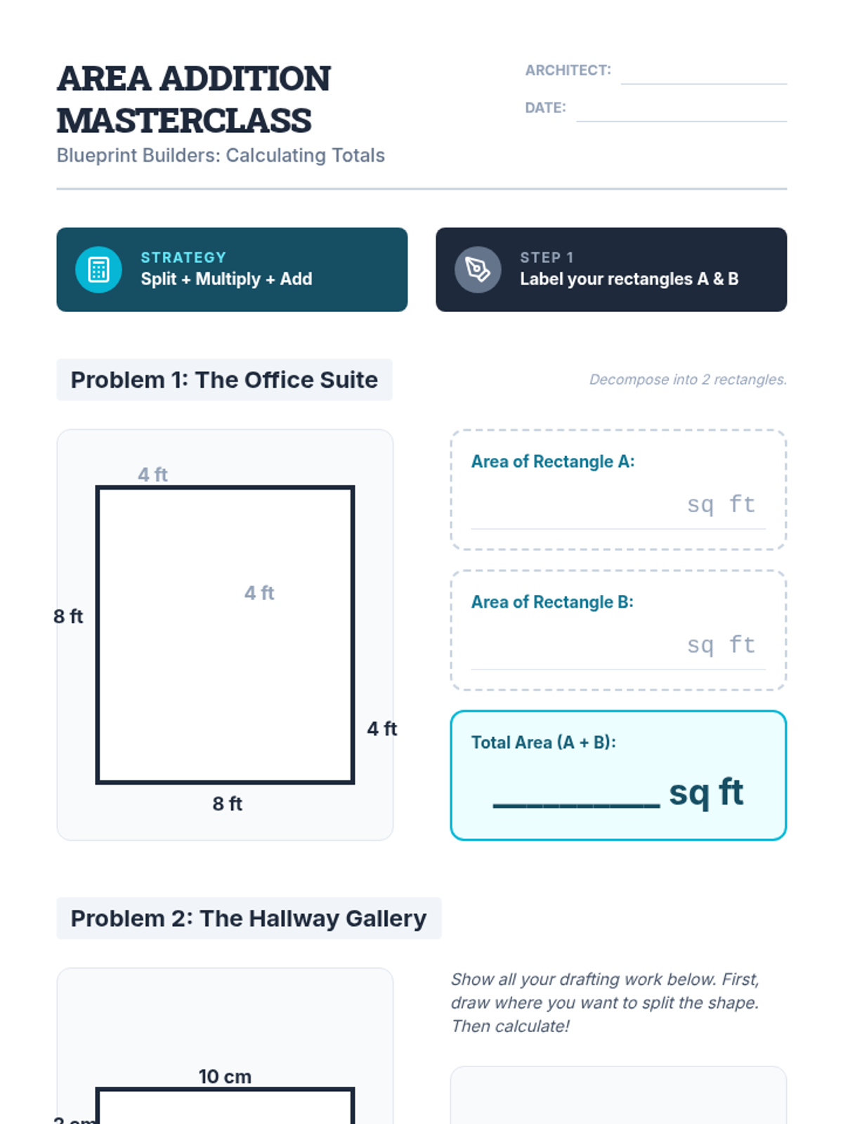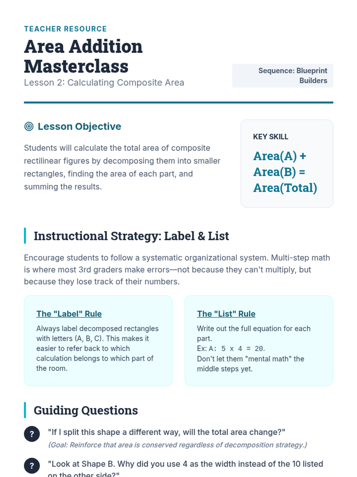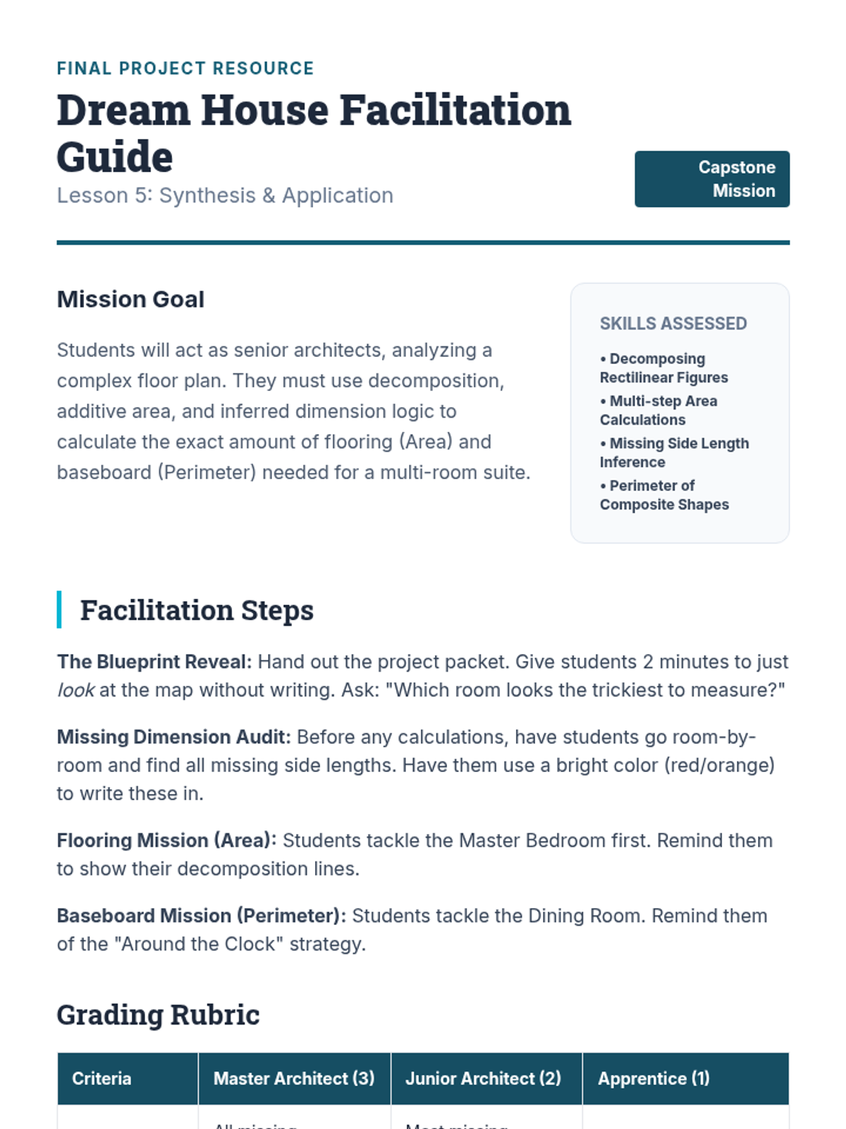 A sequence for 3rd-grade students focused on decomposing composite rectilinear figures to find area and perimeter. Students progress from physical decomposition to multi-step area calculations, logical inference of missing dimensions, and real-world floor plan analysis.