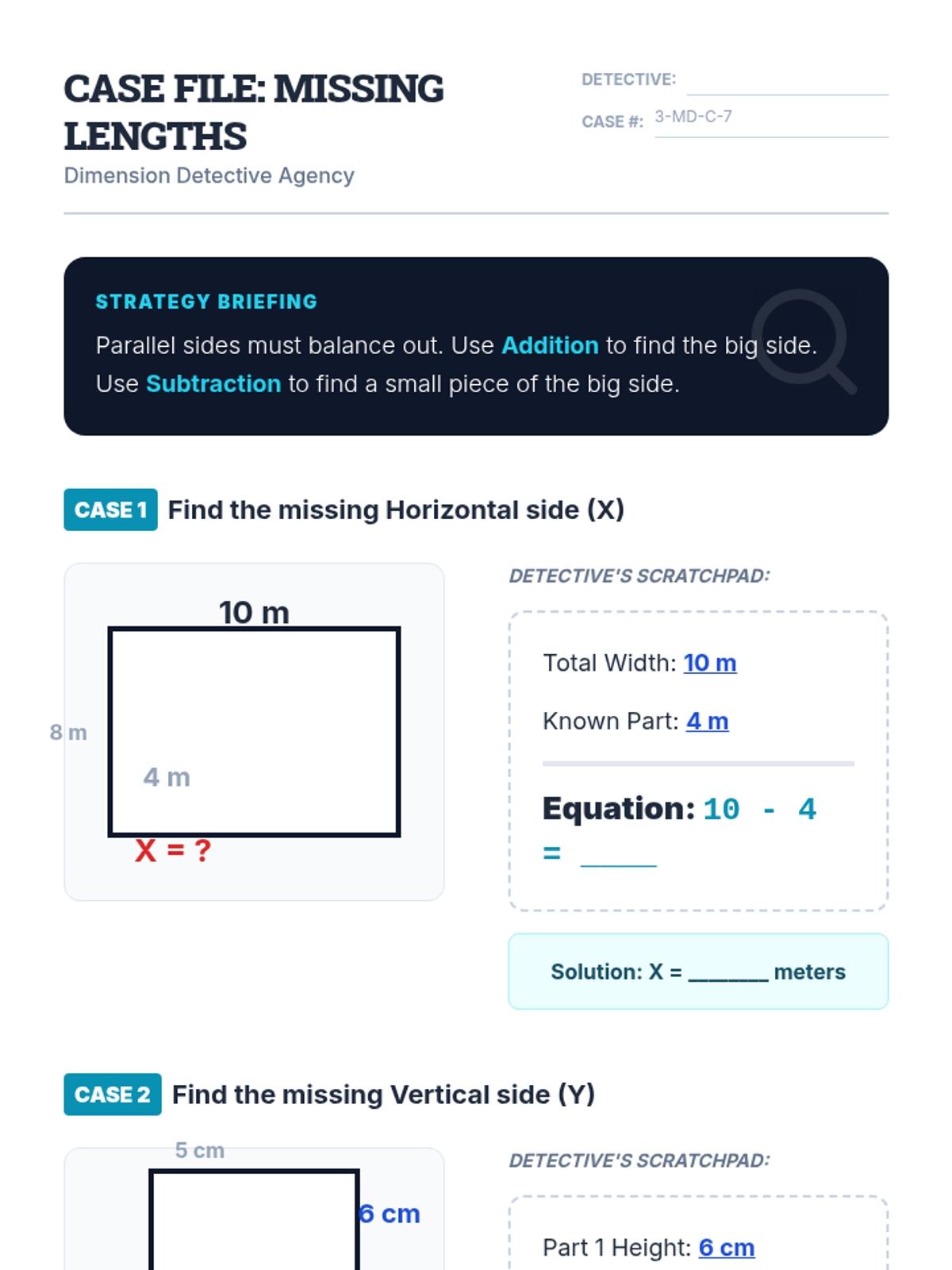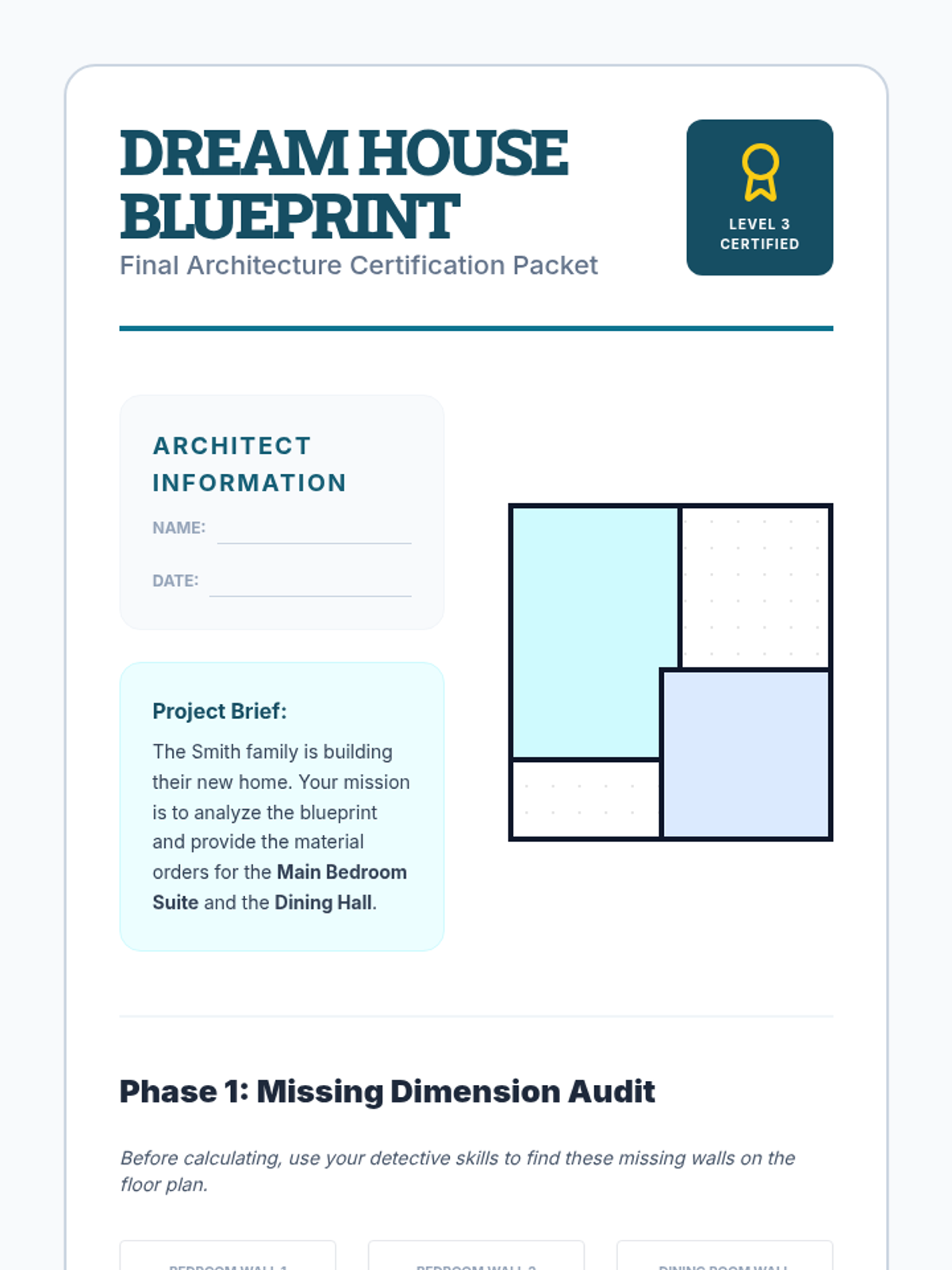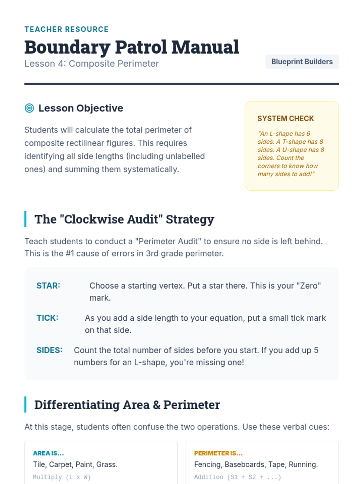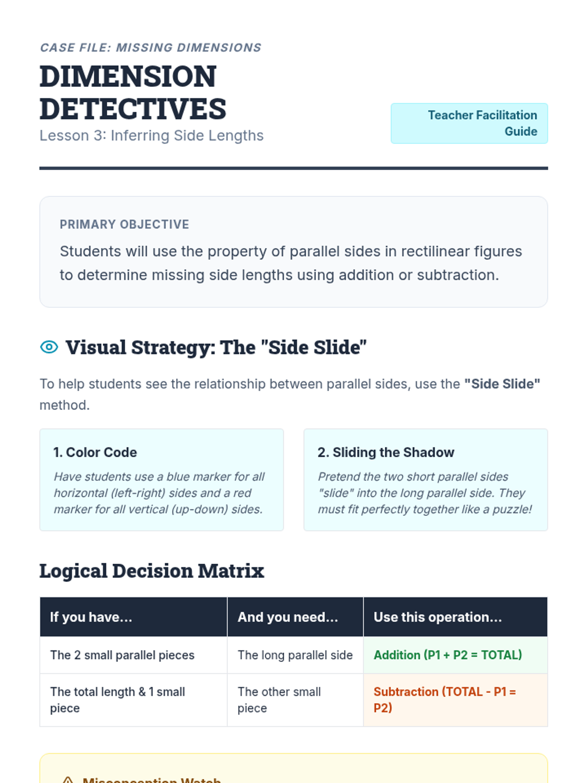 A sequence for 3rd-grade students focused on decomposing composite rectilinear figures to find area and perimeter. Students progress from physical decomposition to multi-step area calculations, logical inference of missing dimensions, and real-world floor plan analysis.