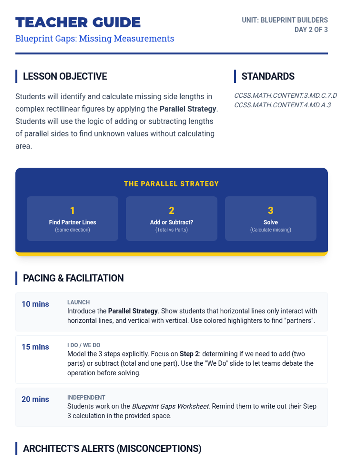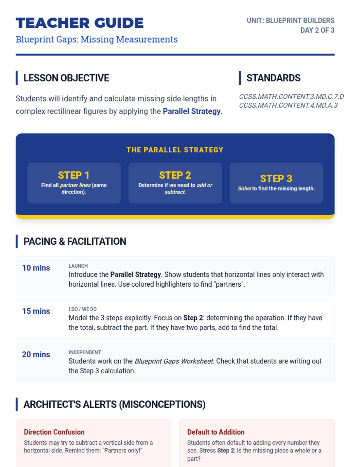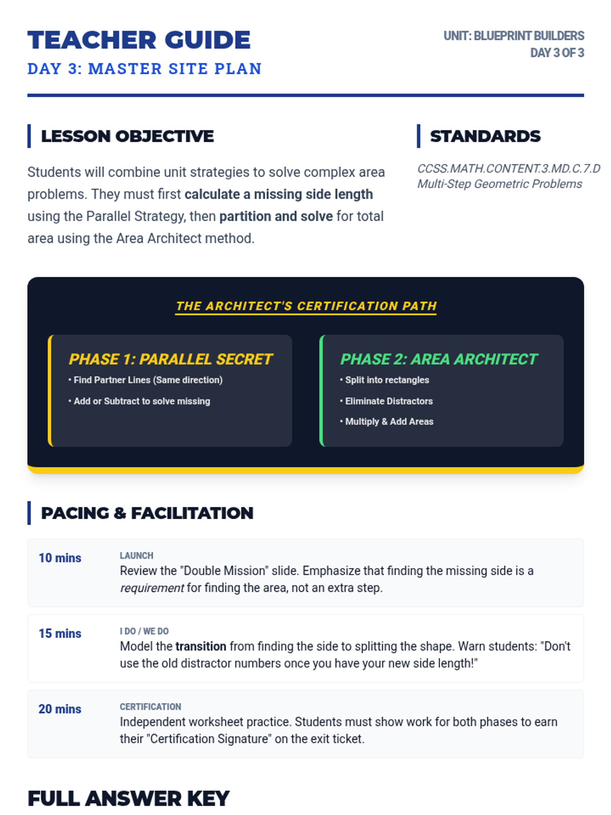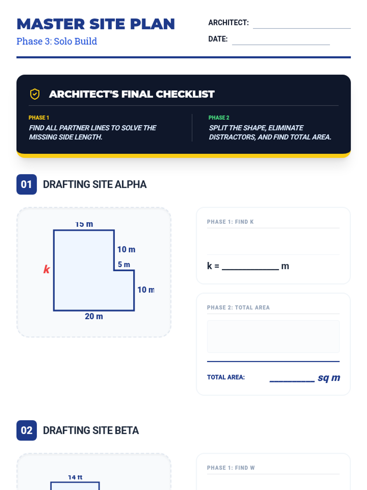 A multi-day math unit on complex rectilinear figures, progressing from finding area with all labels to identifying missing side lengths and solving multi-step problems.