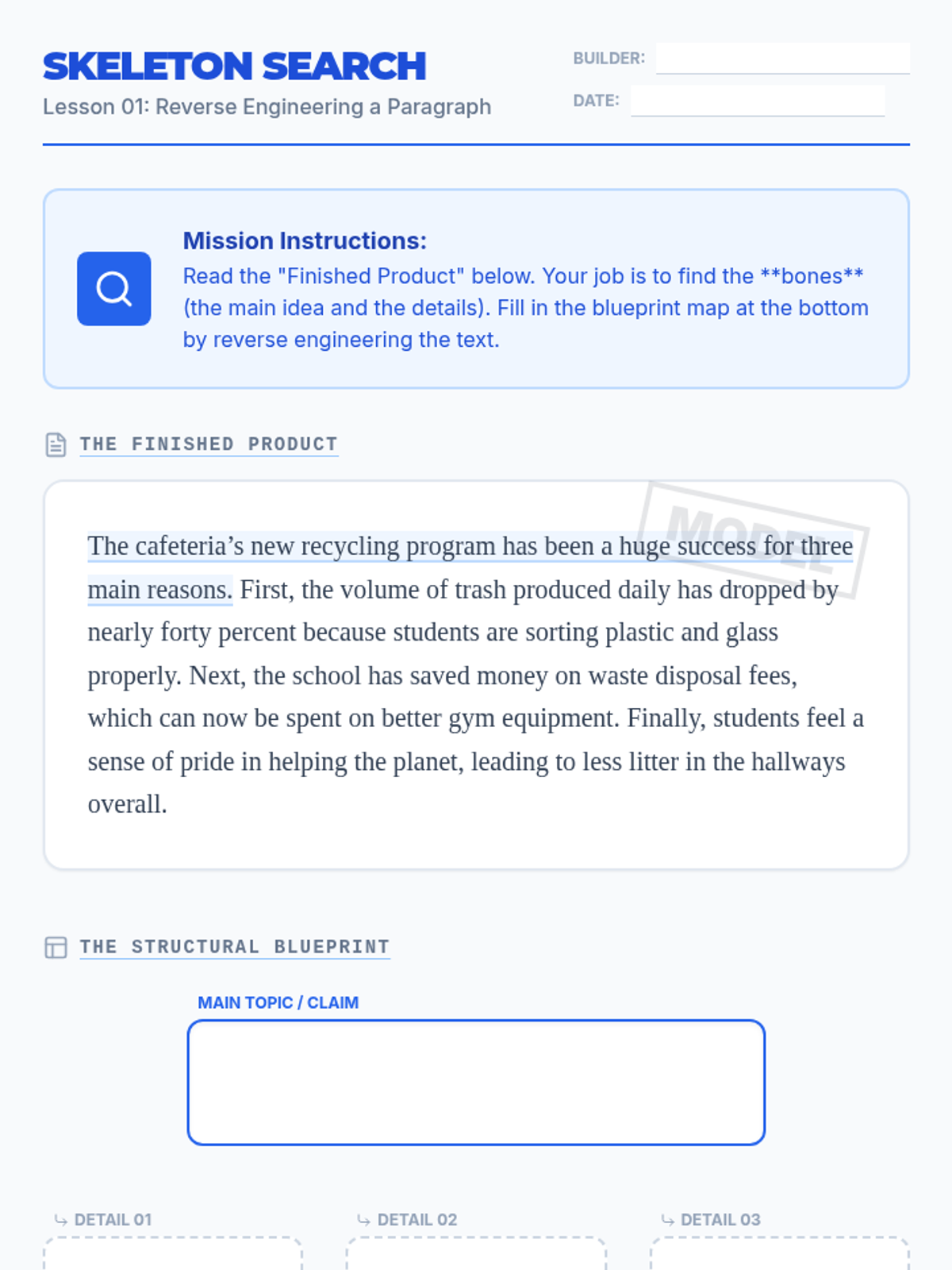 A unit exploring environmental responsibility and school-based sustainability efforts through reading, sequencing, and critical thinking.