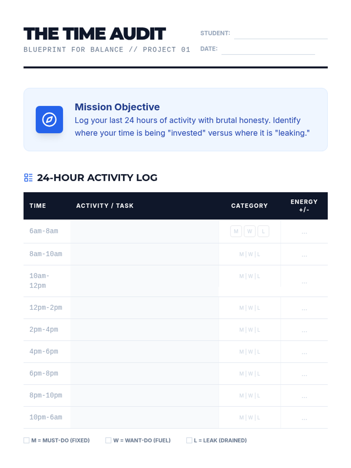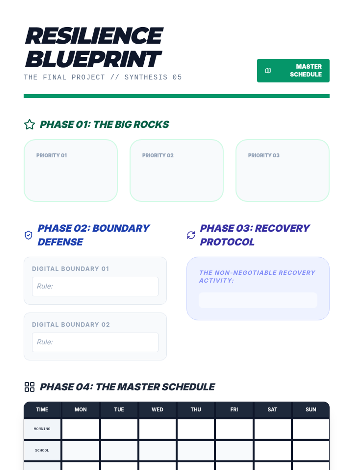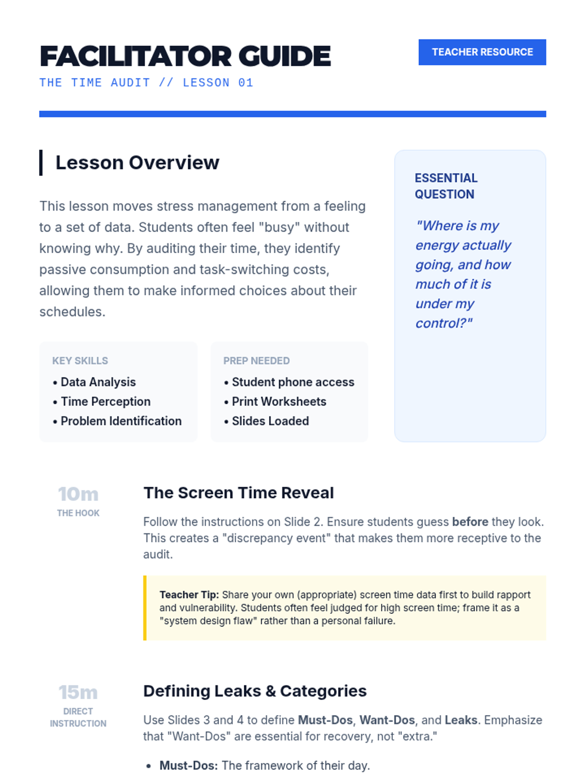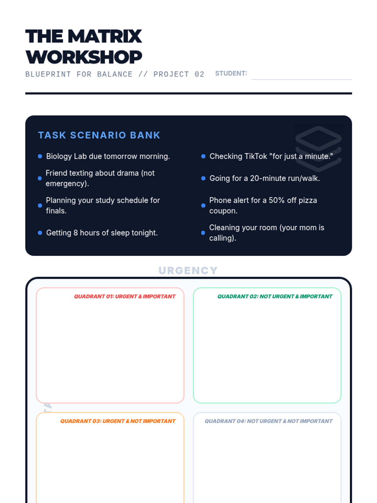 A project-based unit focused on proactive stress management through time audits, prioritization frameworks, and healthy boundary setting to prevent burnout.