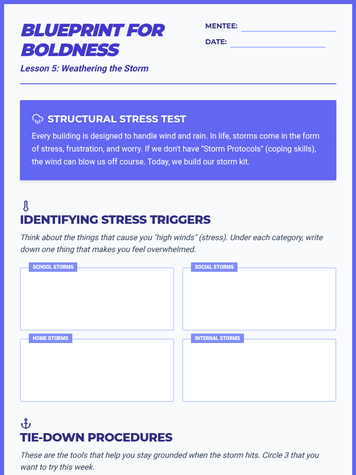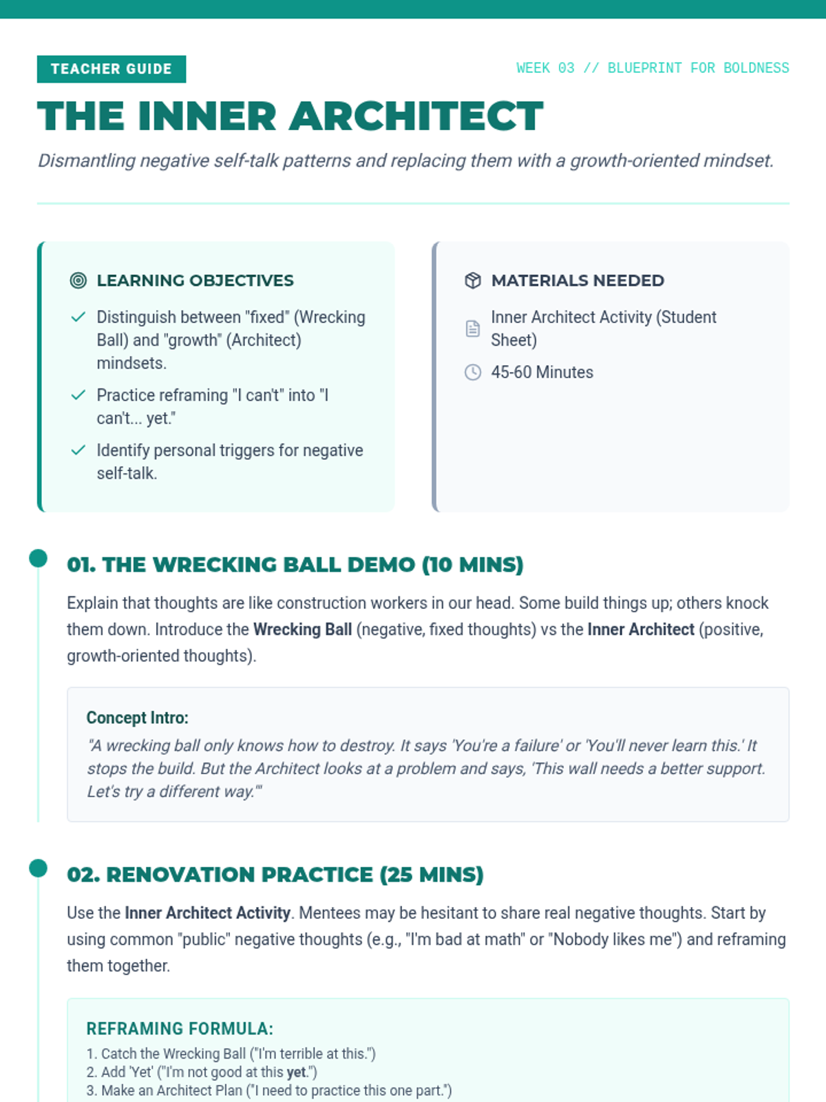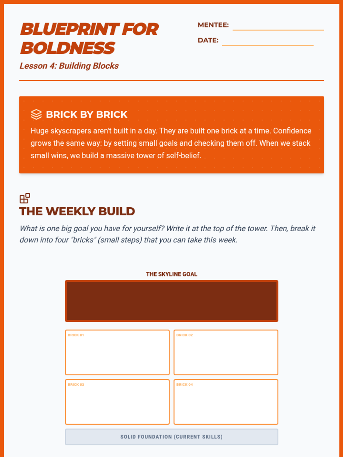 A comprehensive 10-week mentorship journey designed to build confidence, resilience, and problem-solving skills through collaborative activities and deep discussion.