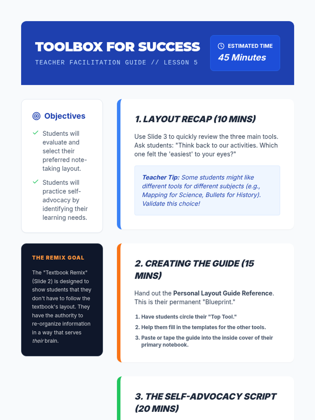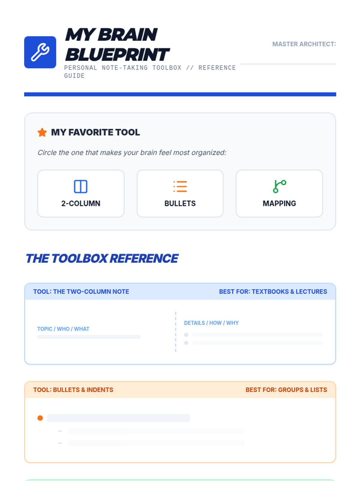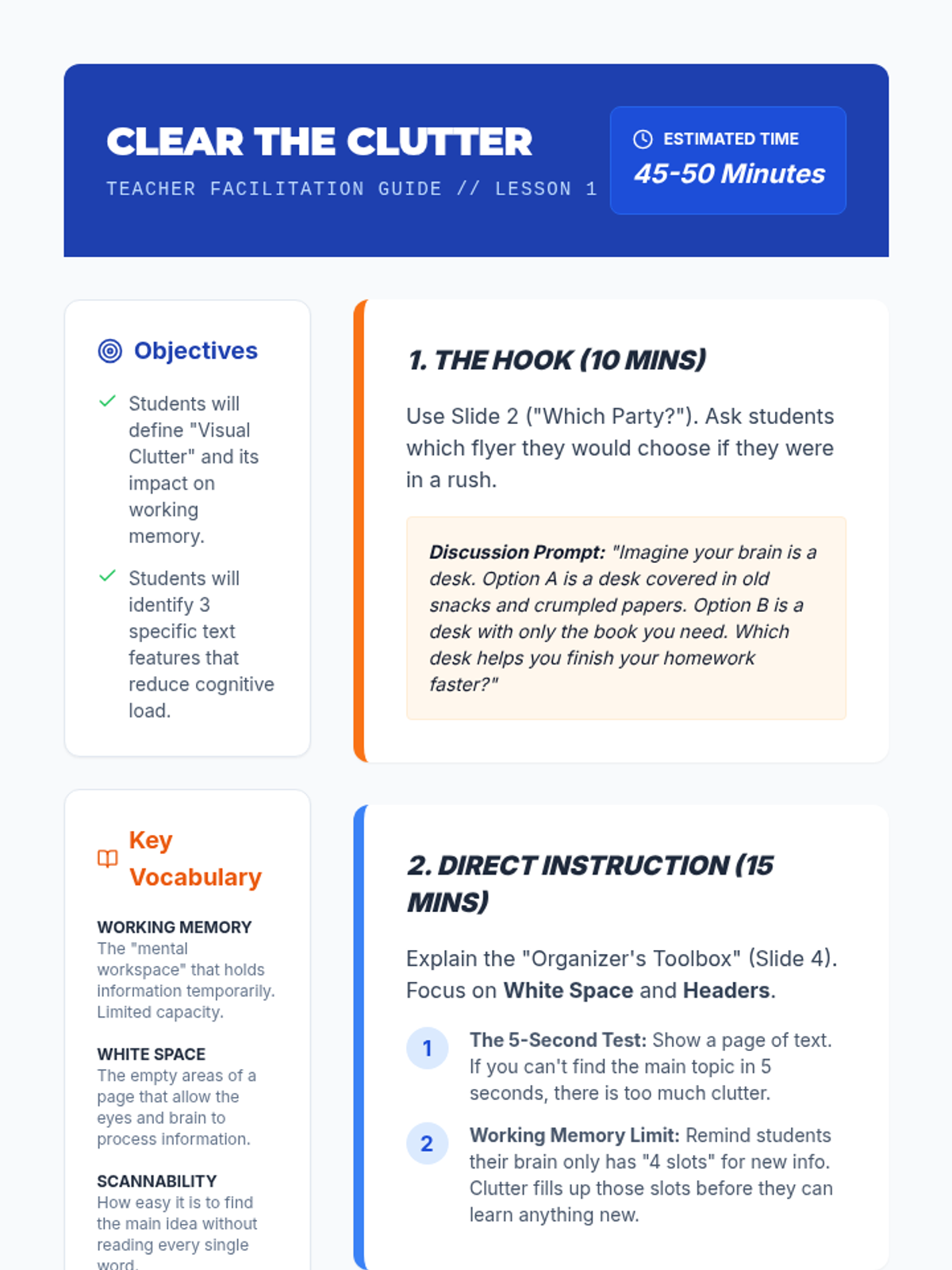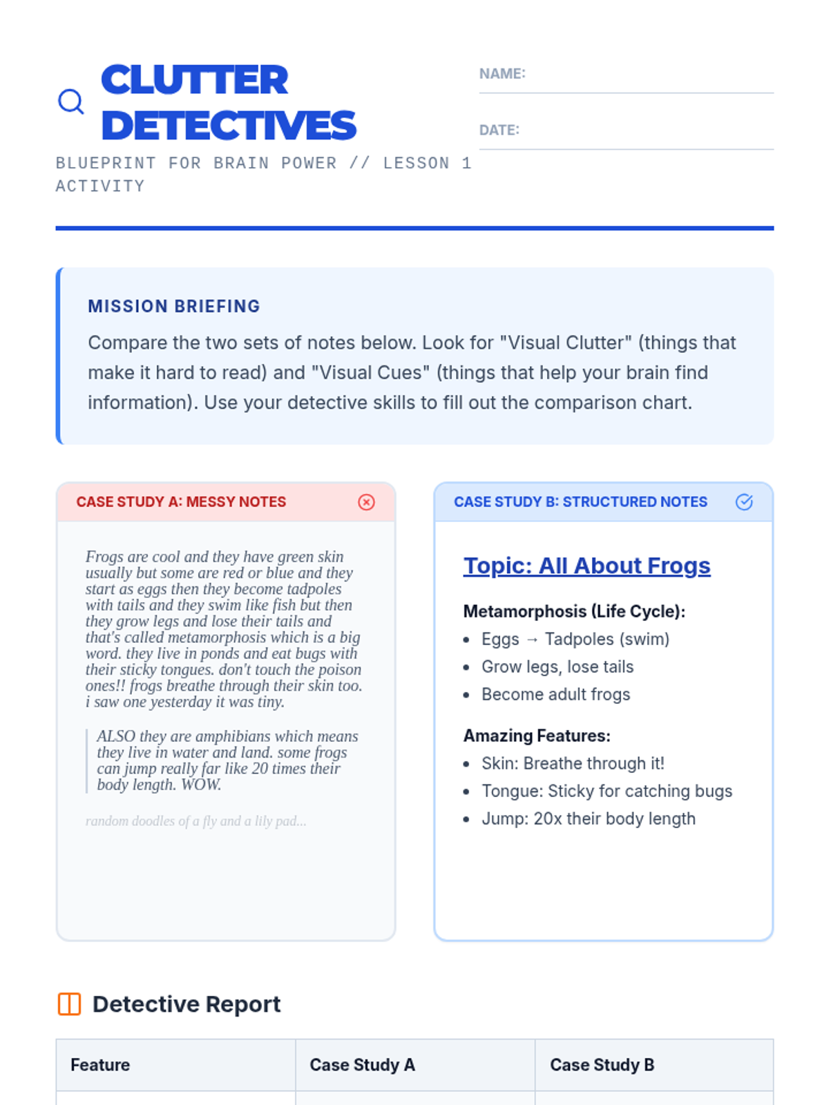 A sequence focused on reducing cognitive load through spatial organization and structured note-taking templates. Students learn to identify visual clutter and implement layouts like two-column notes, bulleted hierarchies, and graphic organizers to support working memory.