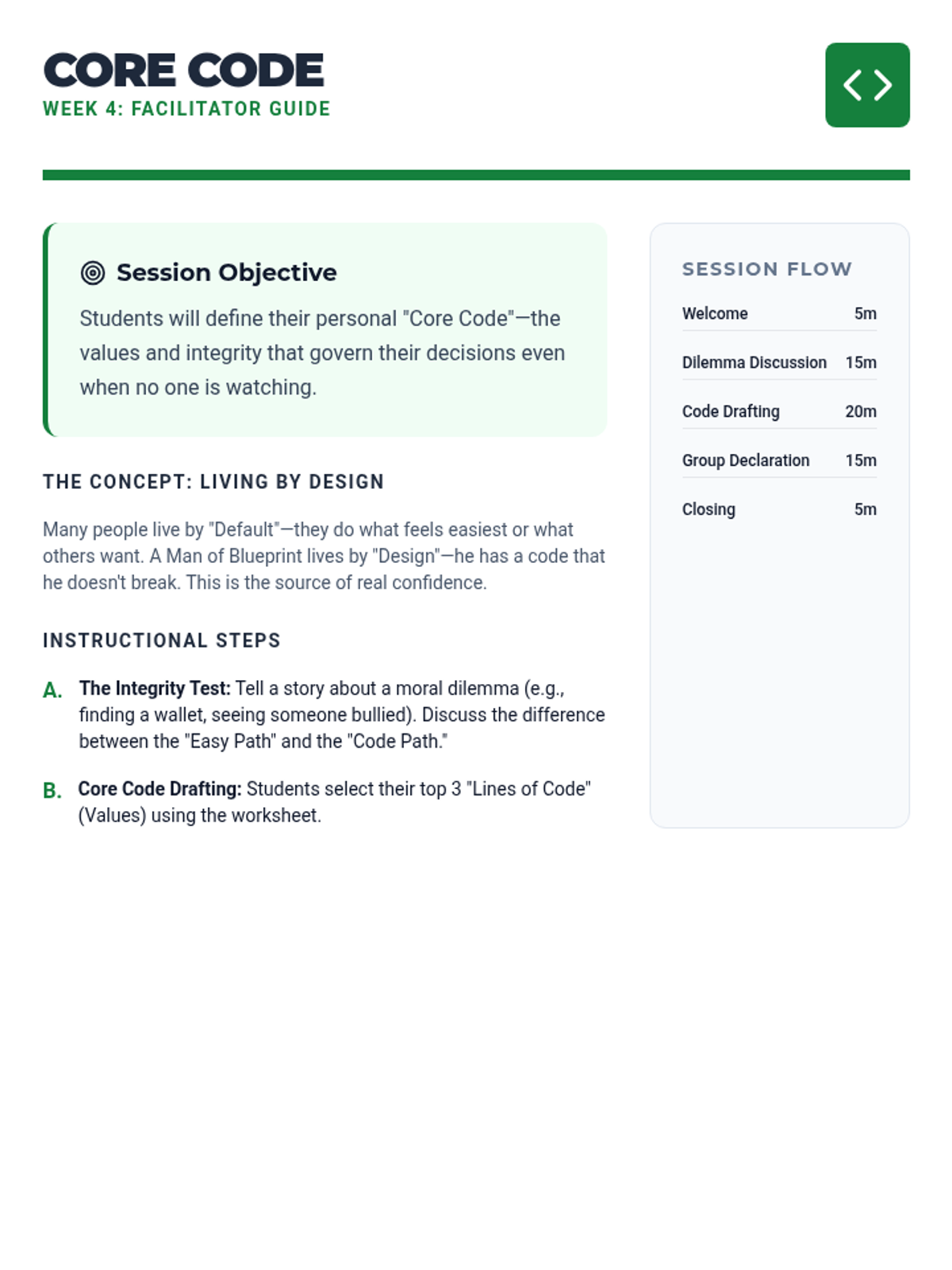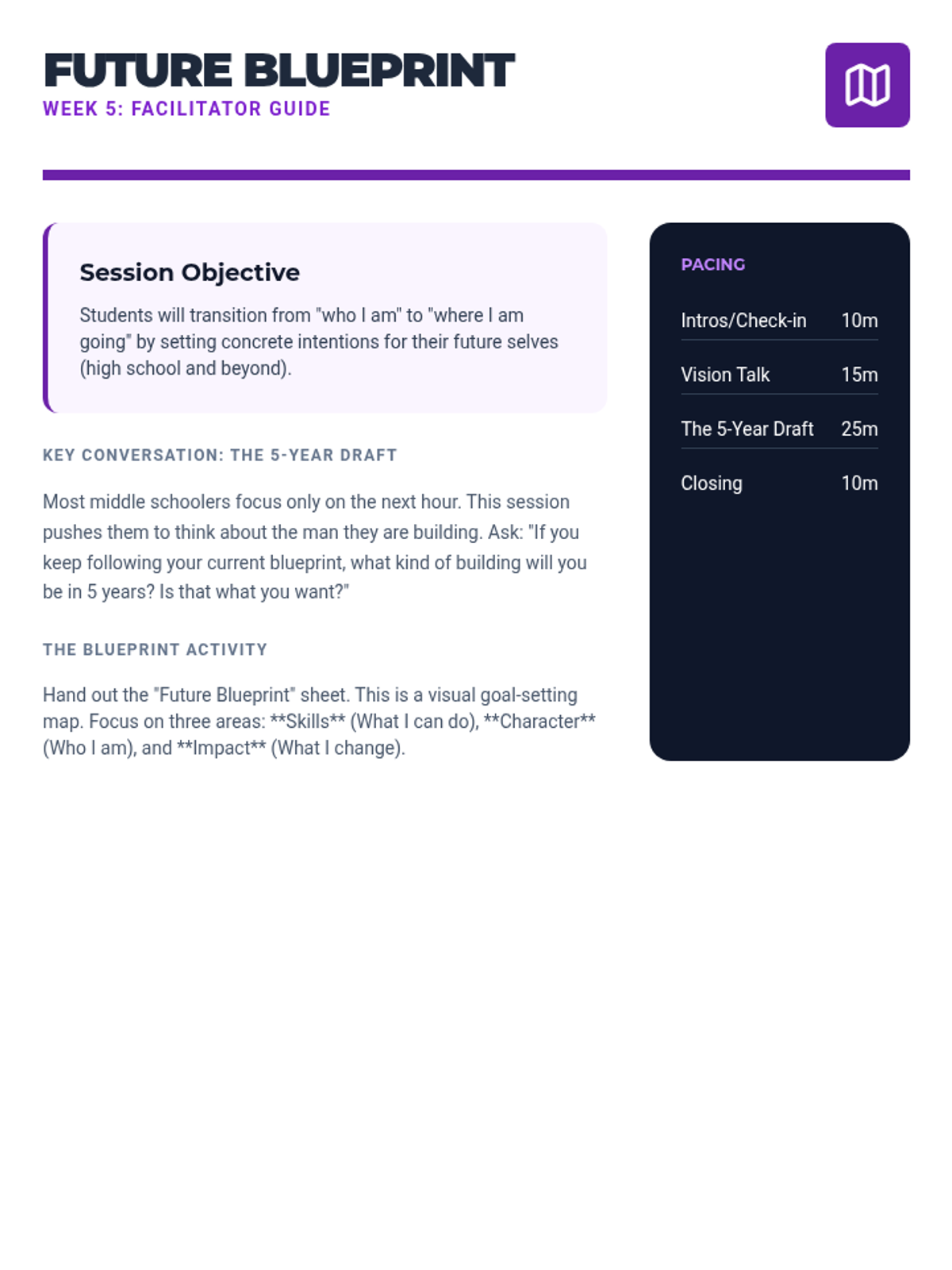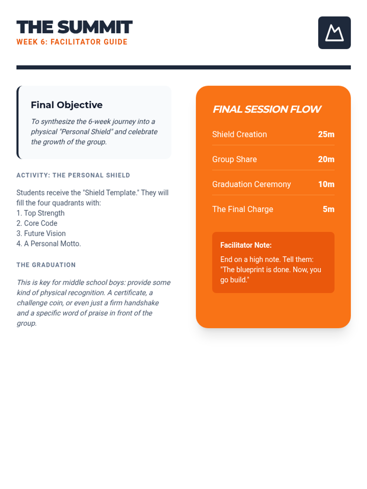 A 6-week curriculum for 7th and 8th-grade boys designed to build self-esteem, identify individual strengths, and foster confidence through a technical 'blueprint' theme. The sequence covers strengths, mindset, resilience, character, goal-setting, and reflection.
