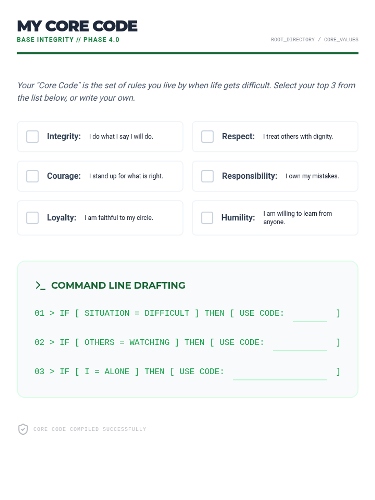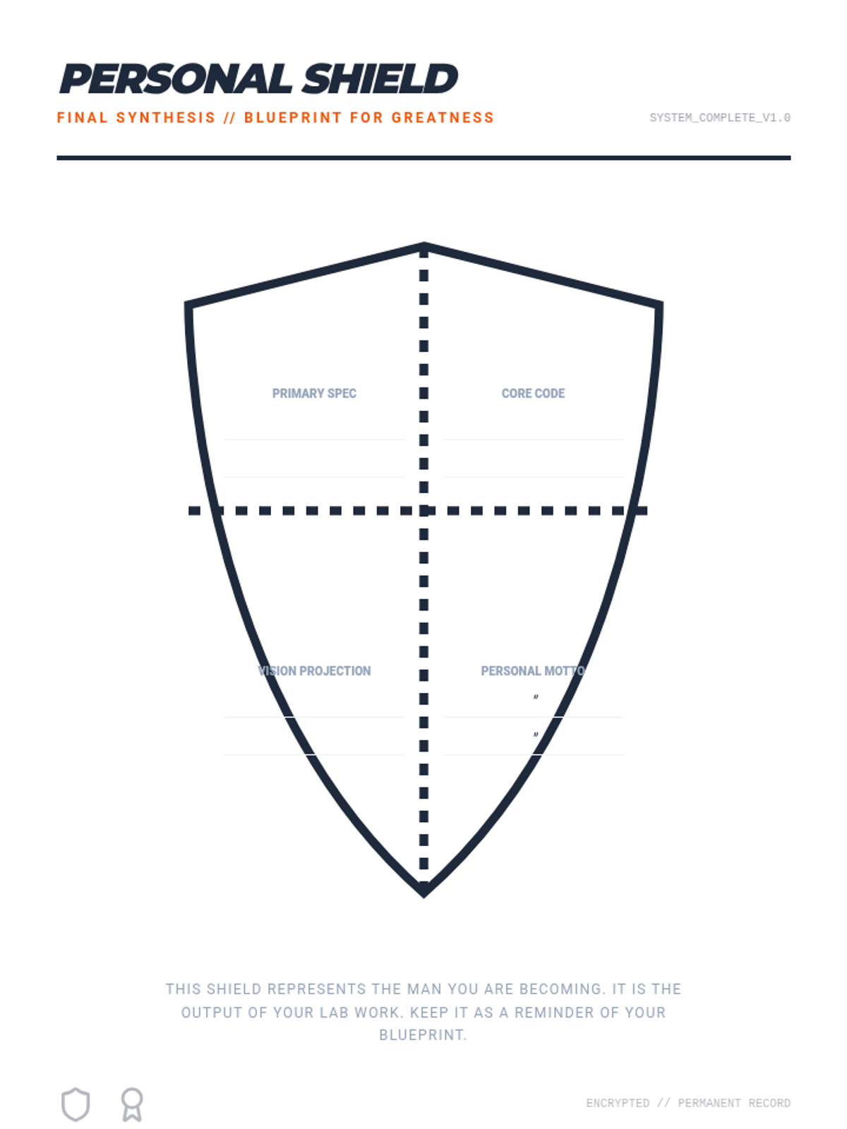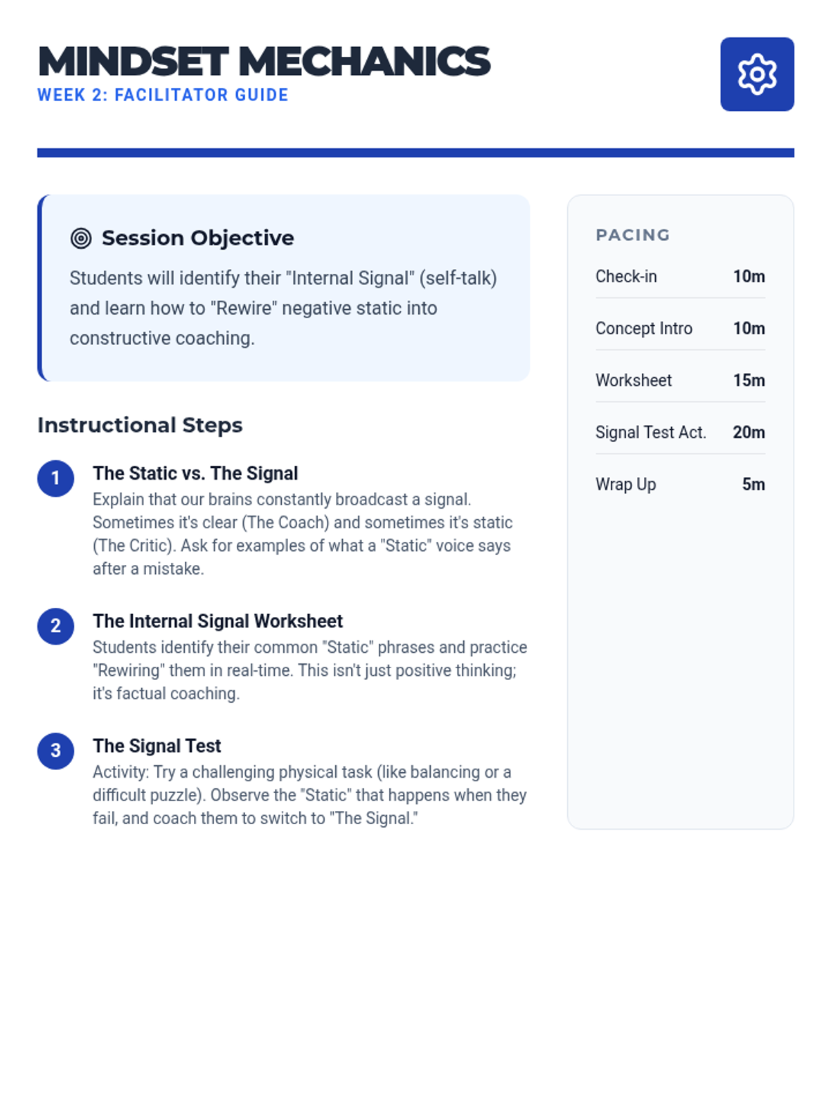 A 6-week curriculum for 7th and 8th-grade boys designed to build self-esteem, identify individual strengths, and foster confidence through a technical 'blueprint' theme. The sequence covers strengths, mindset, resilience, character, goal-setting, and reflection.