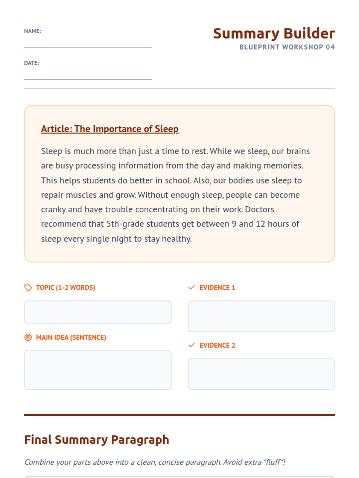 A comprehensive workshop-style unit for 6th Grade ESL students focused on the linguistic mechanics of paraphrasing and synthesizing information. Students move from identifying core concepts to orally retelling information, transforming individual sentences, and finally weaving multiple sources into a single coherent paragraph without plagiarizing.