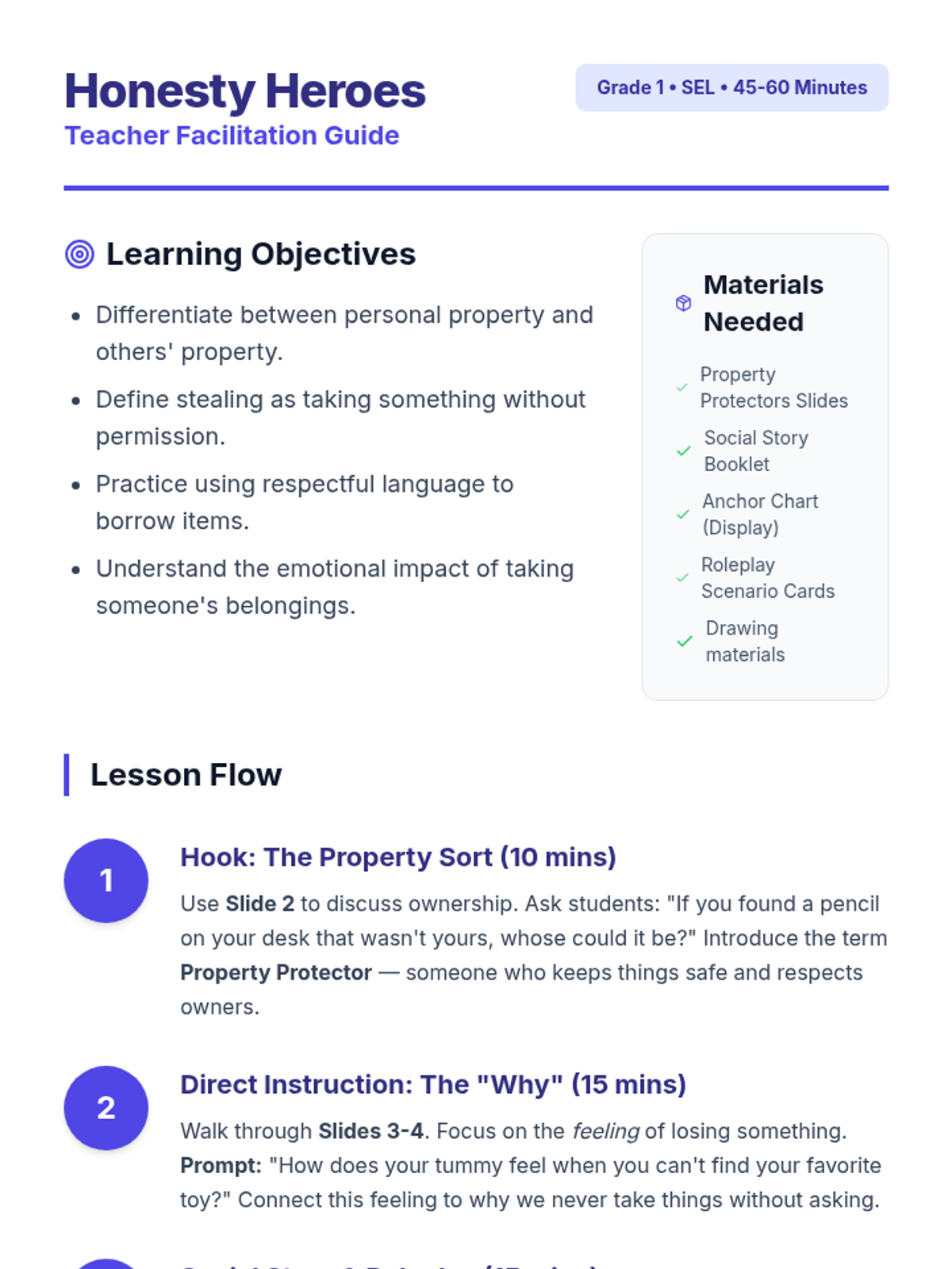 A collection of lessons designed to build core social-emotional skills in primary students, focusing on classroom community and personal responsibility.