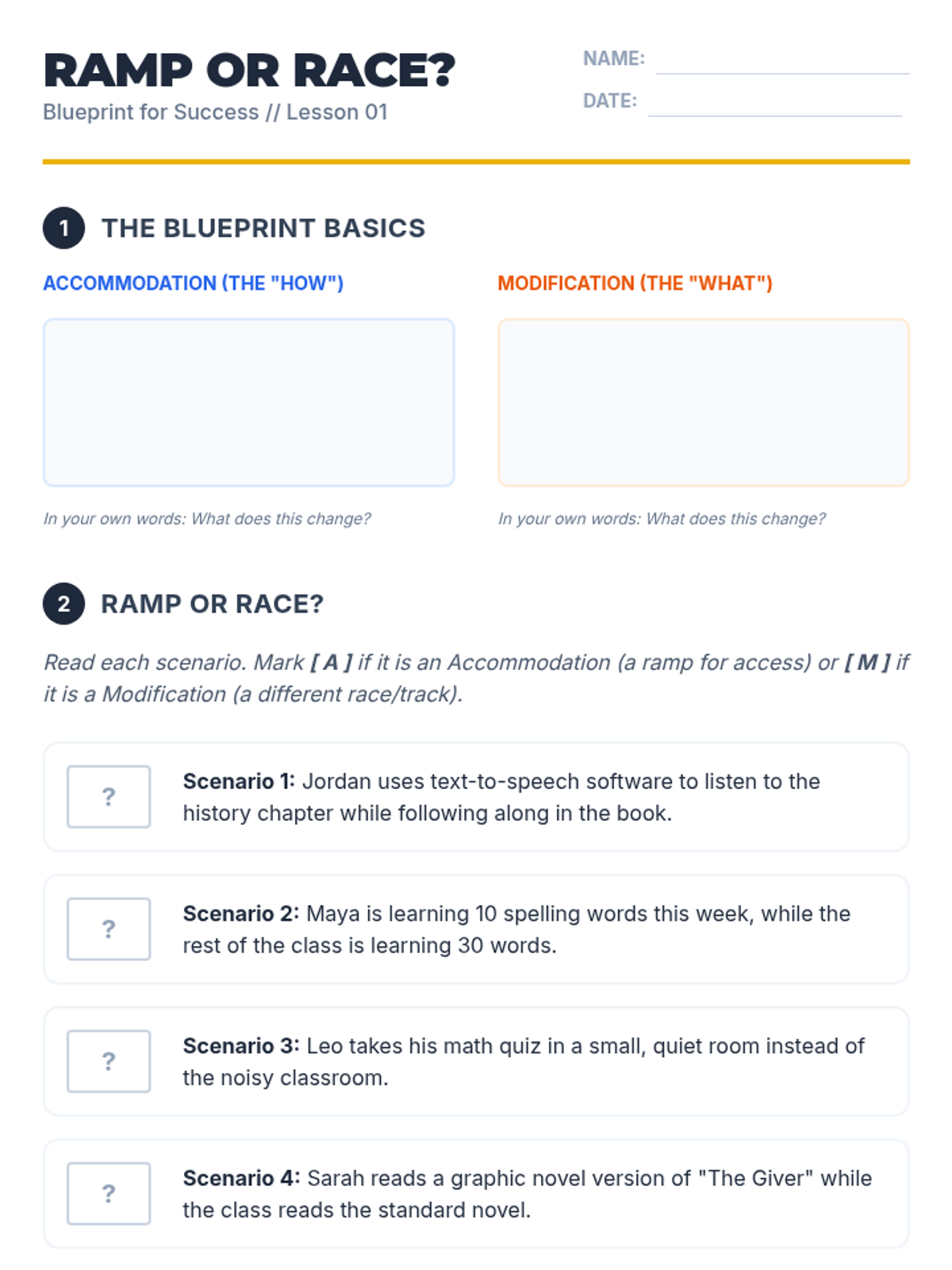 A 5-lesson sequence for 7th-grade students to distinguish between accommodations and modifications, analyze classroom case studies, explore assistive technology, and develop self-advocacy skills for their own IEP needs.