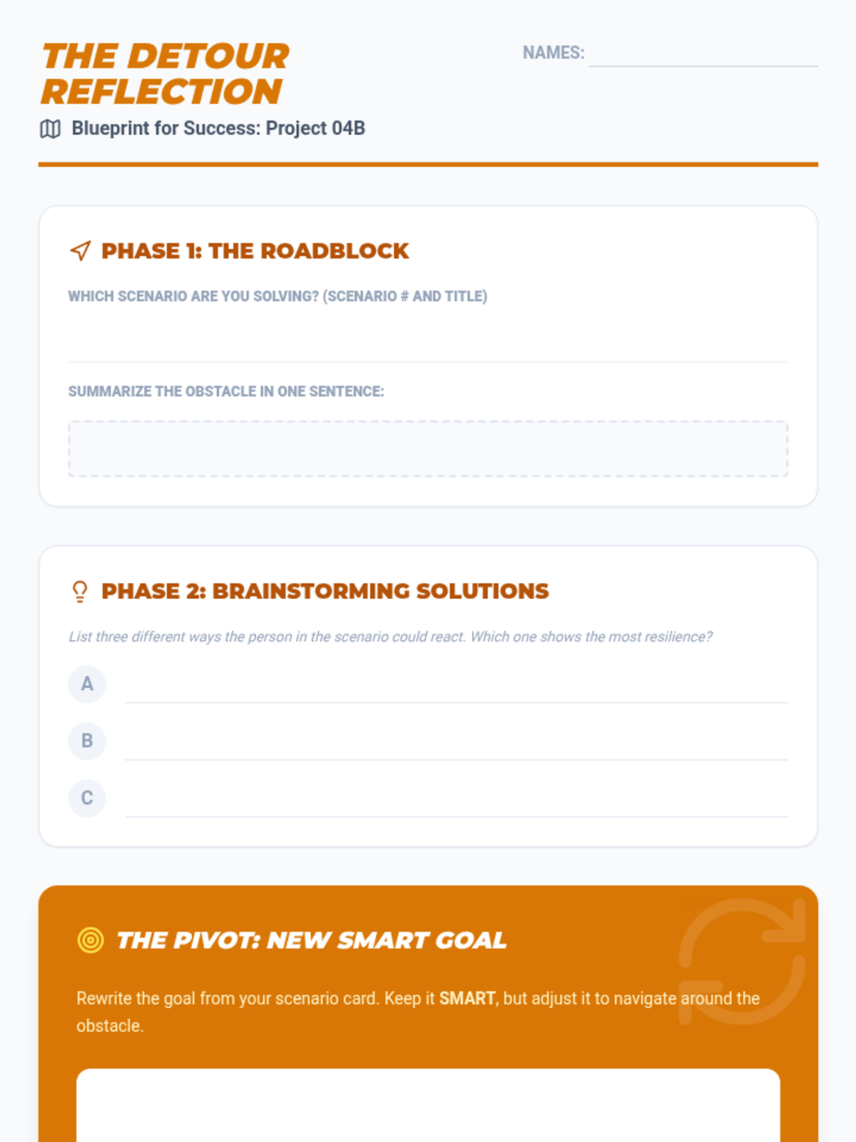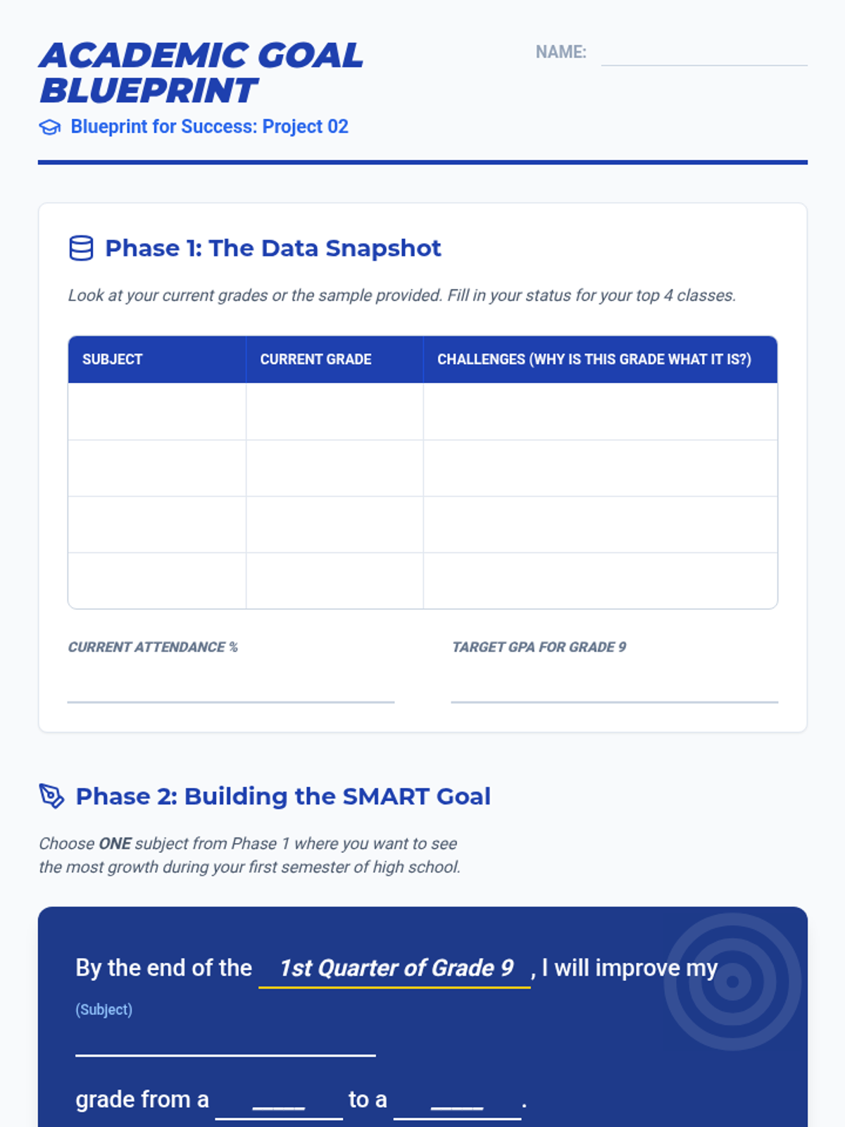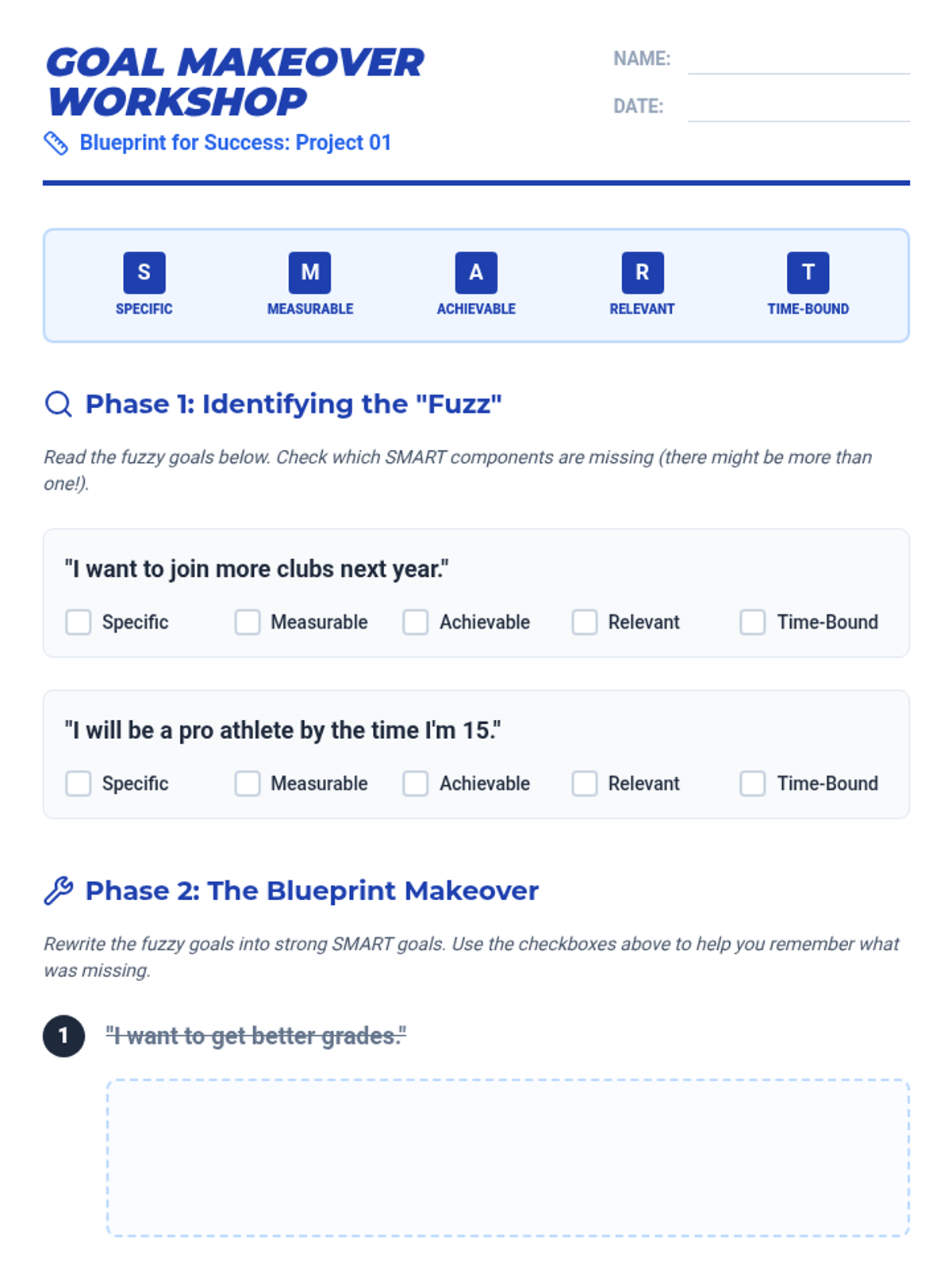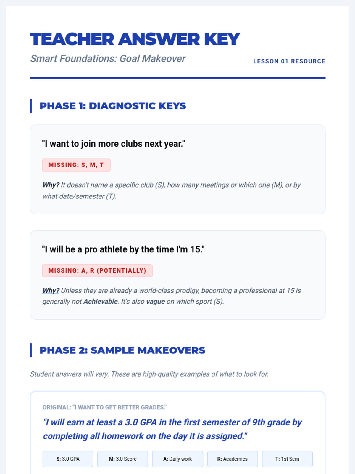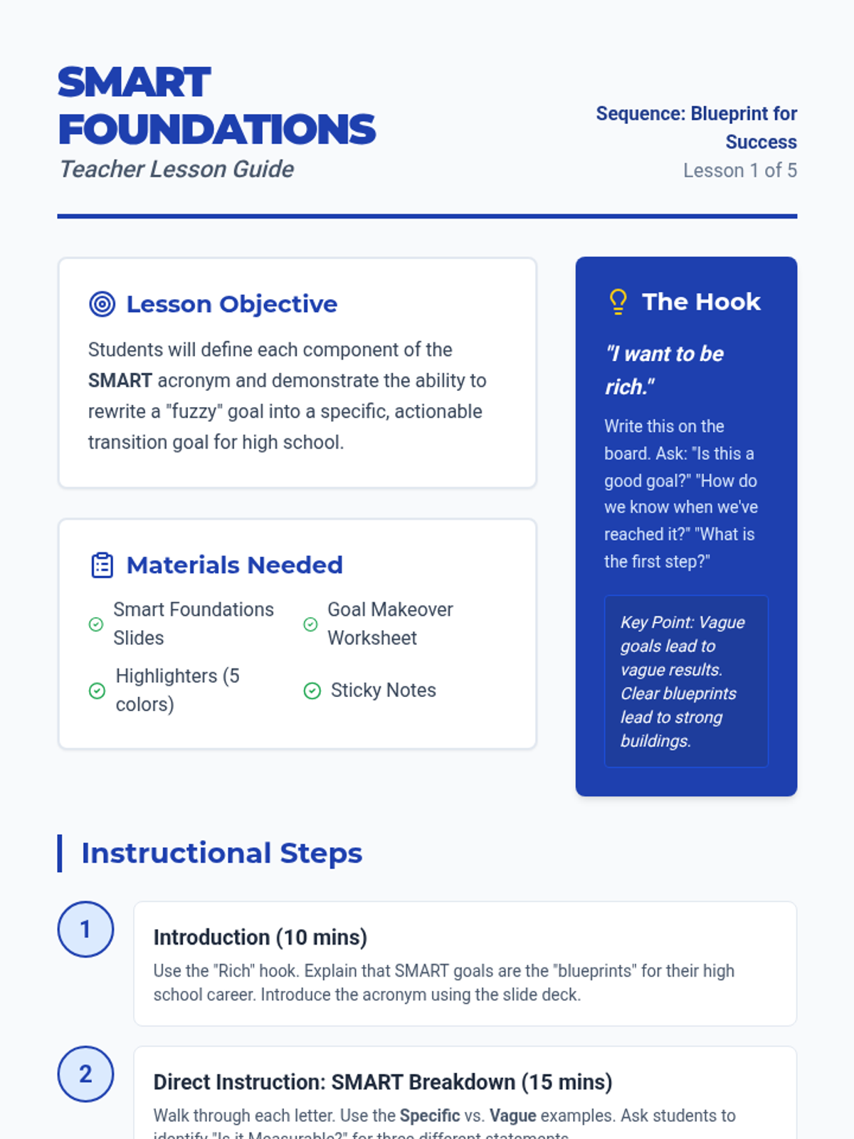 A 5-lesson transition planning sequence for 8th-grade students, focusing on the SMART goal framework to prepare for high school and post-secondary success. Students learn to set specific academic and social goals, navigate obstacles, and visualize their future.