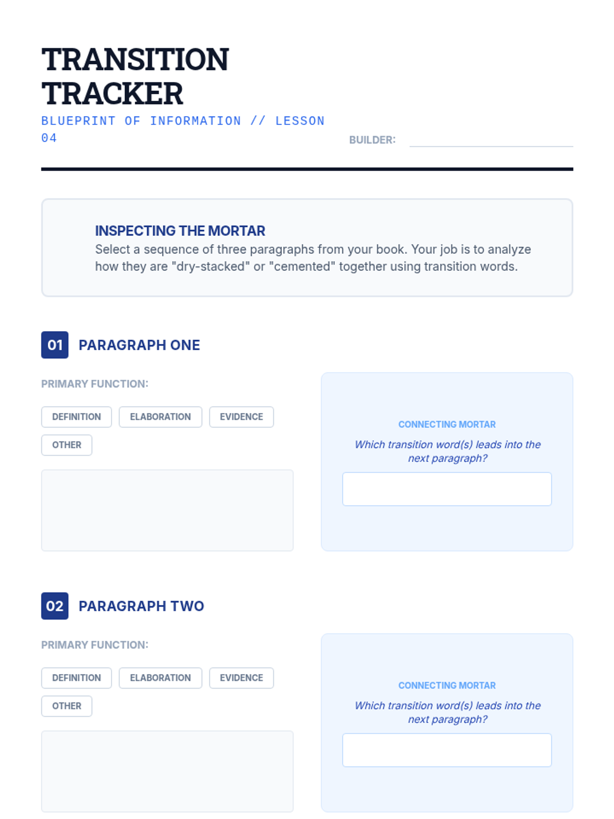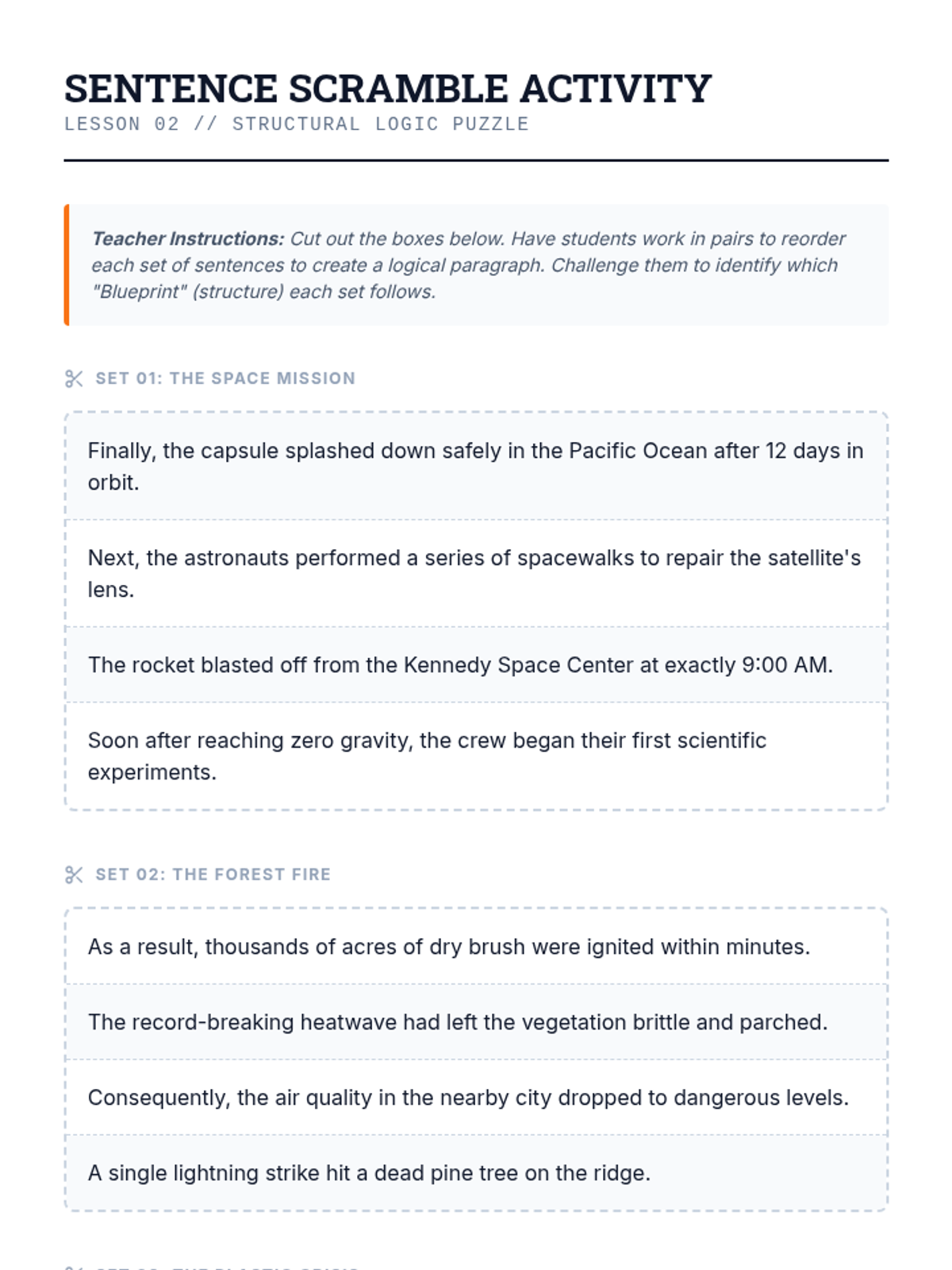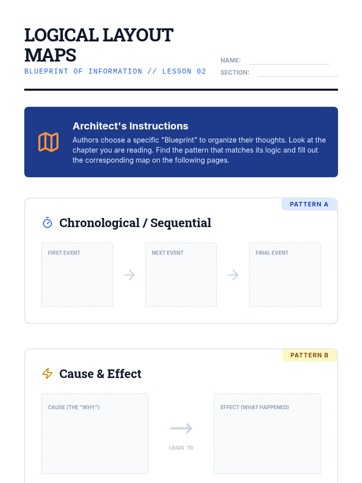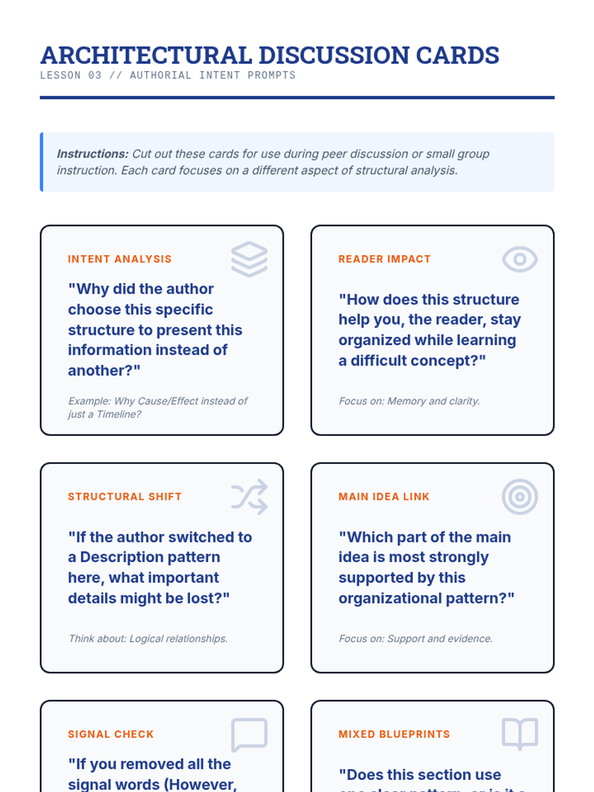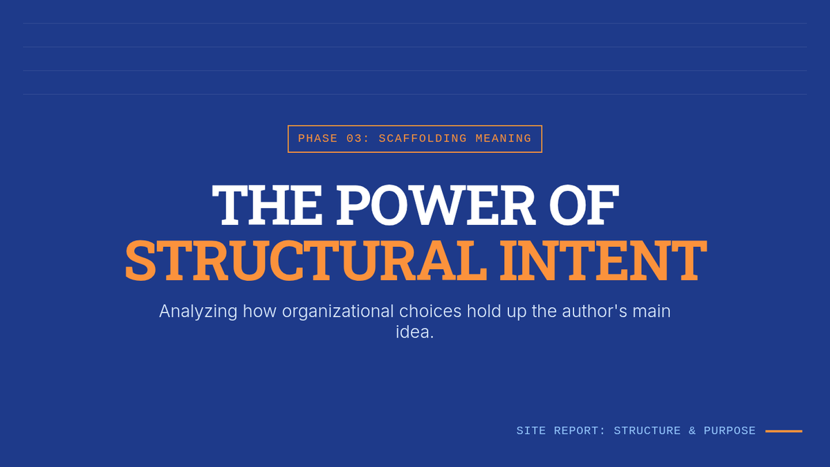 This sequence teaches 7th-grade students to analyze the structural framework of nonfiction texts. Students progress from identifying surface-level text features to evaluating complex organizational patterns and their impact on the author's central message.