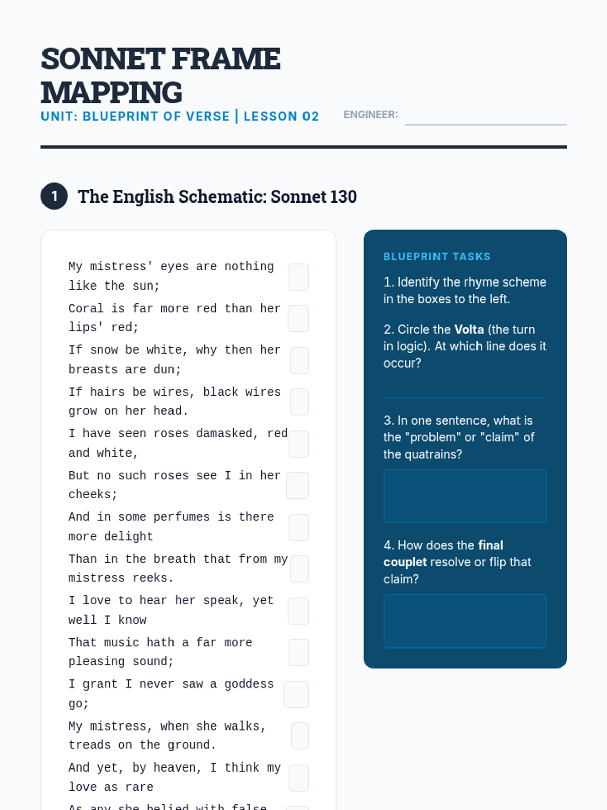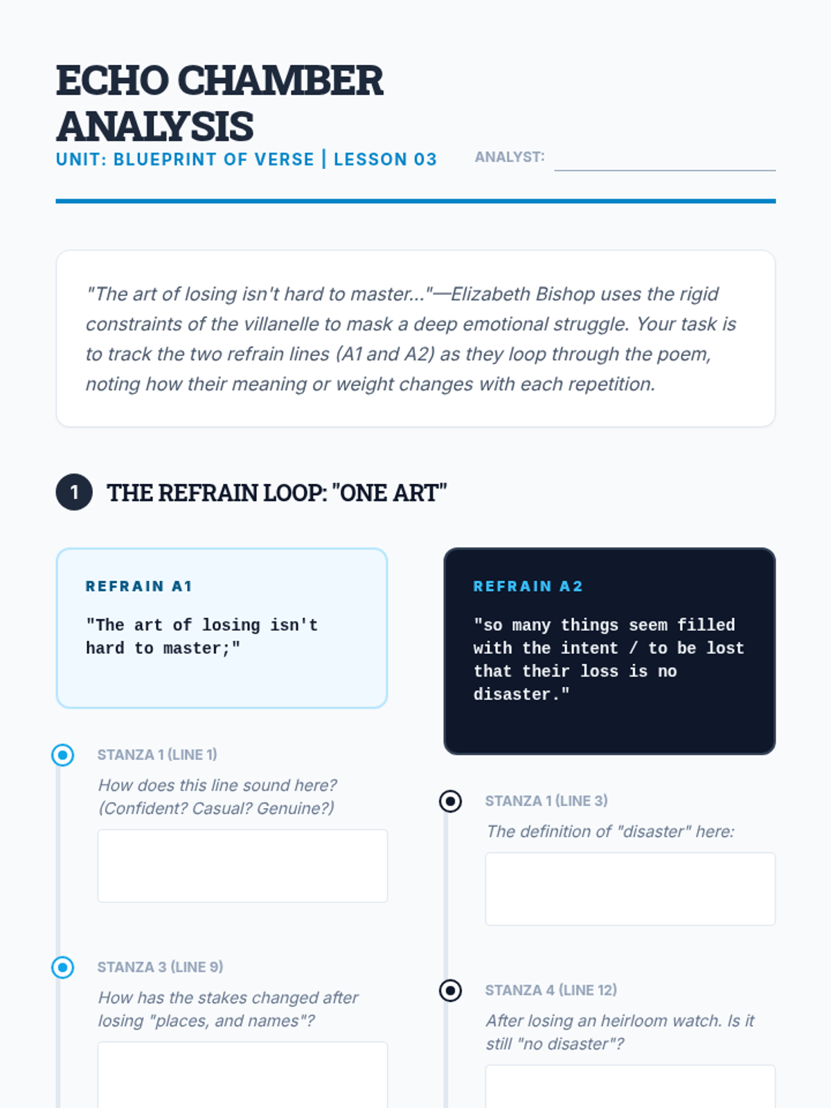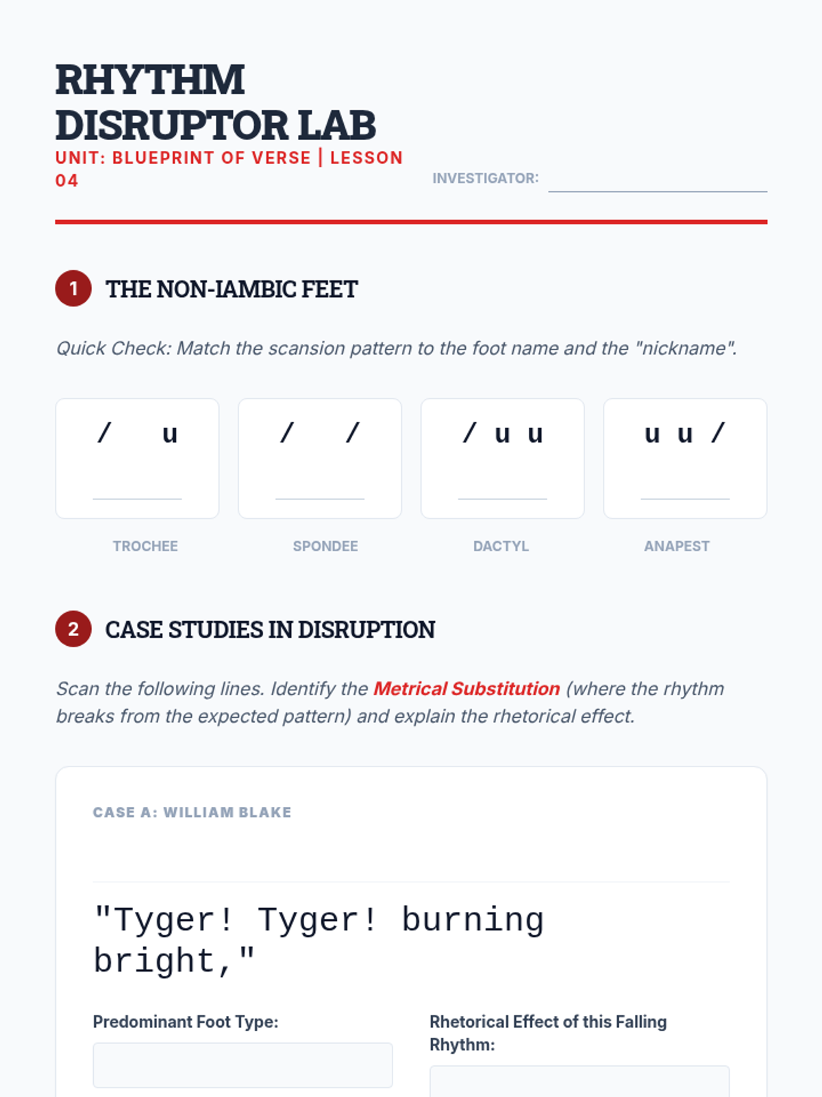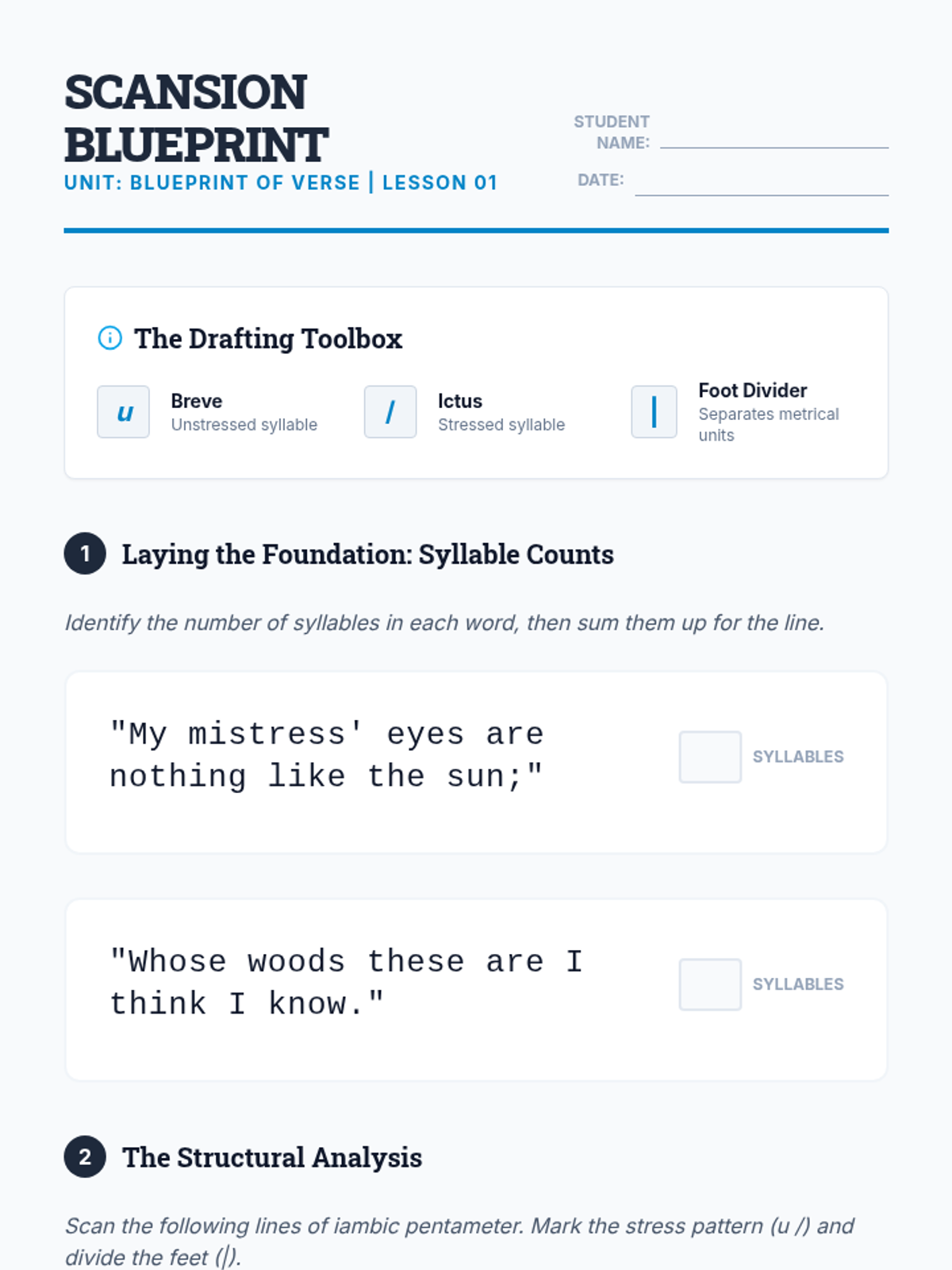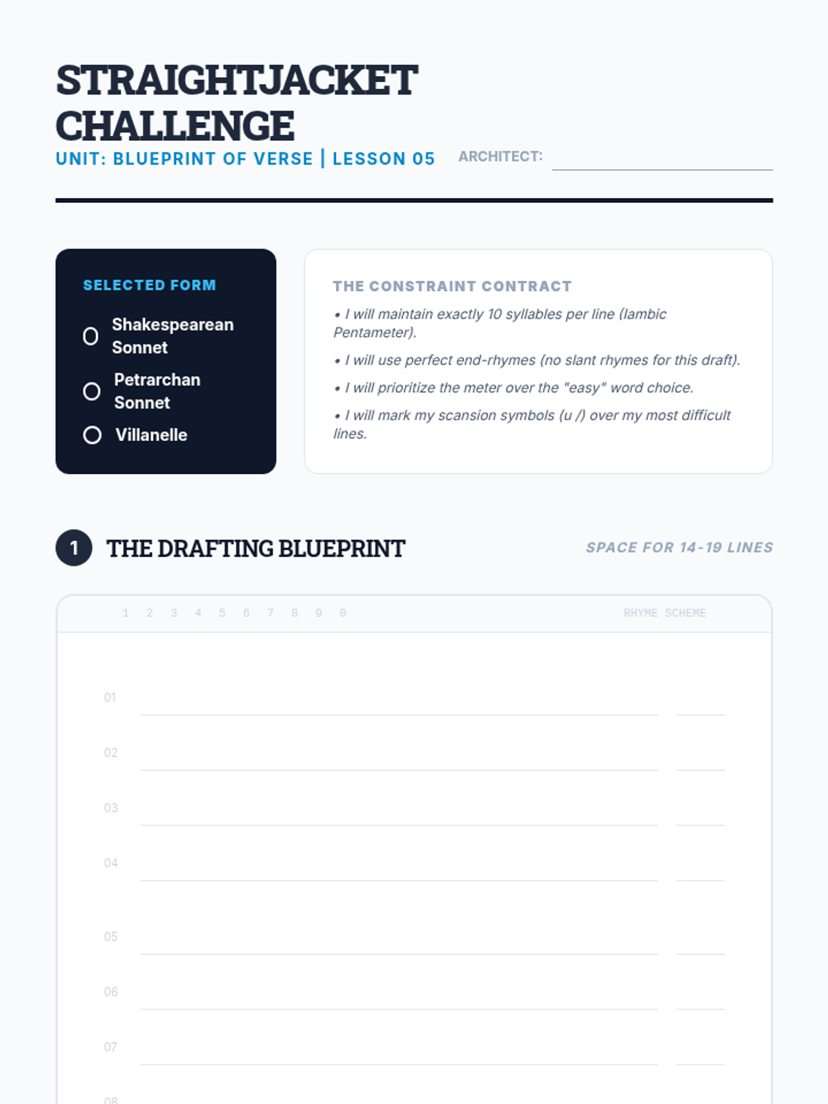 This sequence immerses 11th-grade students in the technical mechanics of poetry, focusing on scansion, meter, and fixed forms. Students move from identifying basic stress patterns to analyzing how rigid structures like the sonnet and villanelle shape meaning and constrain the poet's argument.