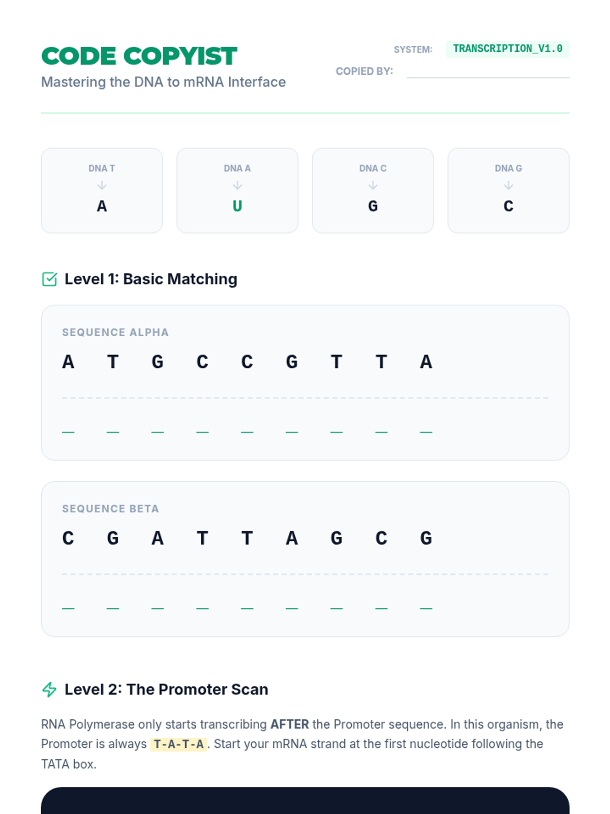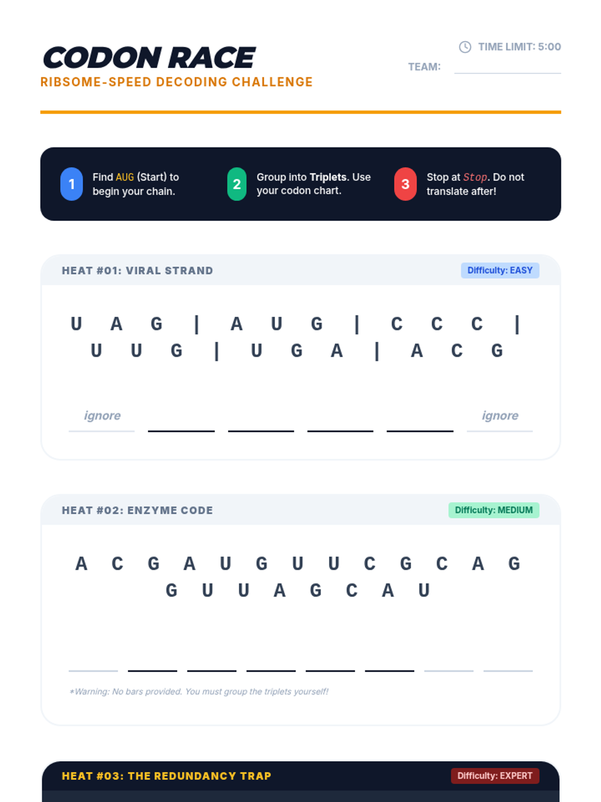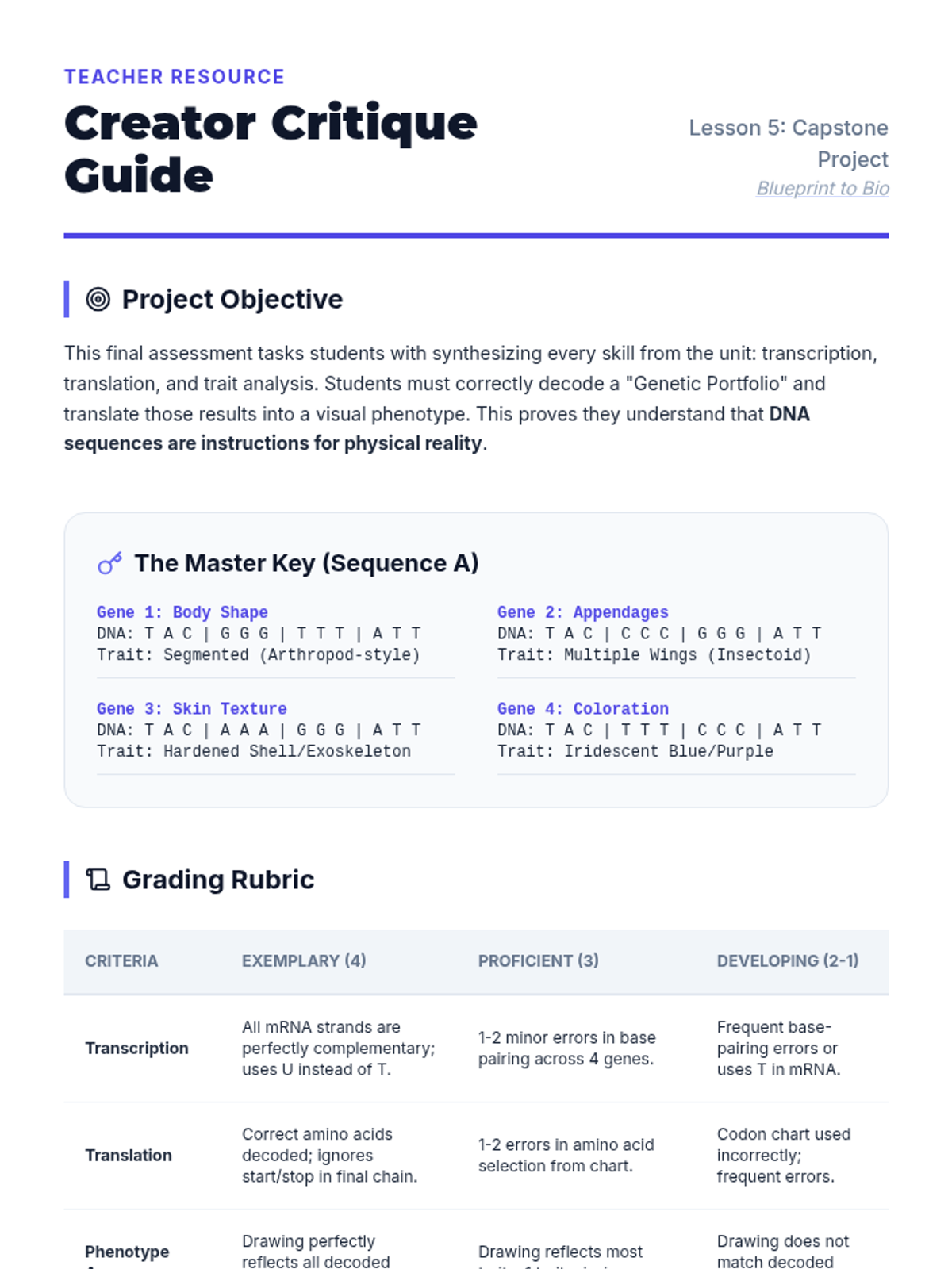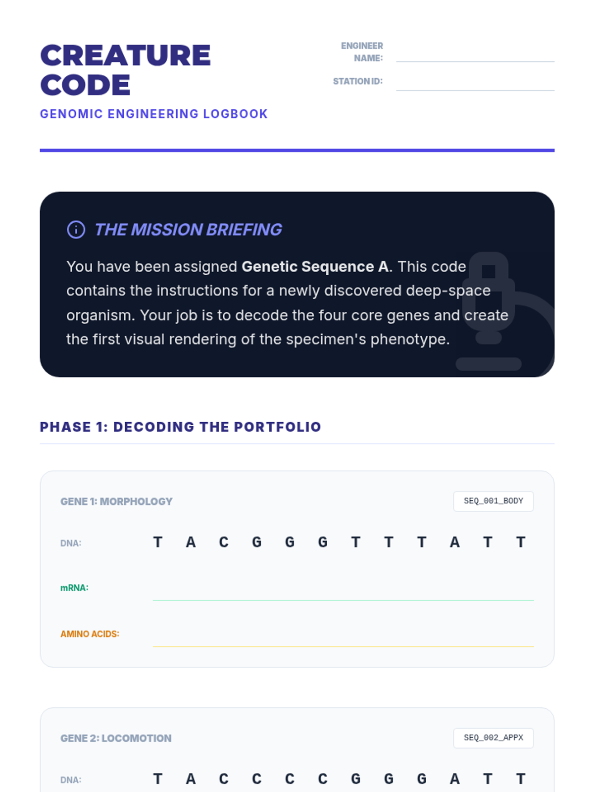 This project-based sequence bridges the gap between abstract DNA code and observable traits. Students explore the Central Dogma, transcription, translation, and mutations to understand how genotype determines phenotype, culminating in a creative genetic design project.