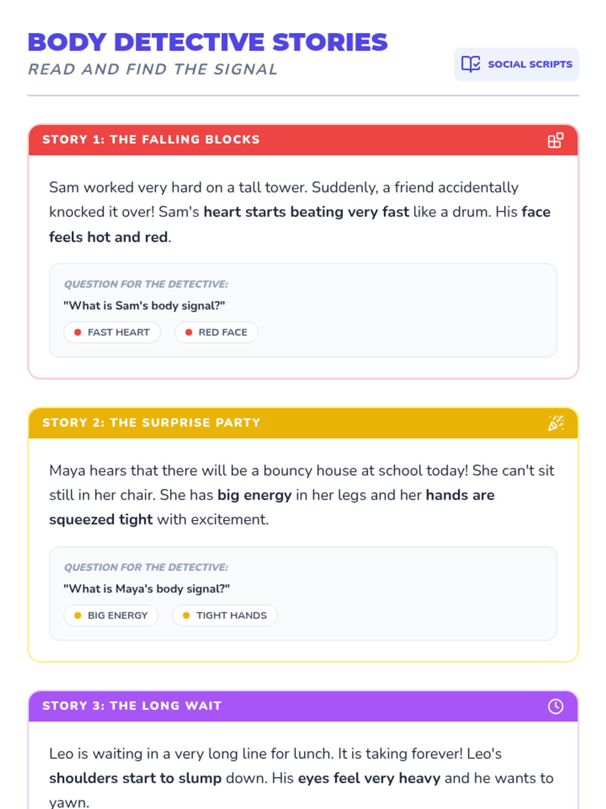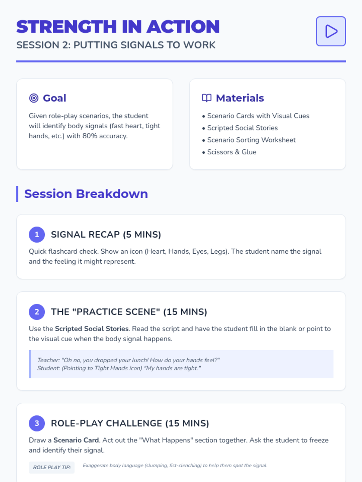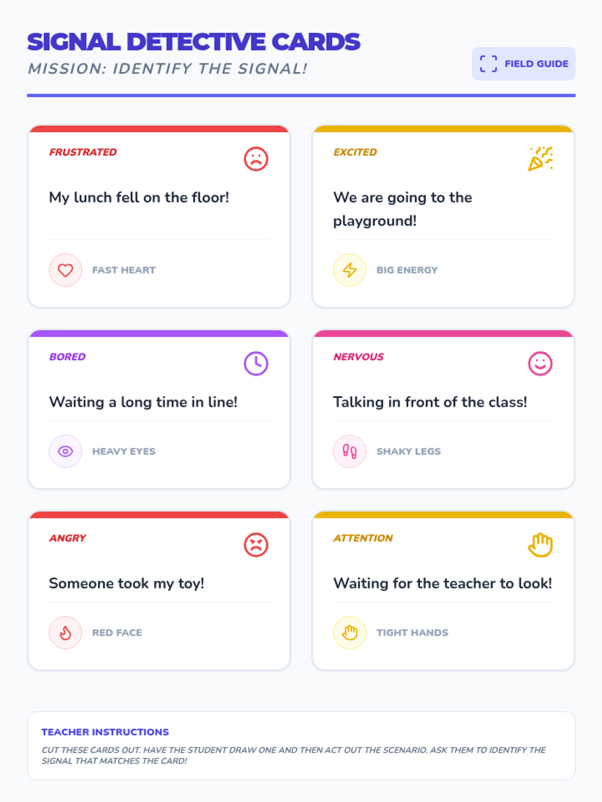 A two-session social-emotional learning unit designed to help students identify body signals associated with various emotions, aligned with IEP goals for self-regulation and emotional awareness.