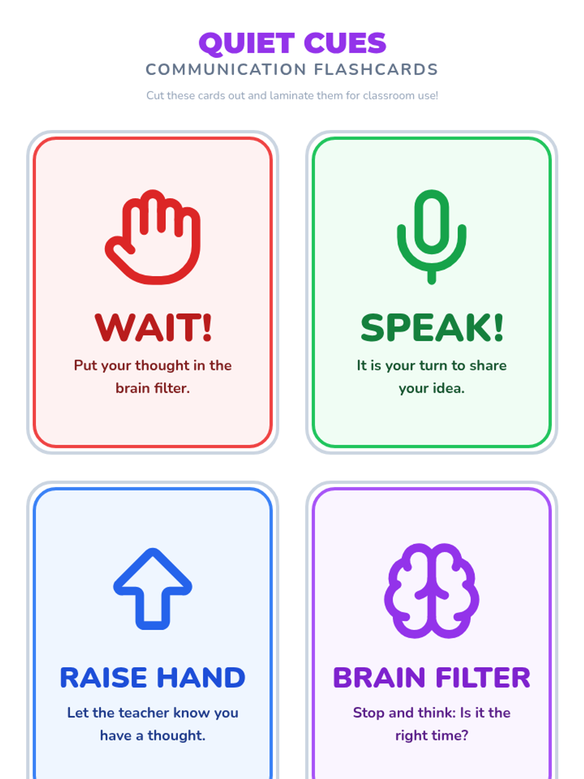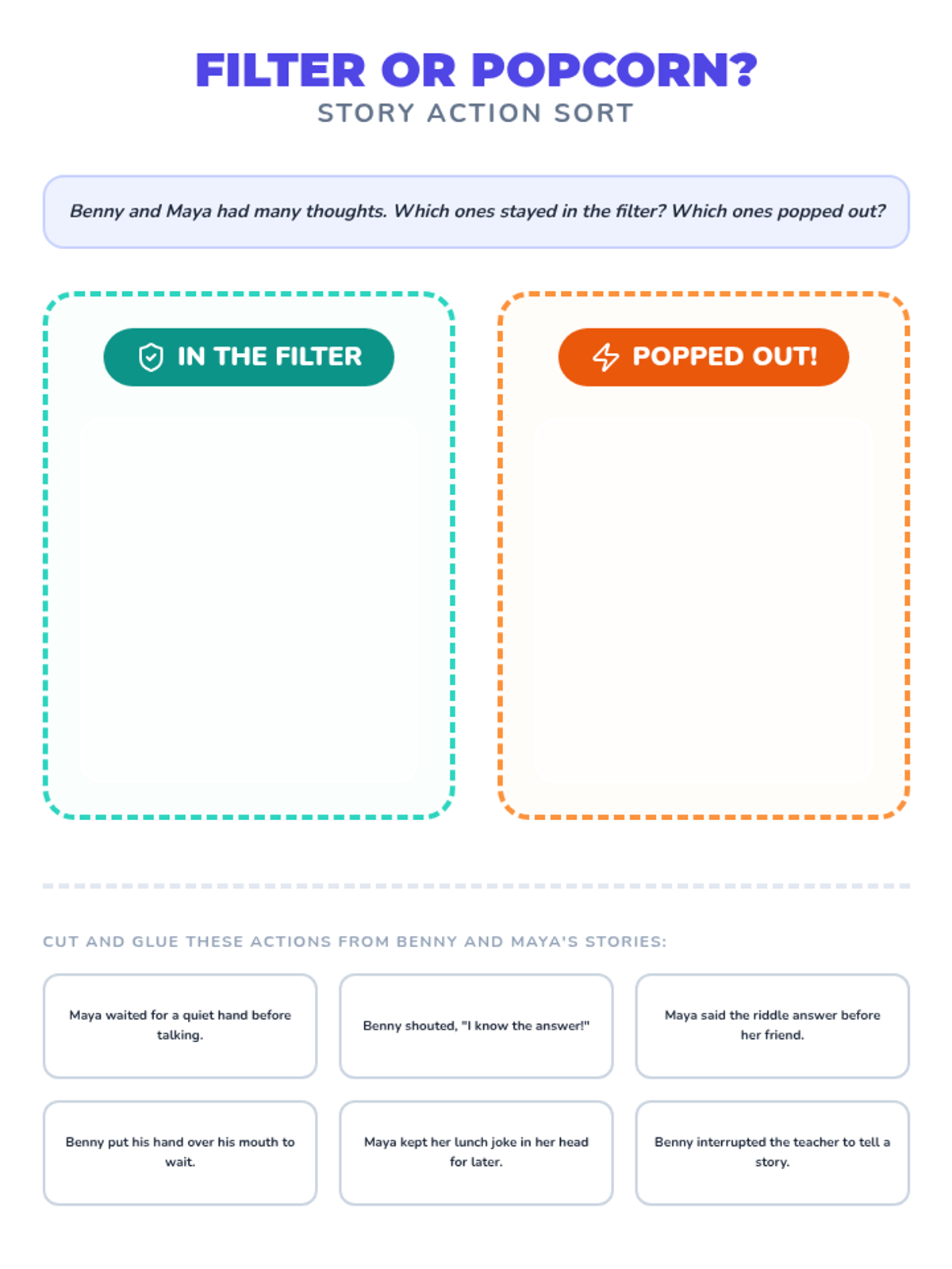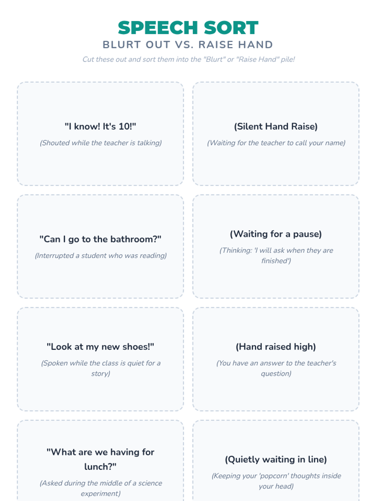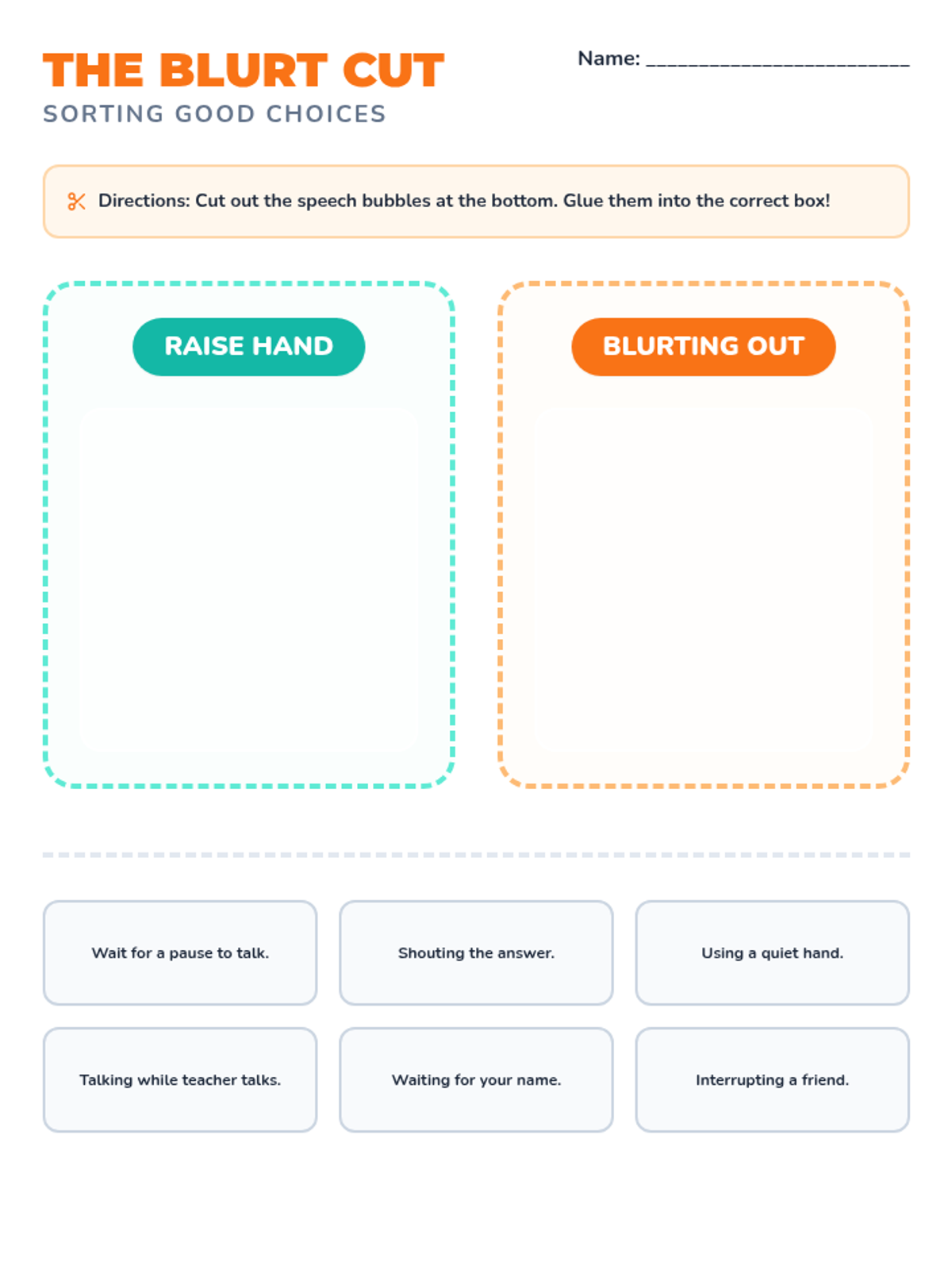 A comprehensive unit for 1st grade students to understand and manage blurting in the classroom through social stories, sorting activities, and interactive games.