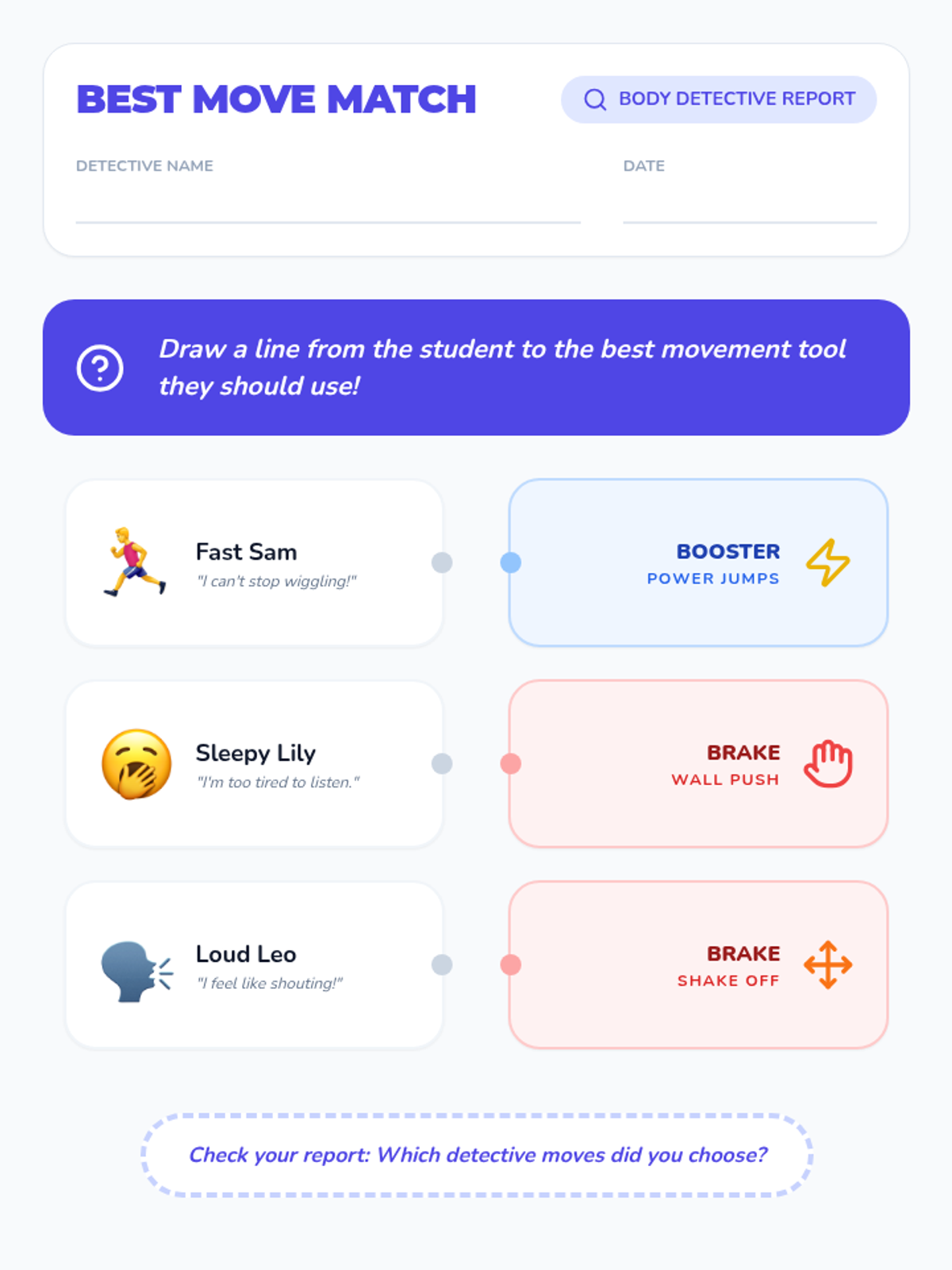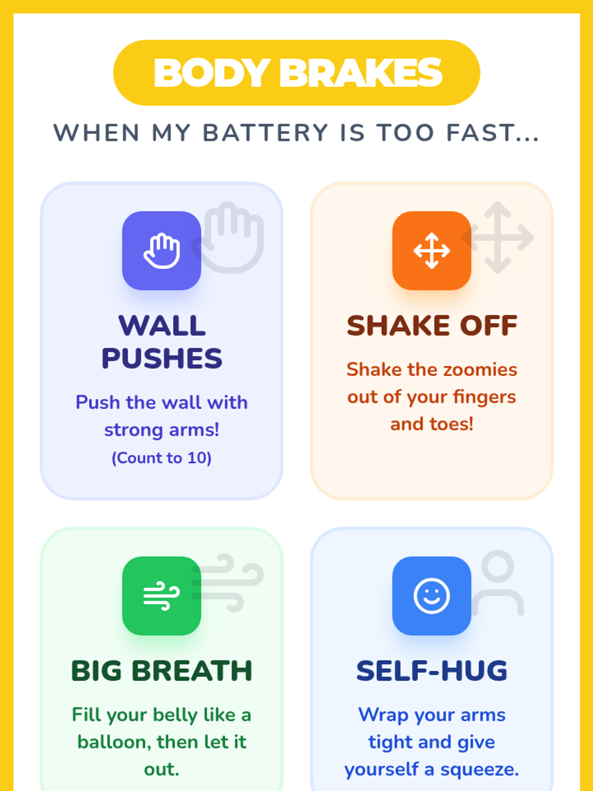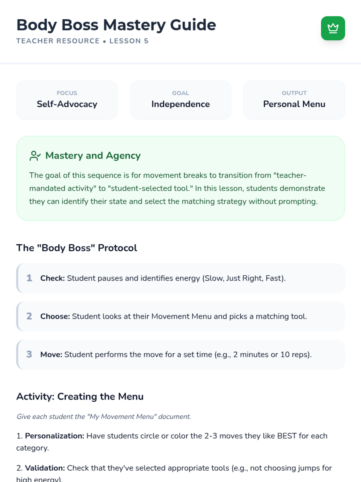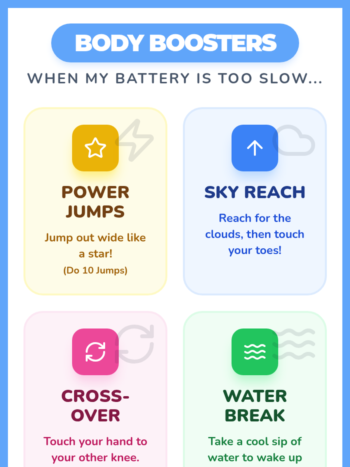 This sequence teaches Kindergarten students to identify their energy levels using a 'Body Battery' metaphor and select appropriate movement breaks. Students progress from teacher-led categorization to independent self-regulation using a menu of movement tools.