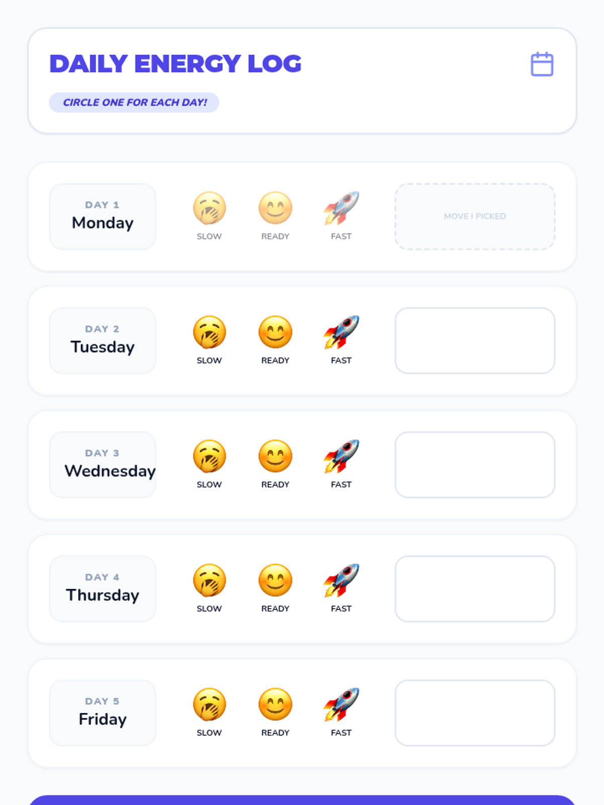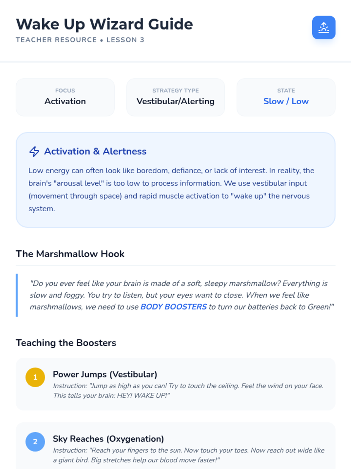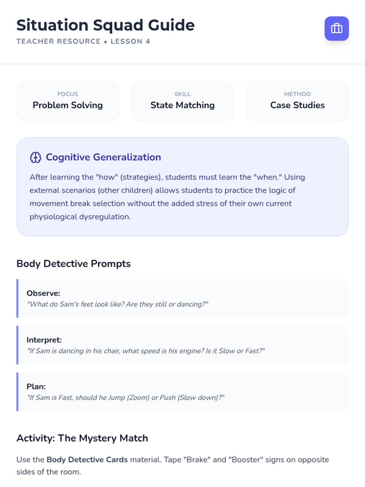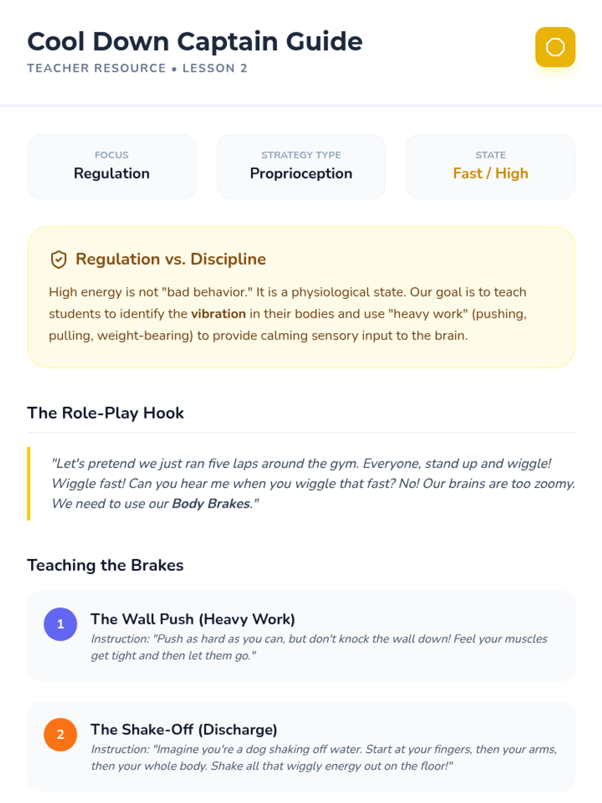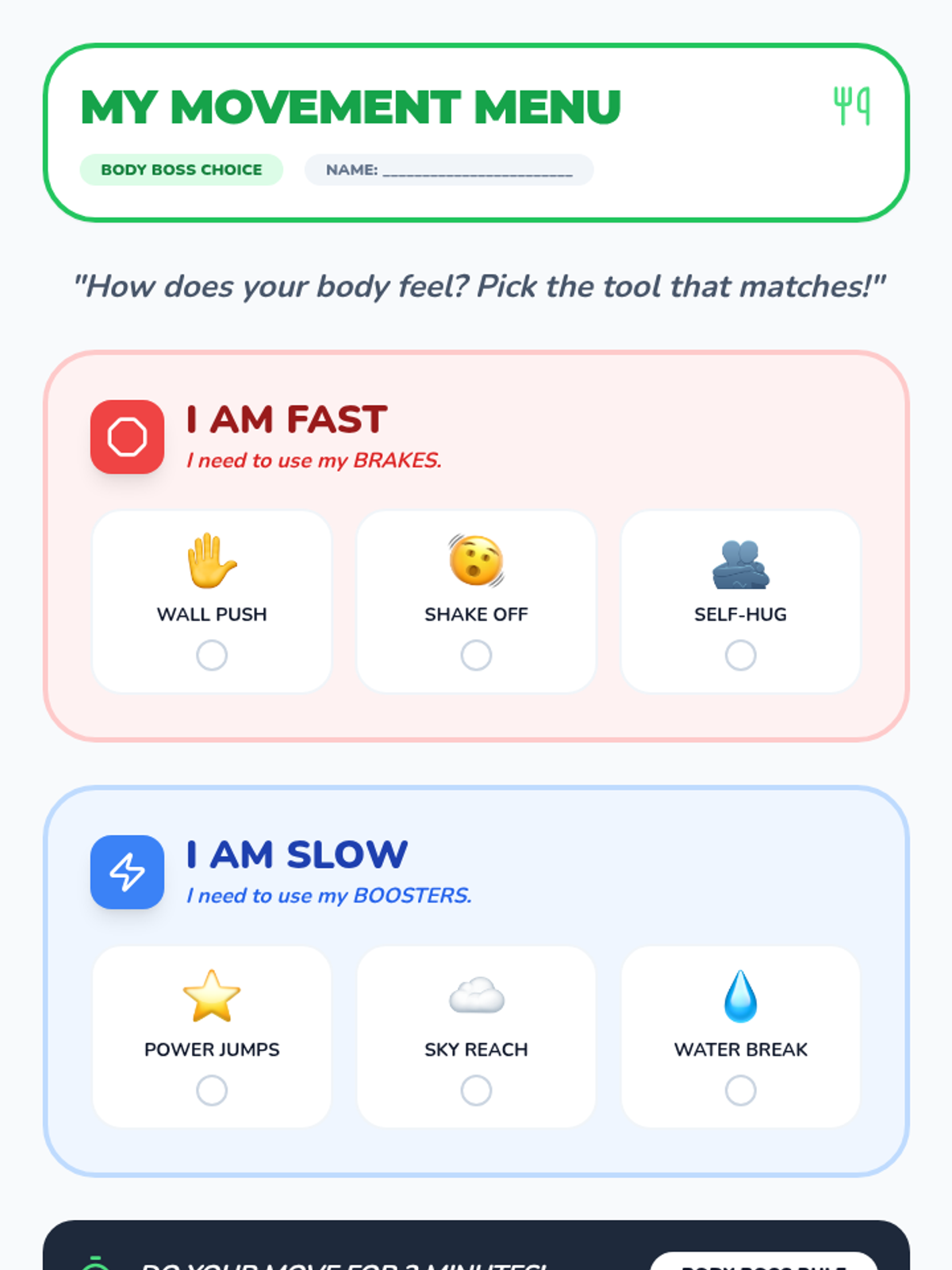 This sequence teaches Kindergarten students to identify their energy levels using a 'Body Battery' metaphor and select appropriate movement breaks. Students progress from teacher-led categorization to independent self-regulation using a menu of movement tools.